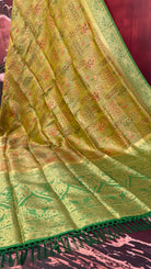 The Chitralekha Tissue Saree draws inspiration from traditional South Indian weaving, known for its elegant tissue silk and zari artistry.