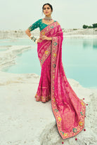Pure Georgette Rani Bandhej Saree With Handwork Moti And Dana Embroidery