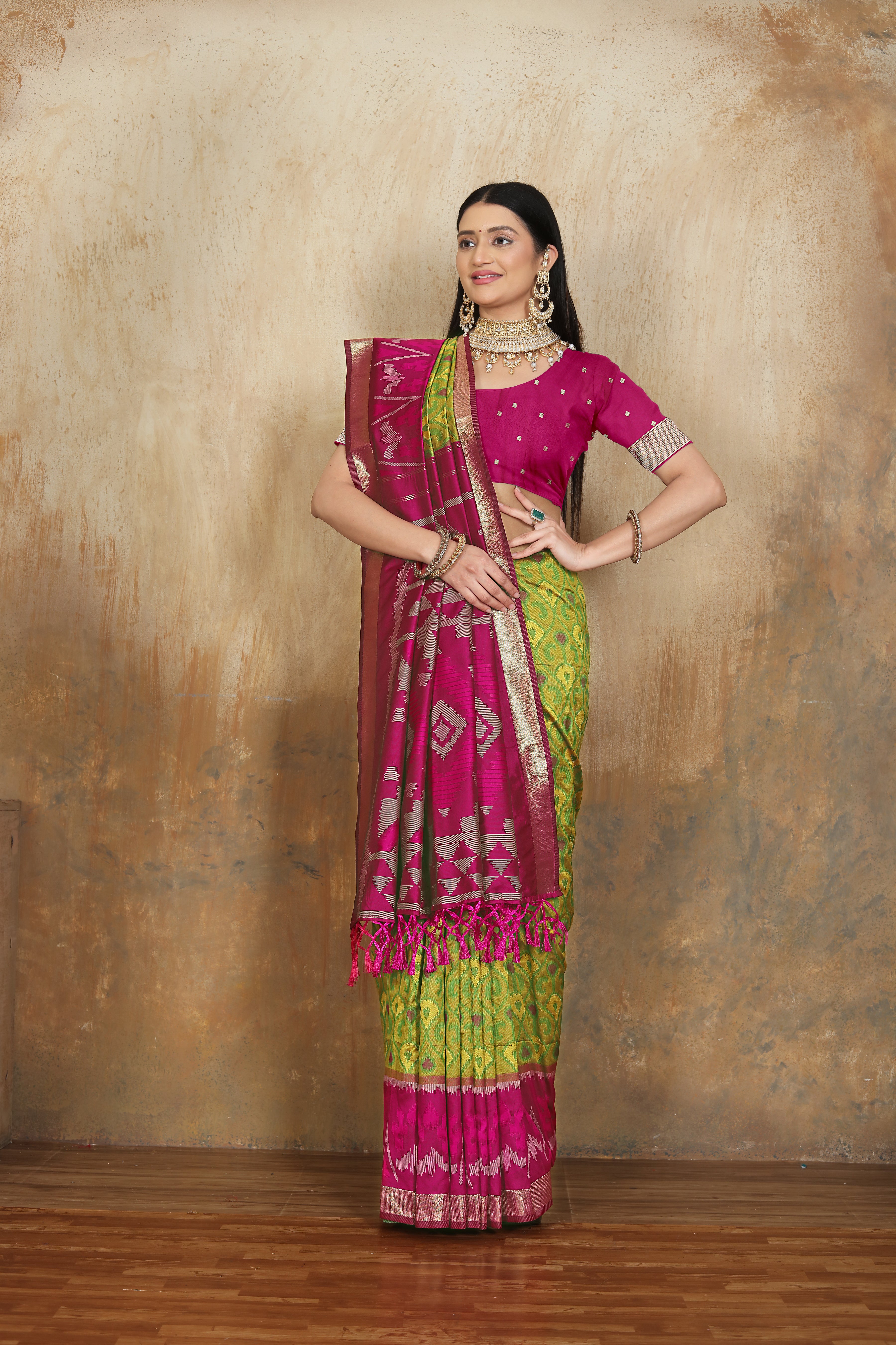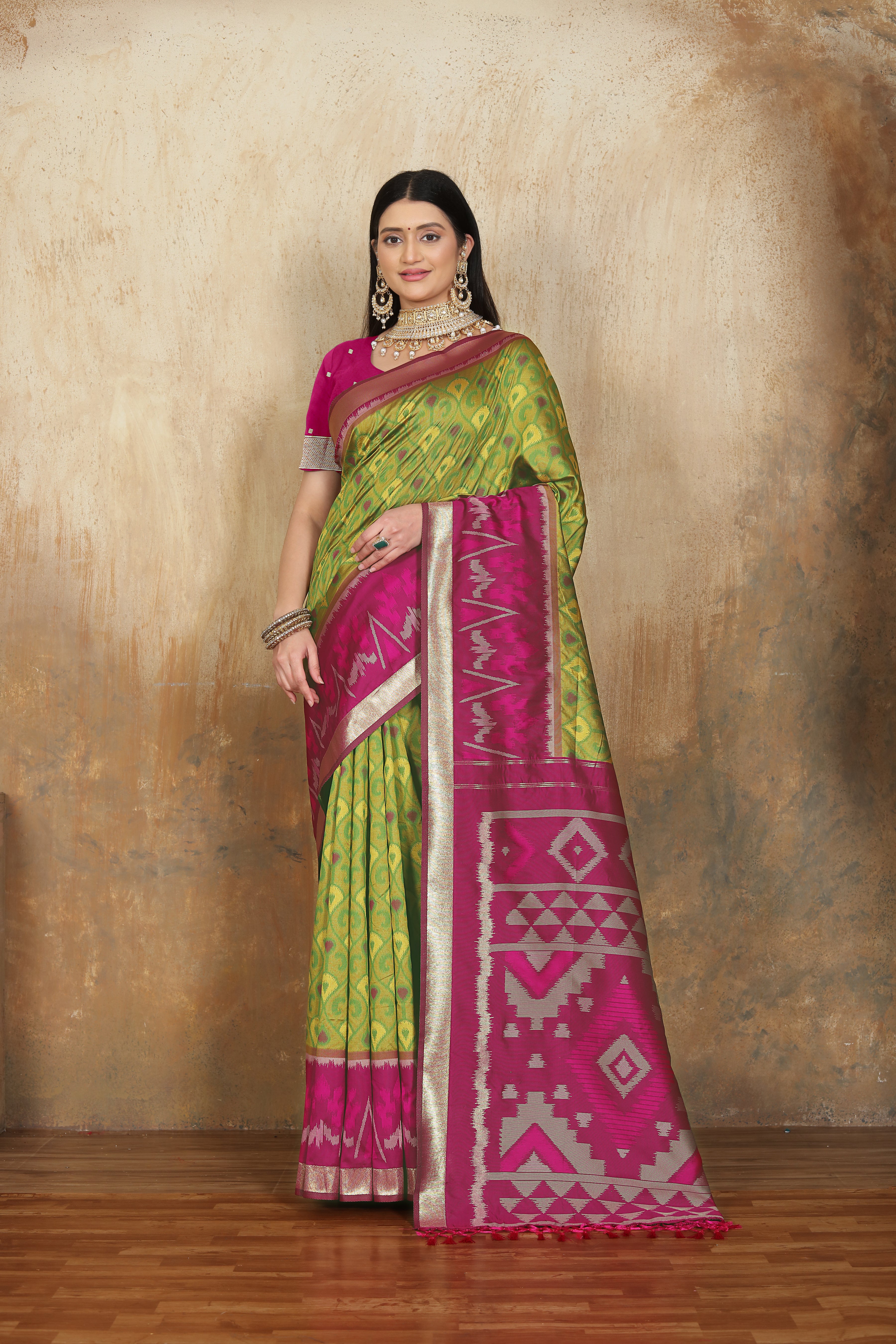 soft silk weaving, patola saree with green mahendi