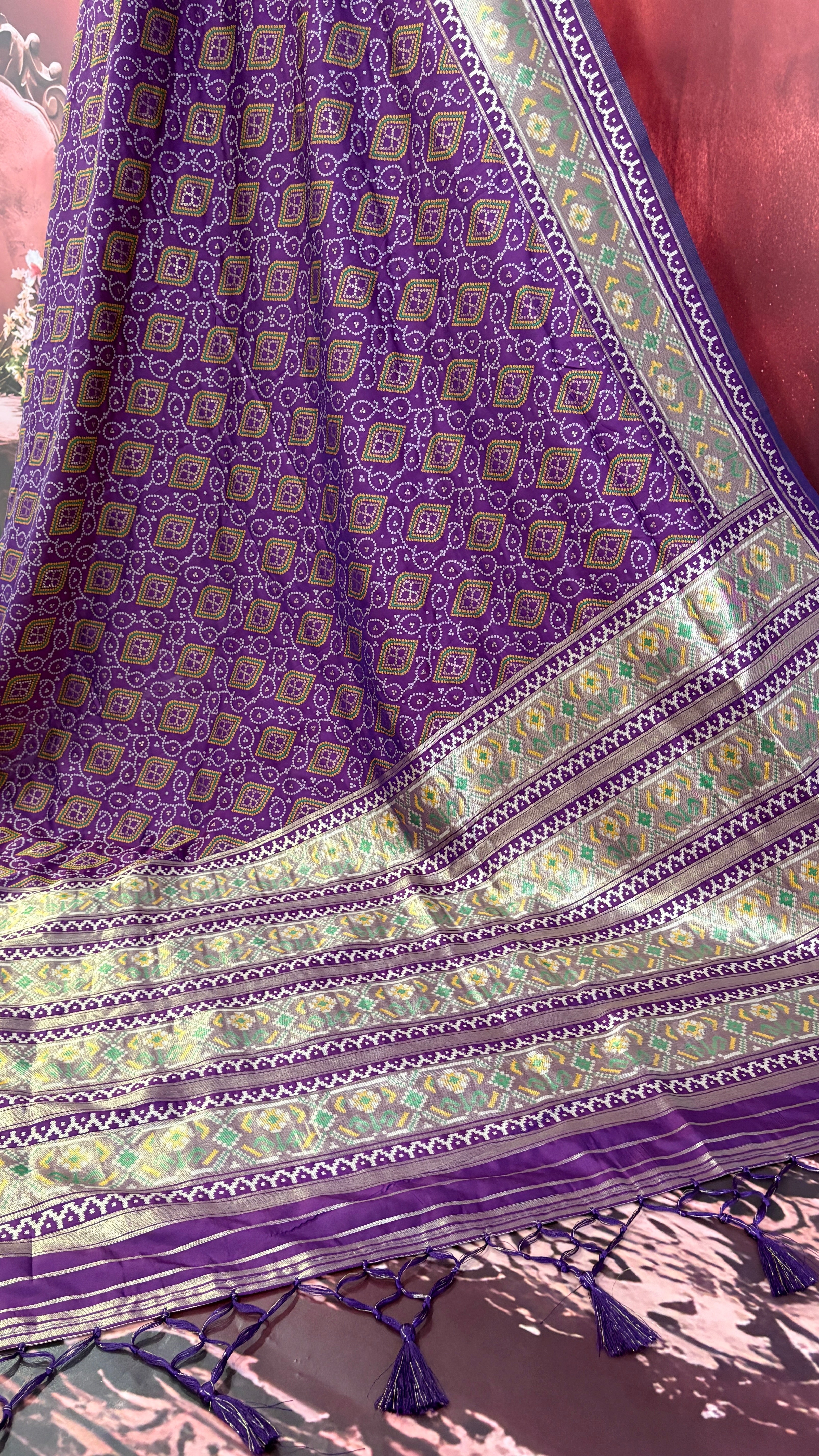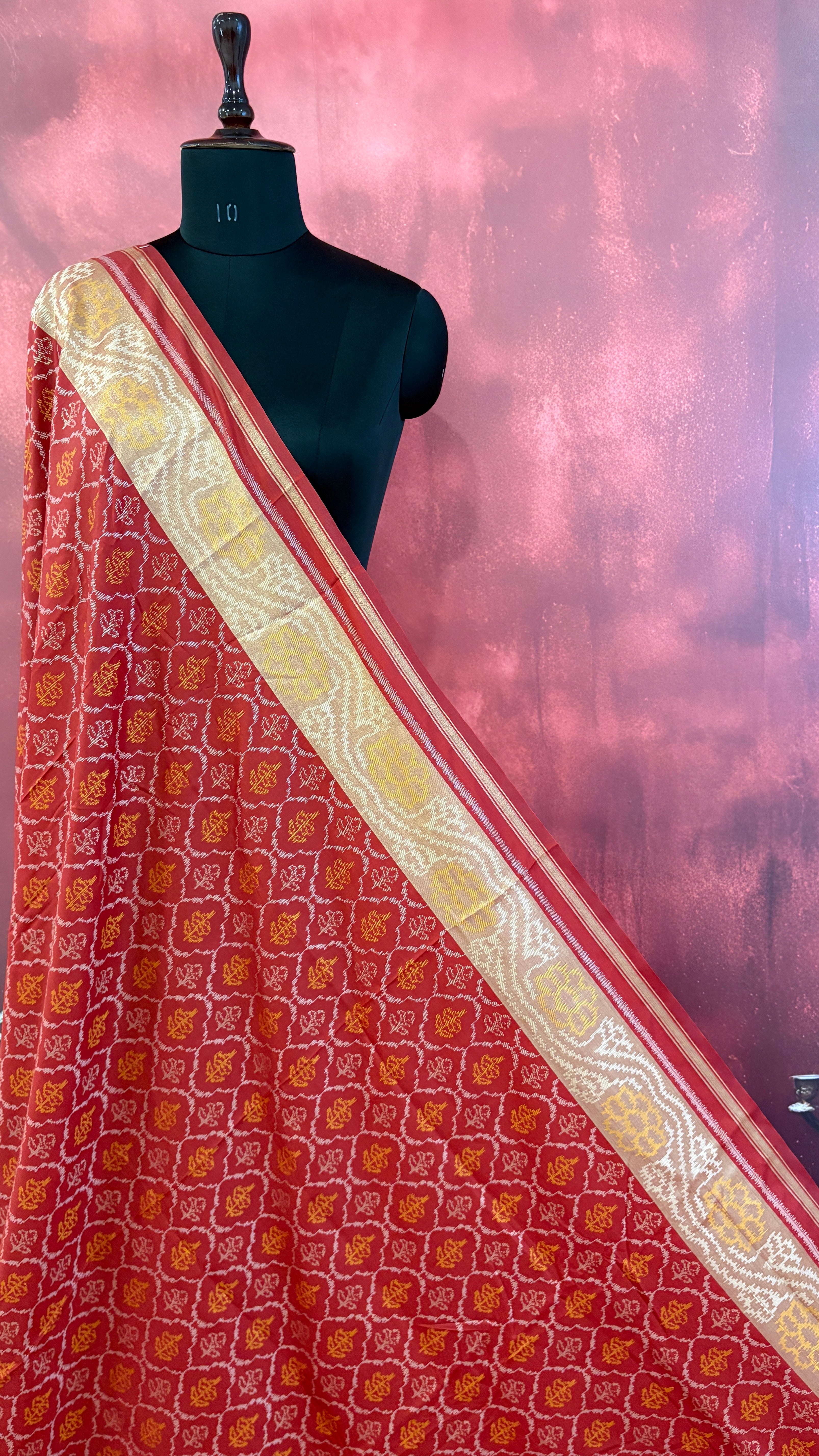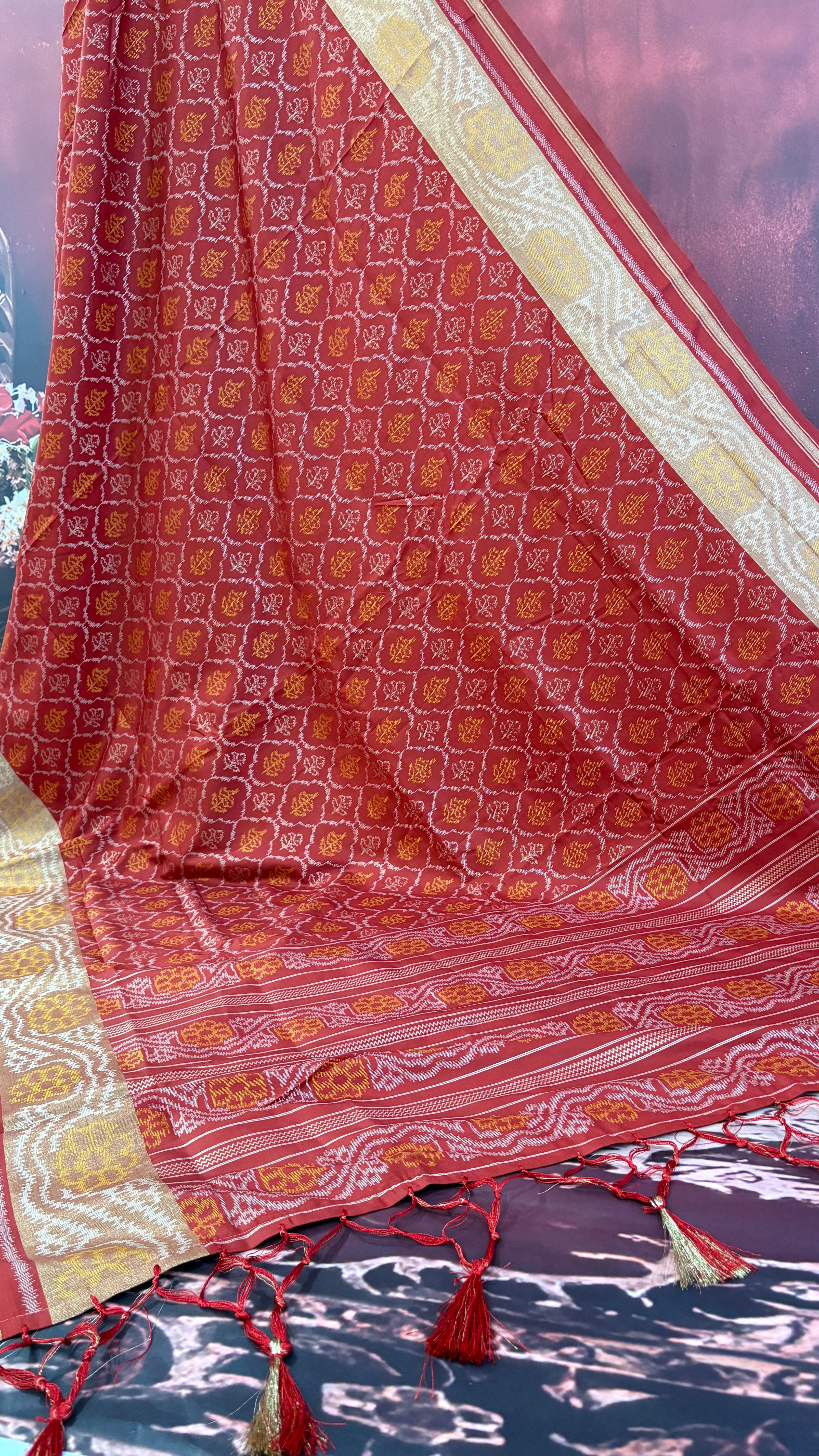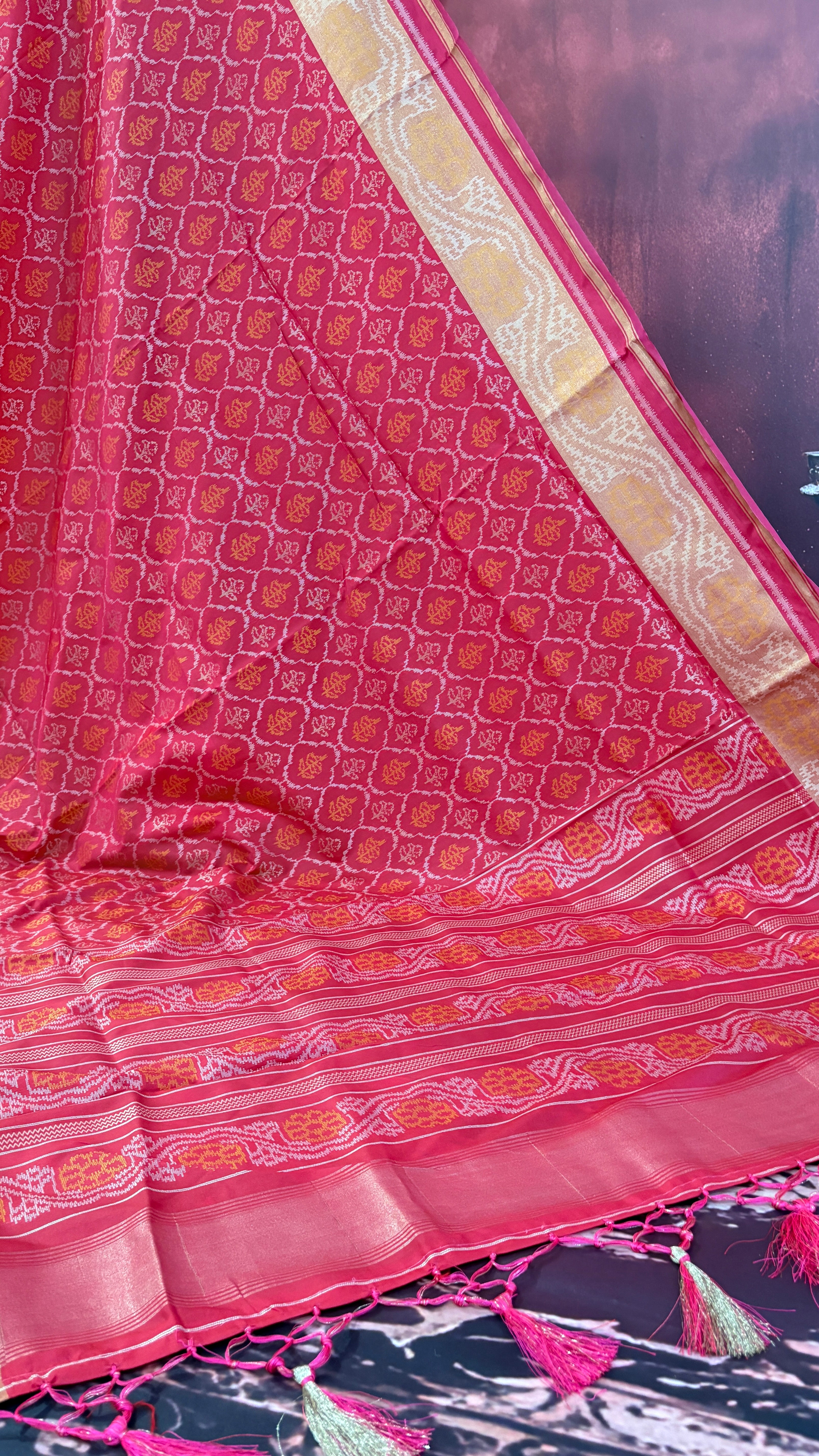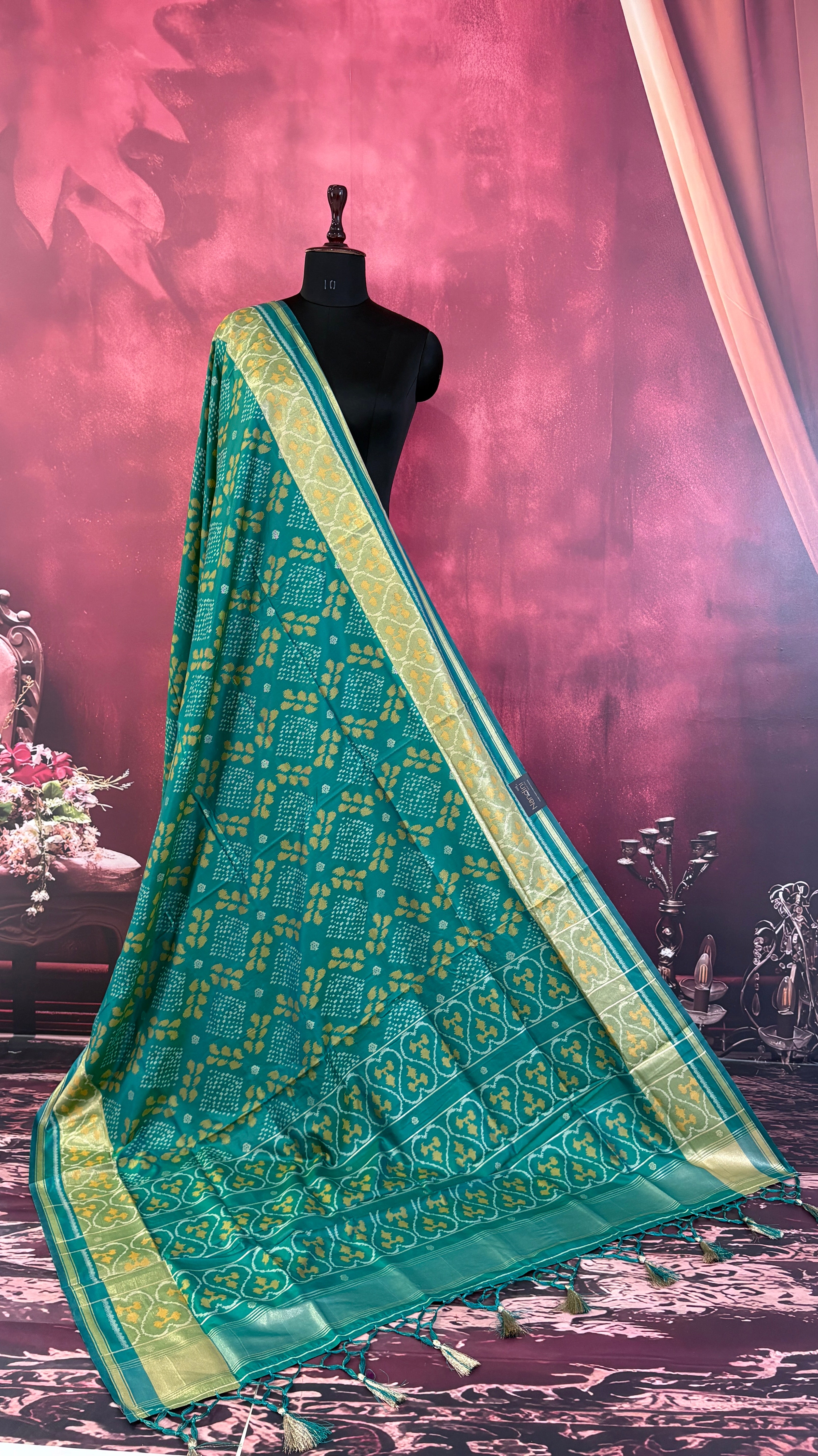 Patola is one of the most prestigious and luxurious handwoven textiles of India, originating from Patan, Gujarat. This exquisite double-ikat weaving technique dates back to the 11th century, once reserved for royalty and aristocrats. Known as the “Queen of Silks,” Patola is admired for its geometric precision, rich colors, and motifs symbolizing prosperity, fertility, and spirituality. What makes Patola unique is the double ikat method – both the warp and weft threads are dyed with exacting precision before weaving, creating identical patterns on both sides of the fabric. This mastery requires months of labor, making each Patola saree a priceless heirloom.