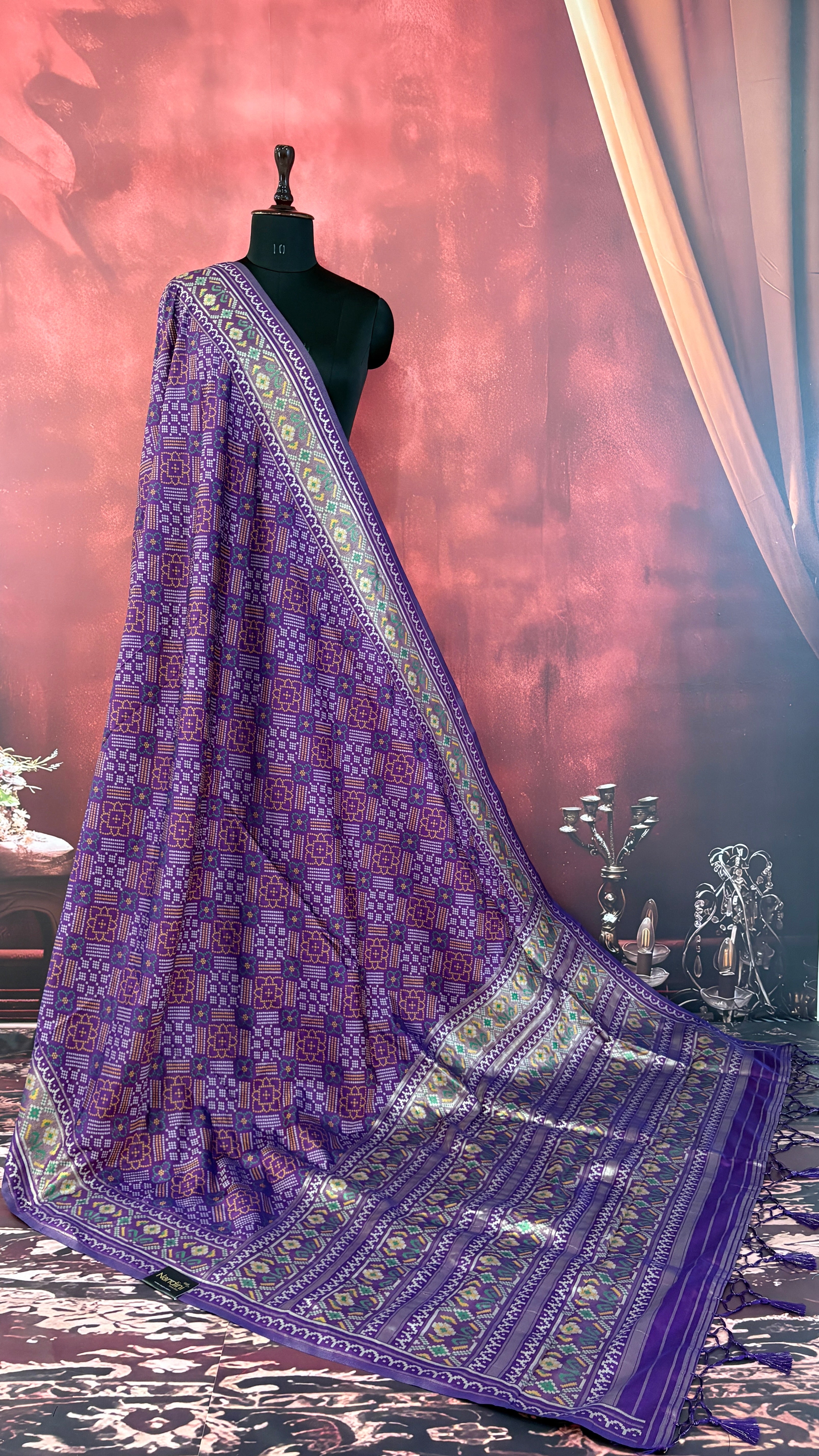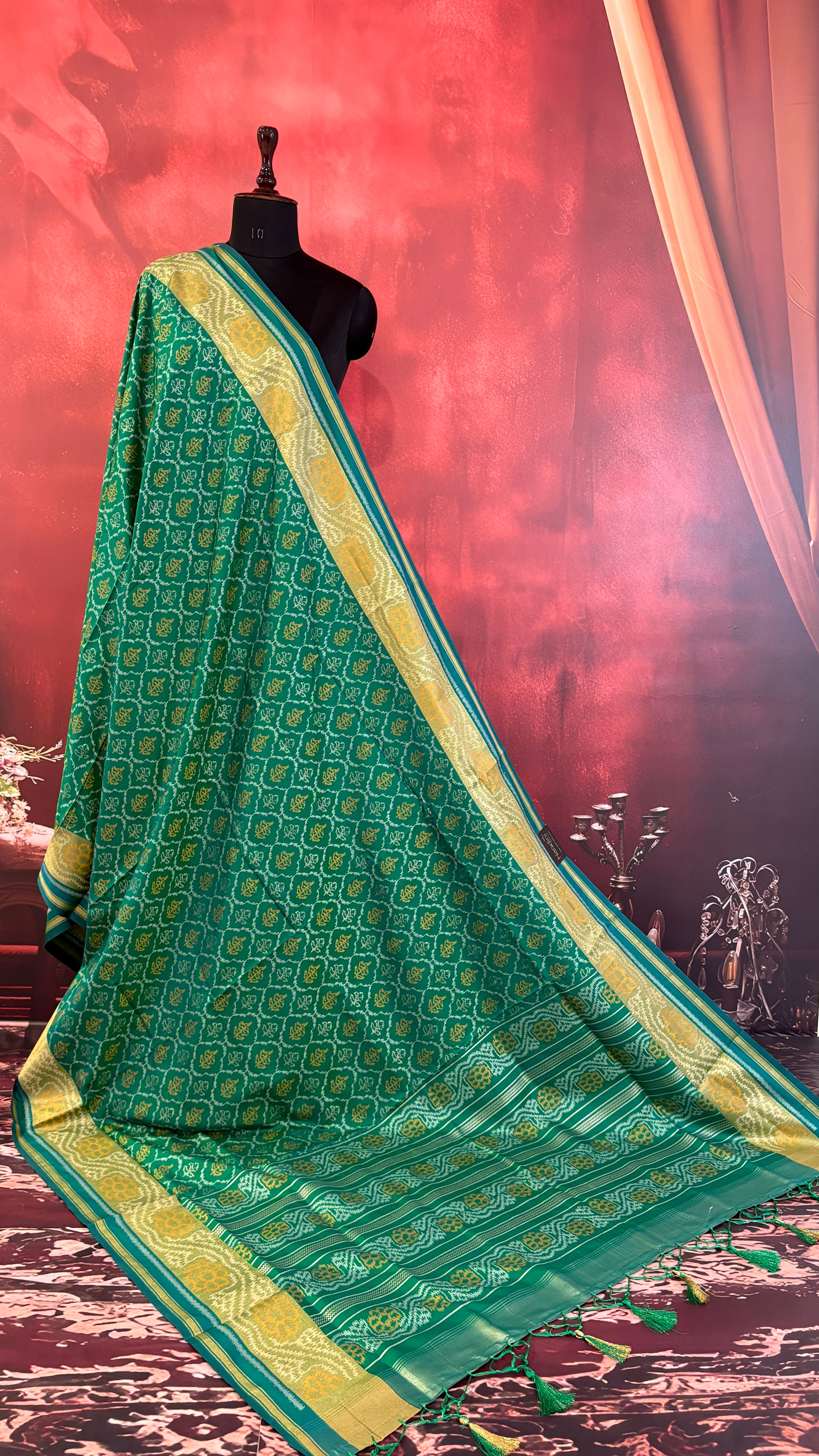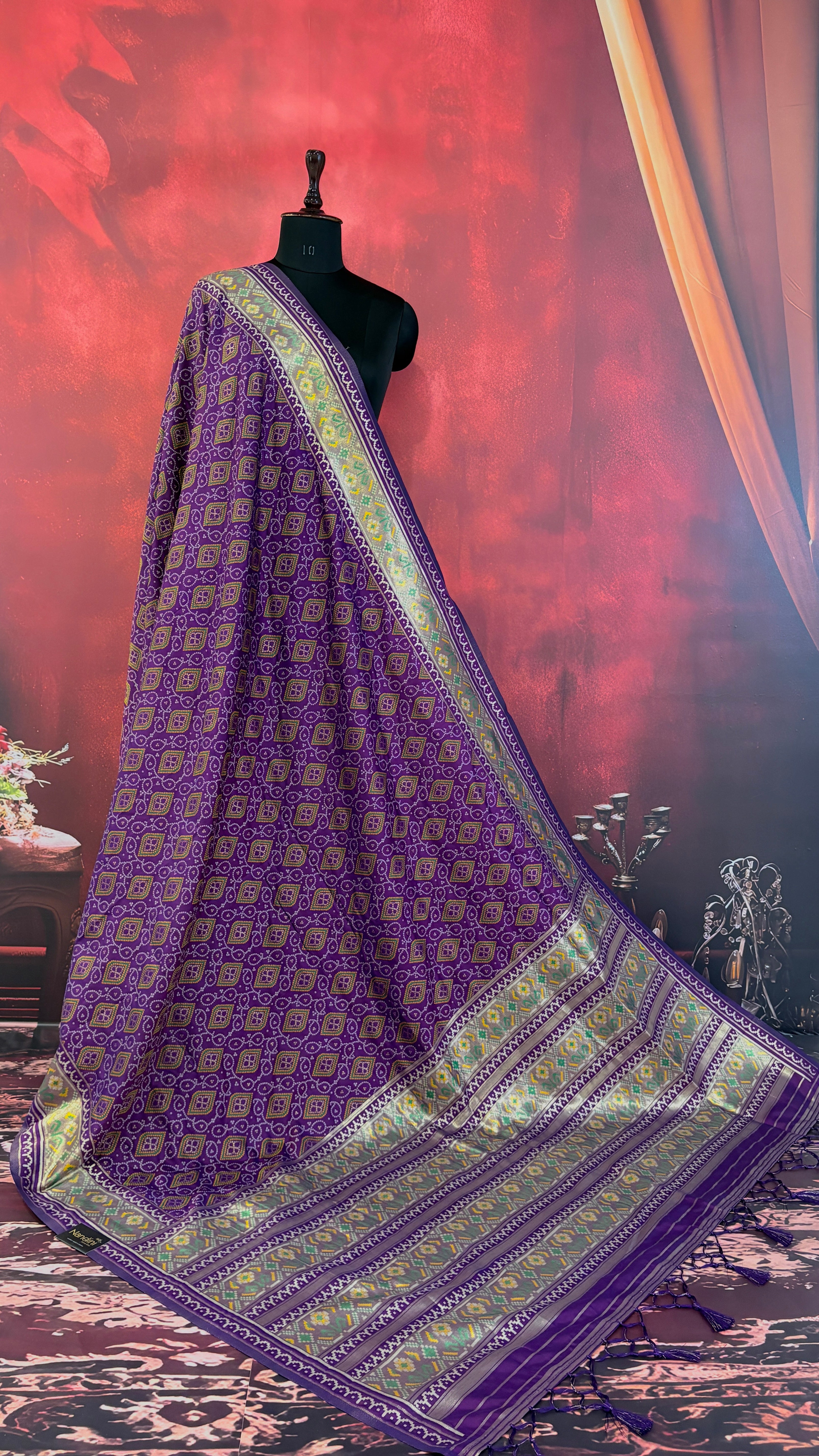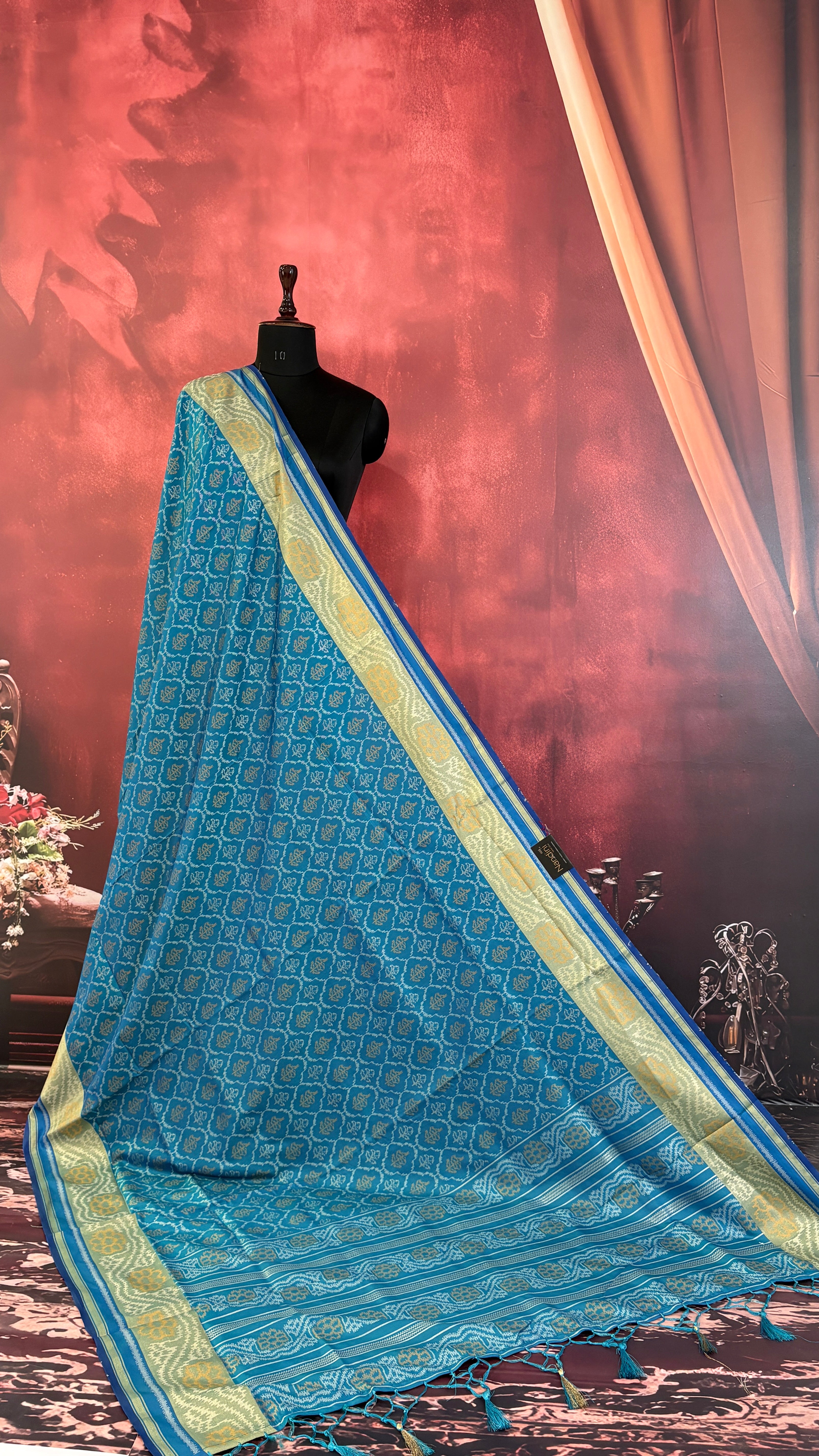 Patola is one of the most prestigious and luxurious handwoven textiles of India, originating from Patan, Gujarat. This exquisite double-ikat weaving technique dates back to the 11th century, once reserved for royalty and aristocrats. Known as the “Queen of Silks,” Patola is admired for its geometric precision, rich colors, and motifs symbolizing prosperity, fertility, and spirituality. What makes Patola unique is the double ikat method – both the warp and weft threads are dyed with exacting precision before weaving, creating identical patterns on both sides of the fabric. This mastery requires months of labor, making each Patola saree a priceless heirloom.
