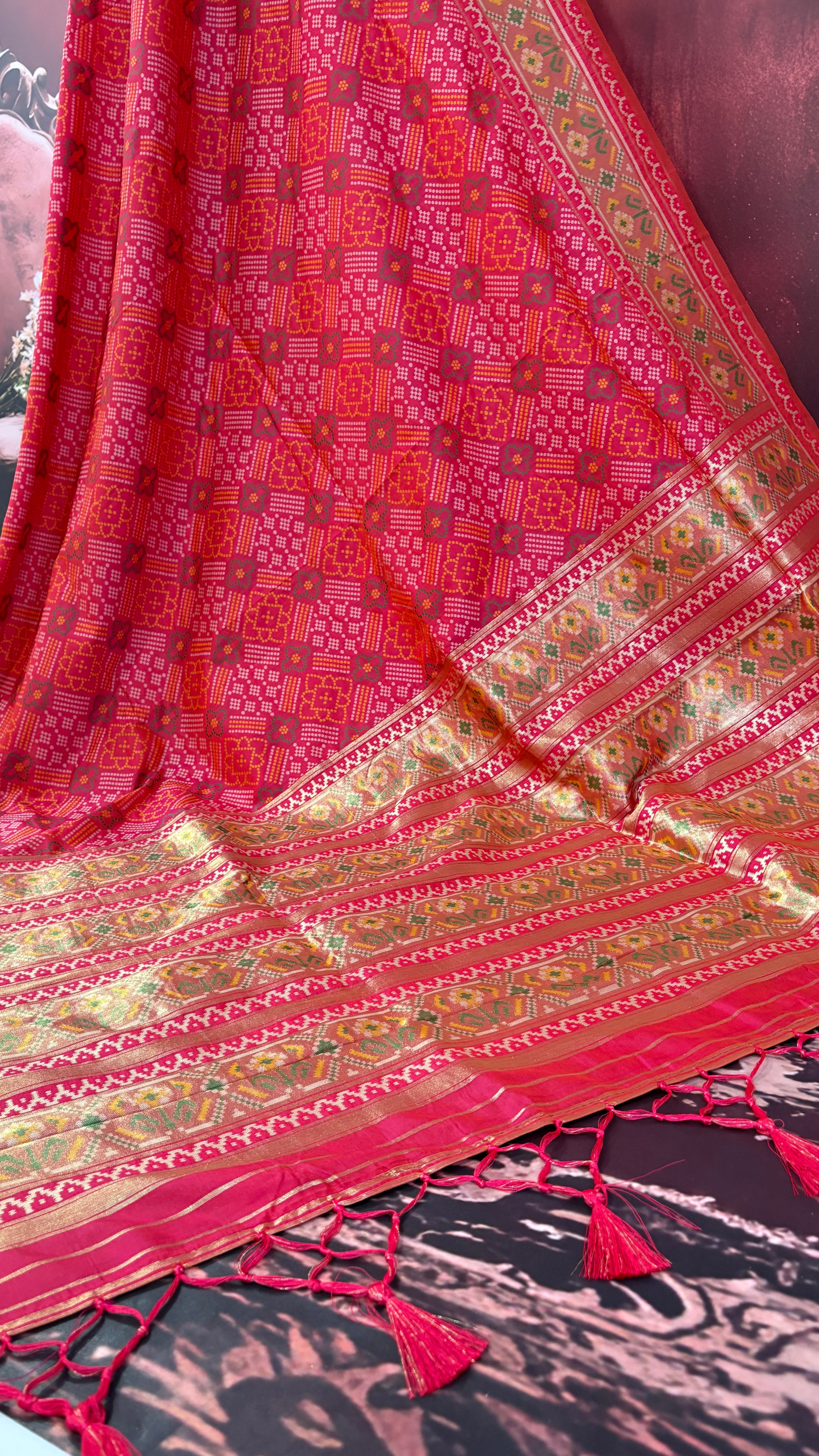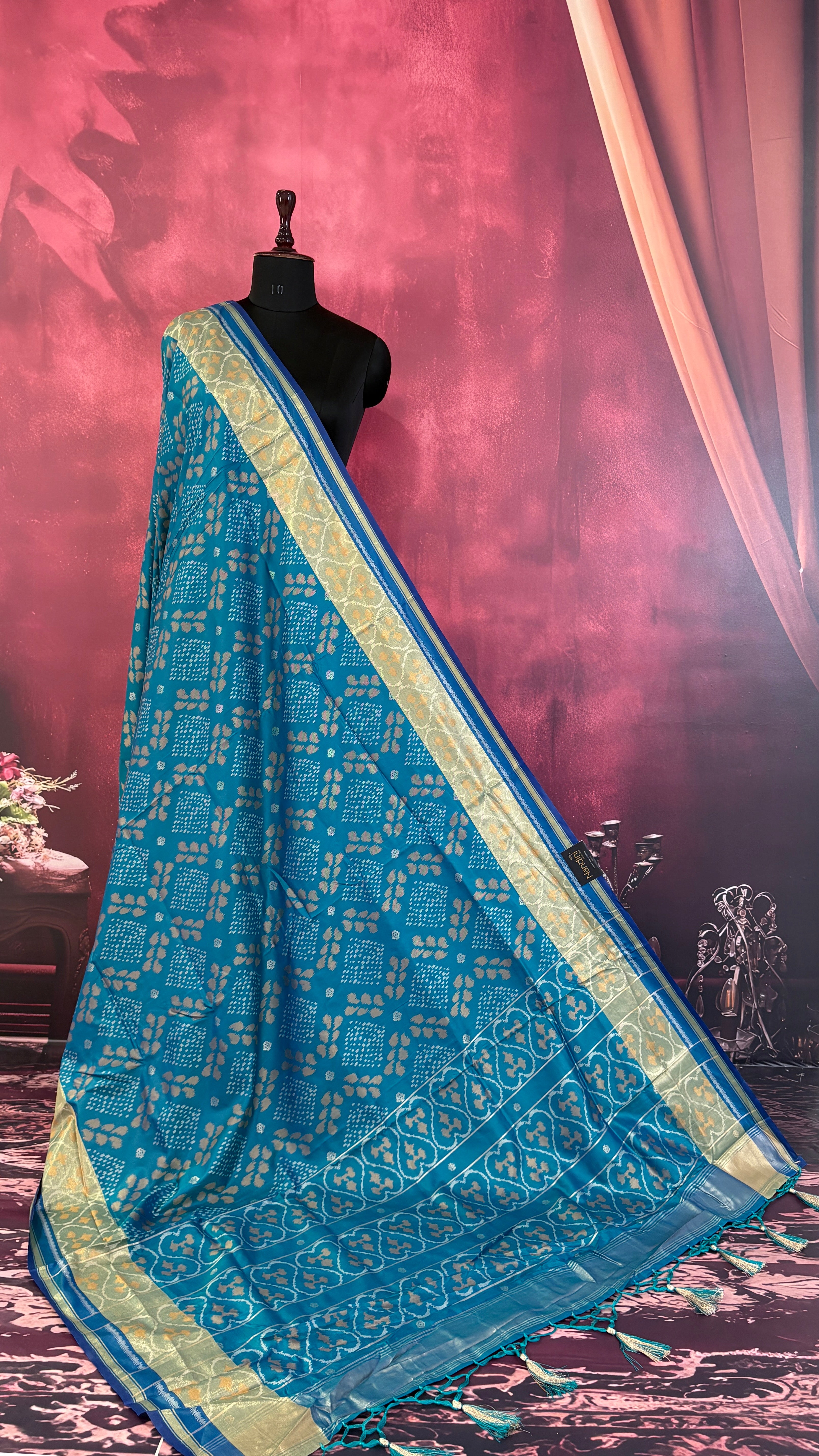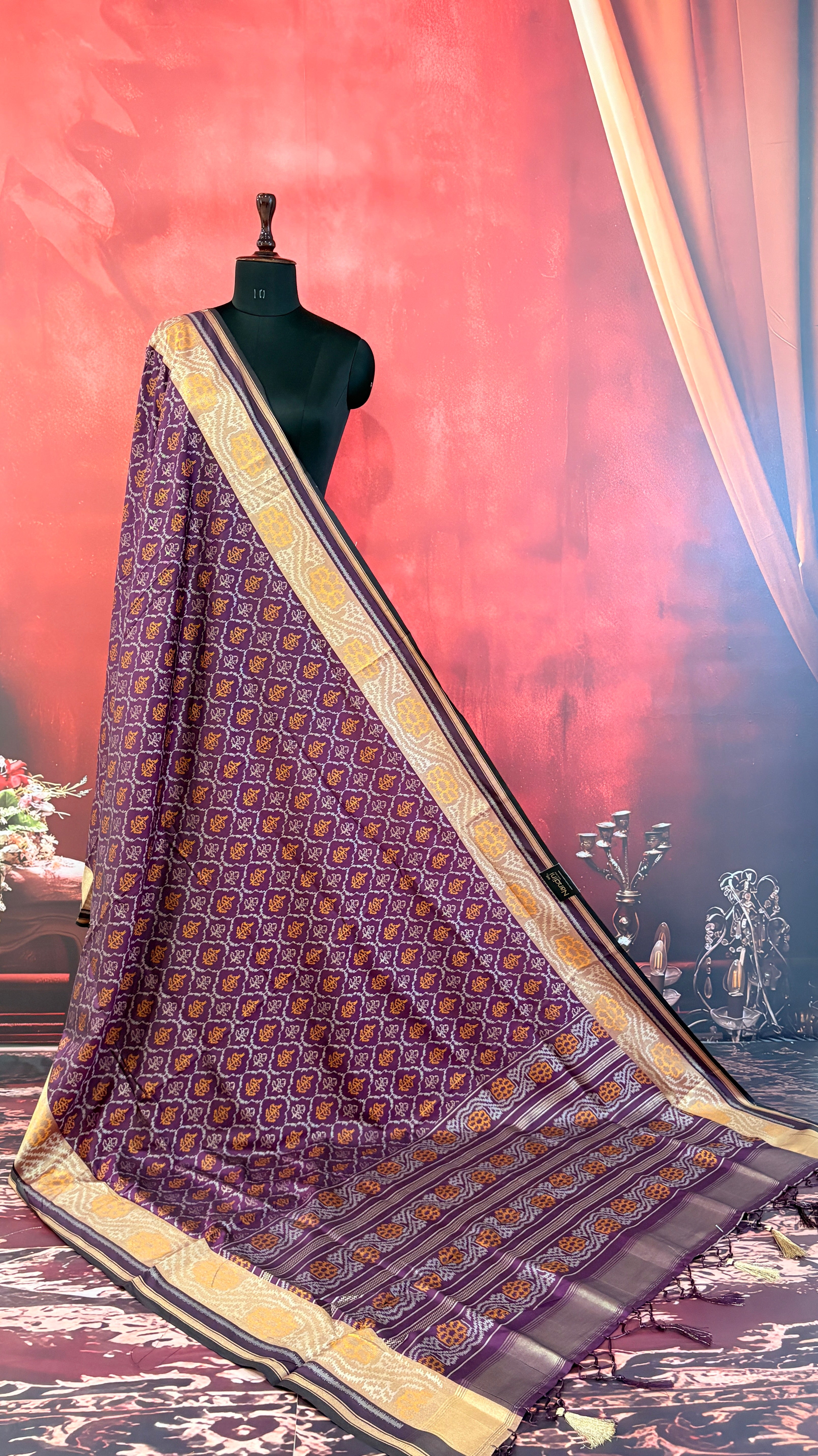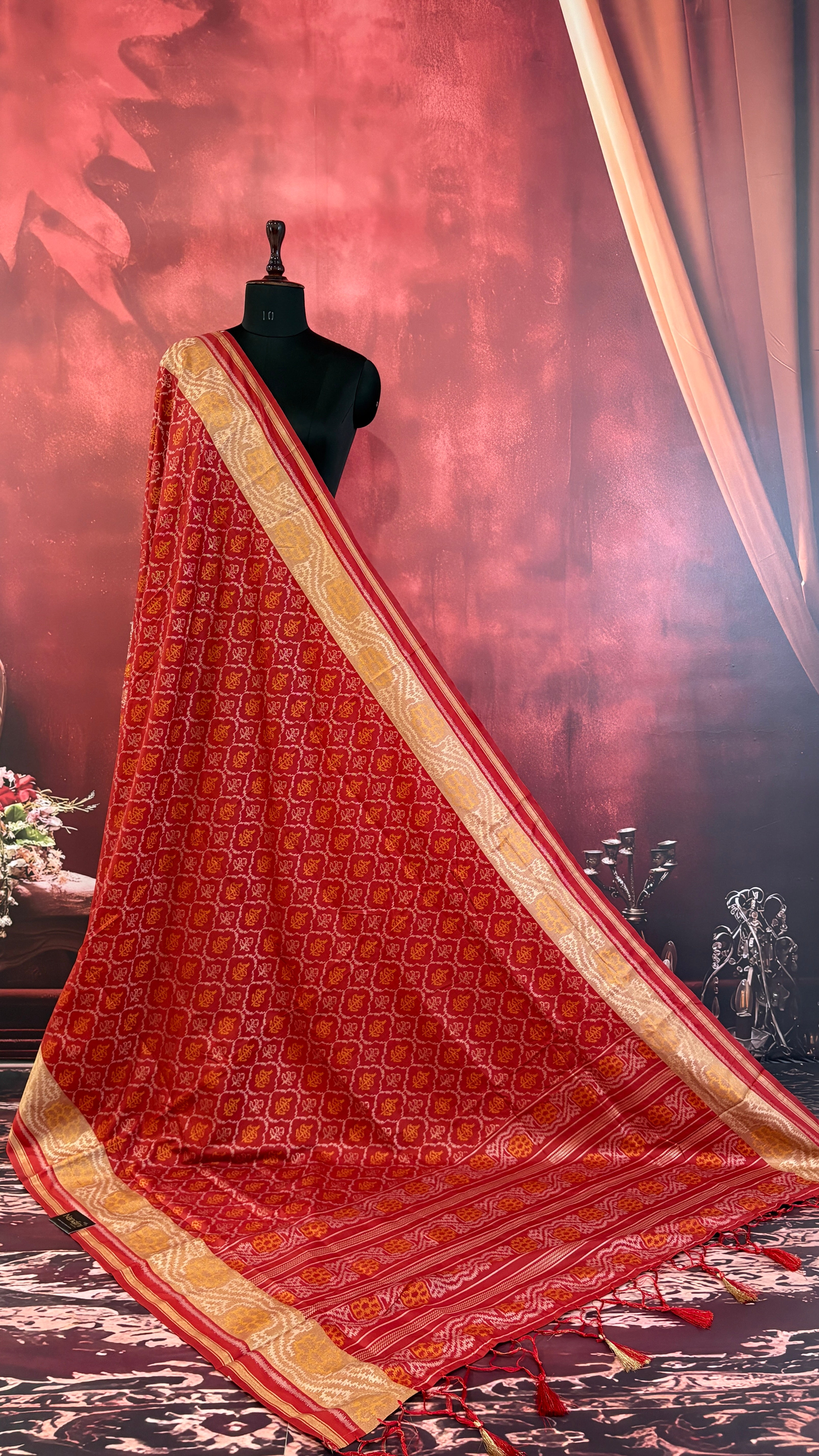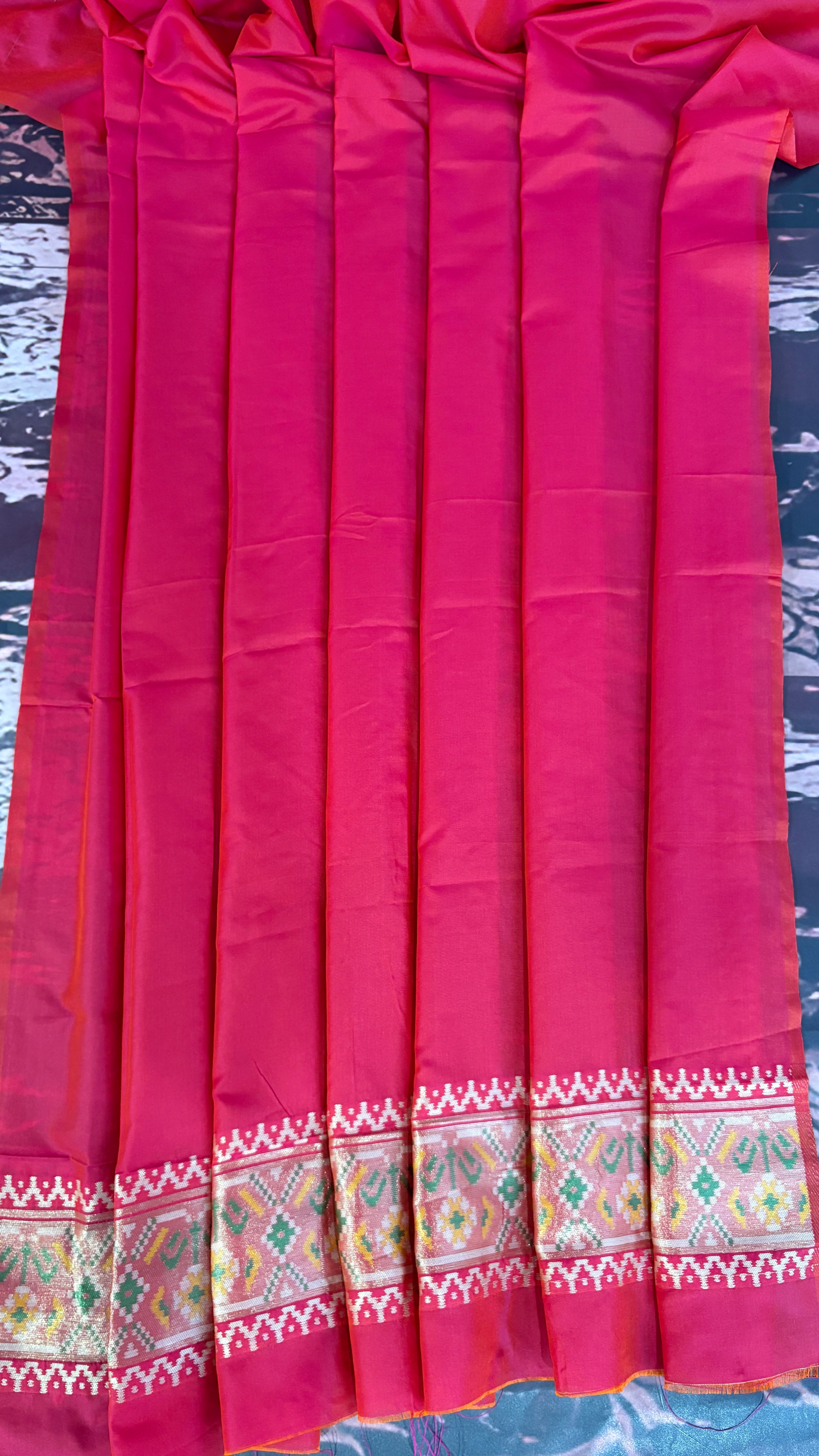 Patola is one of the most prestigious and luxurious handwoven textiles of India, originating from Patan, Gujarat. This exquisite double-ikat weaving technique dates back to the 11th century, once reserved for royalty and aristocrats. Known as the “Queen of Silks,” Patola is admired for its geometric precision, rich colors, and motifs symbolizing prosperity, fertility, and spirituality. What makes Patola unique is the double ikat method – both the warp and weft threads are dyed with exacting precision before weaving, creating identical patterns on both sides of the fabric. This mastery requires months of labor, making each Patola saree a priceless heirloom.