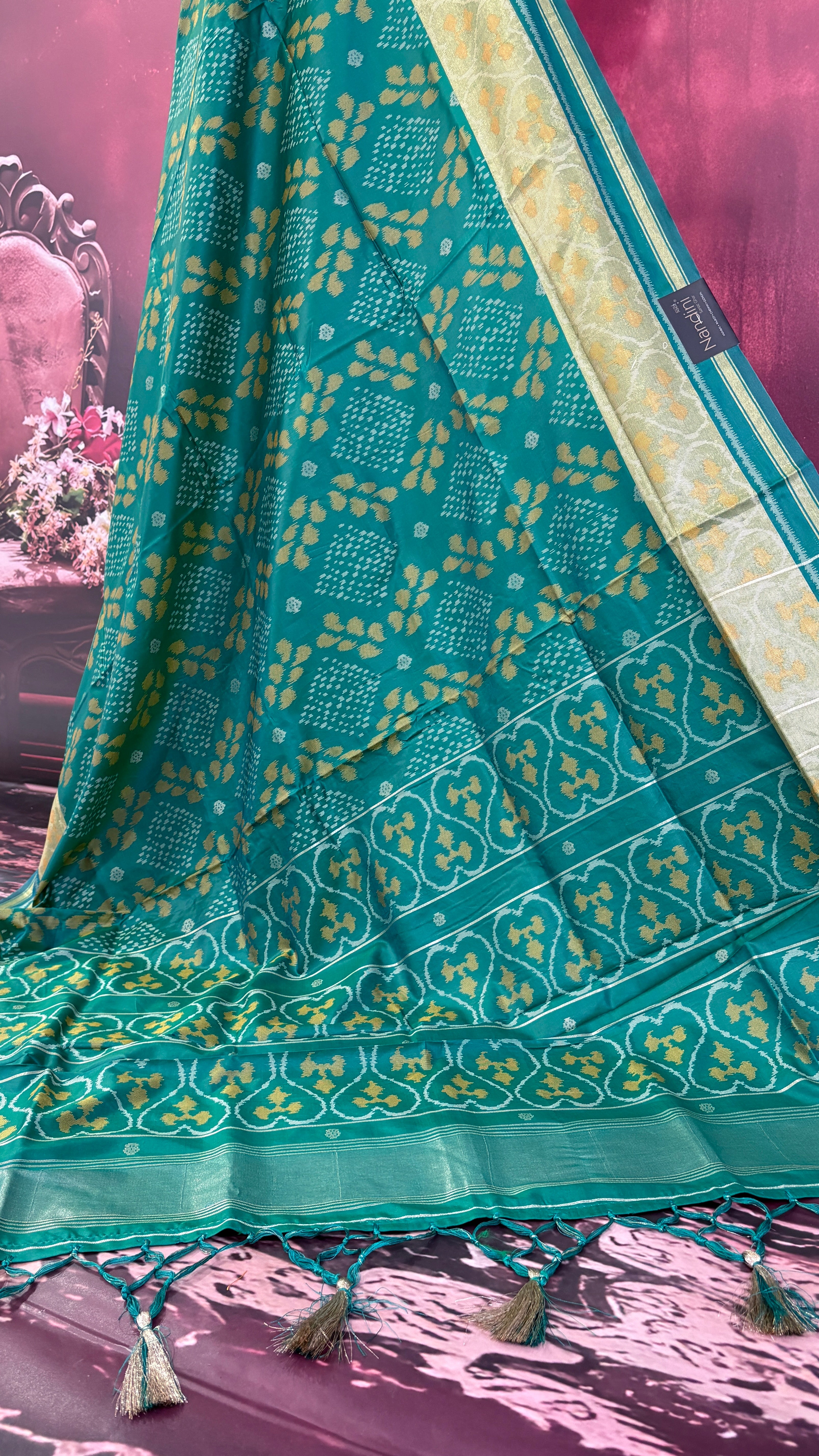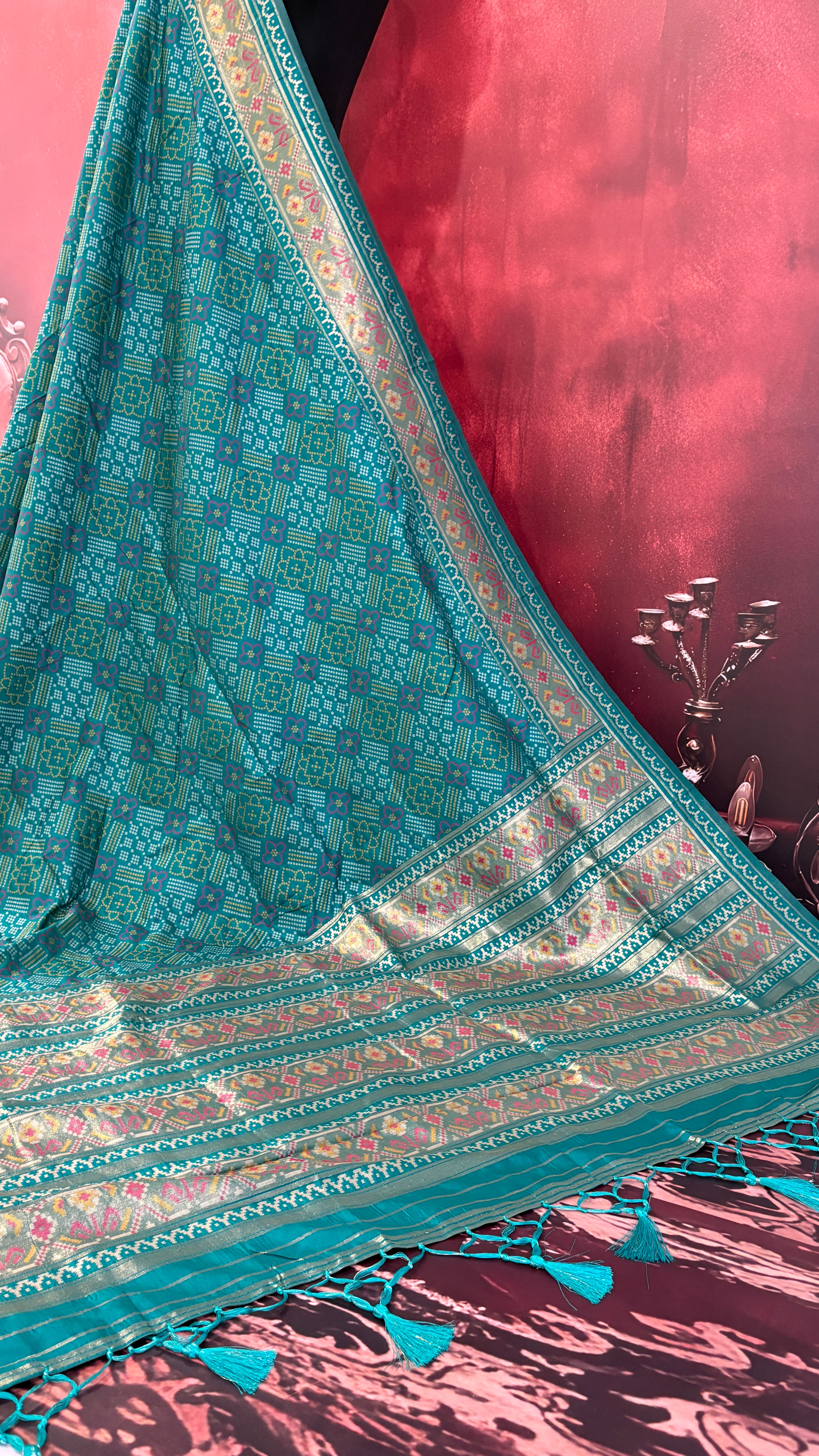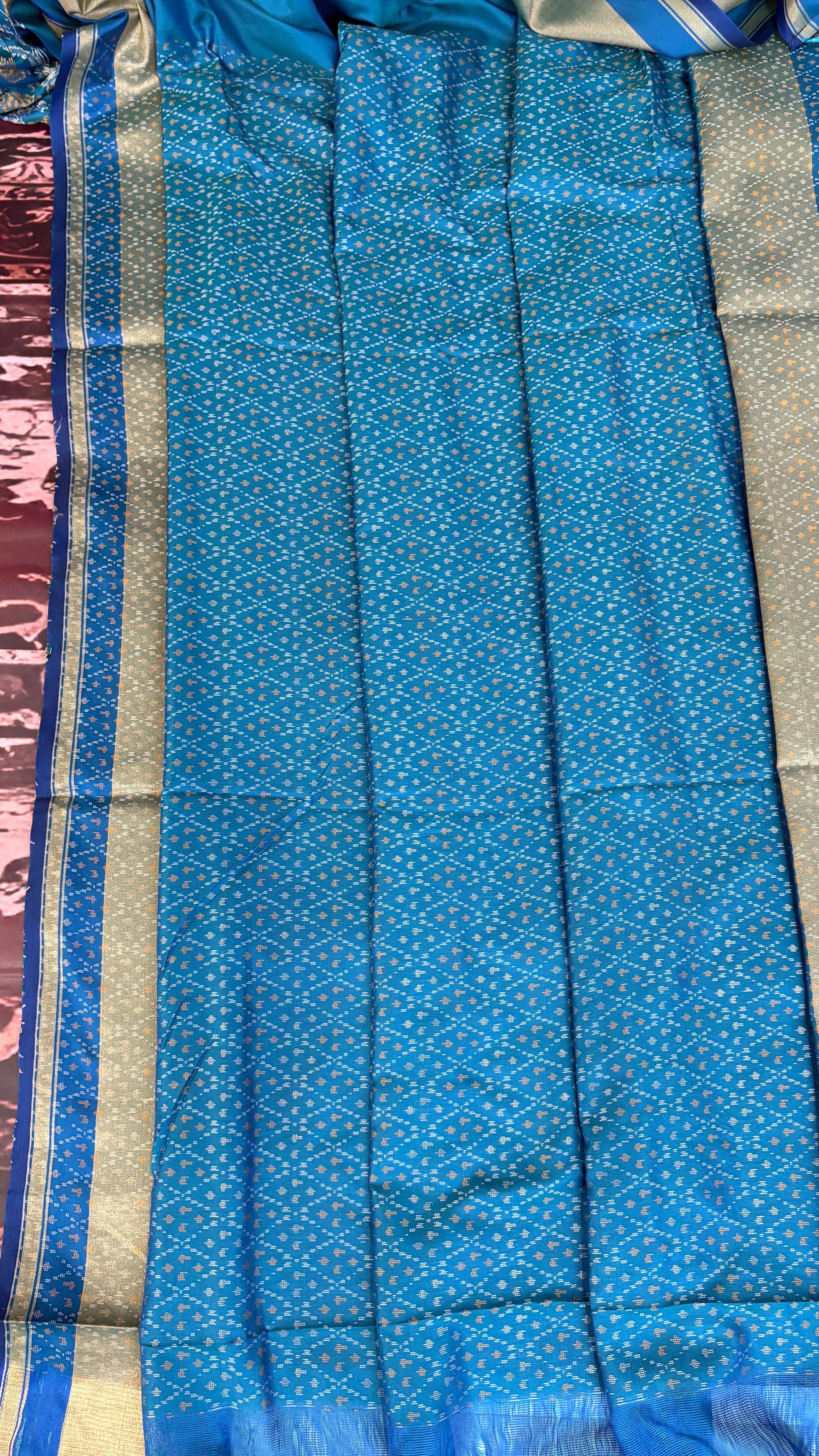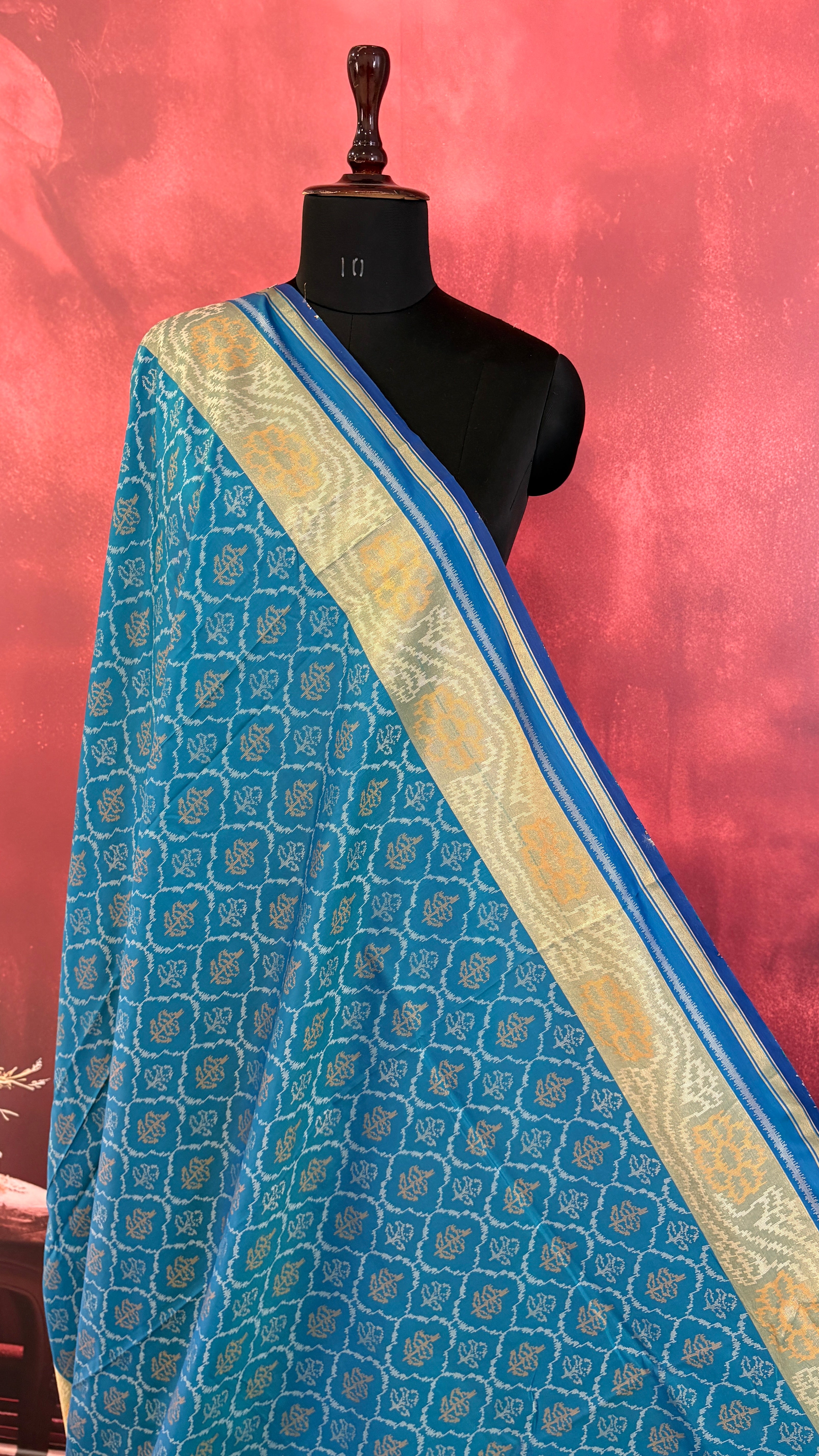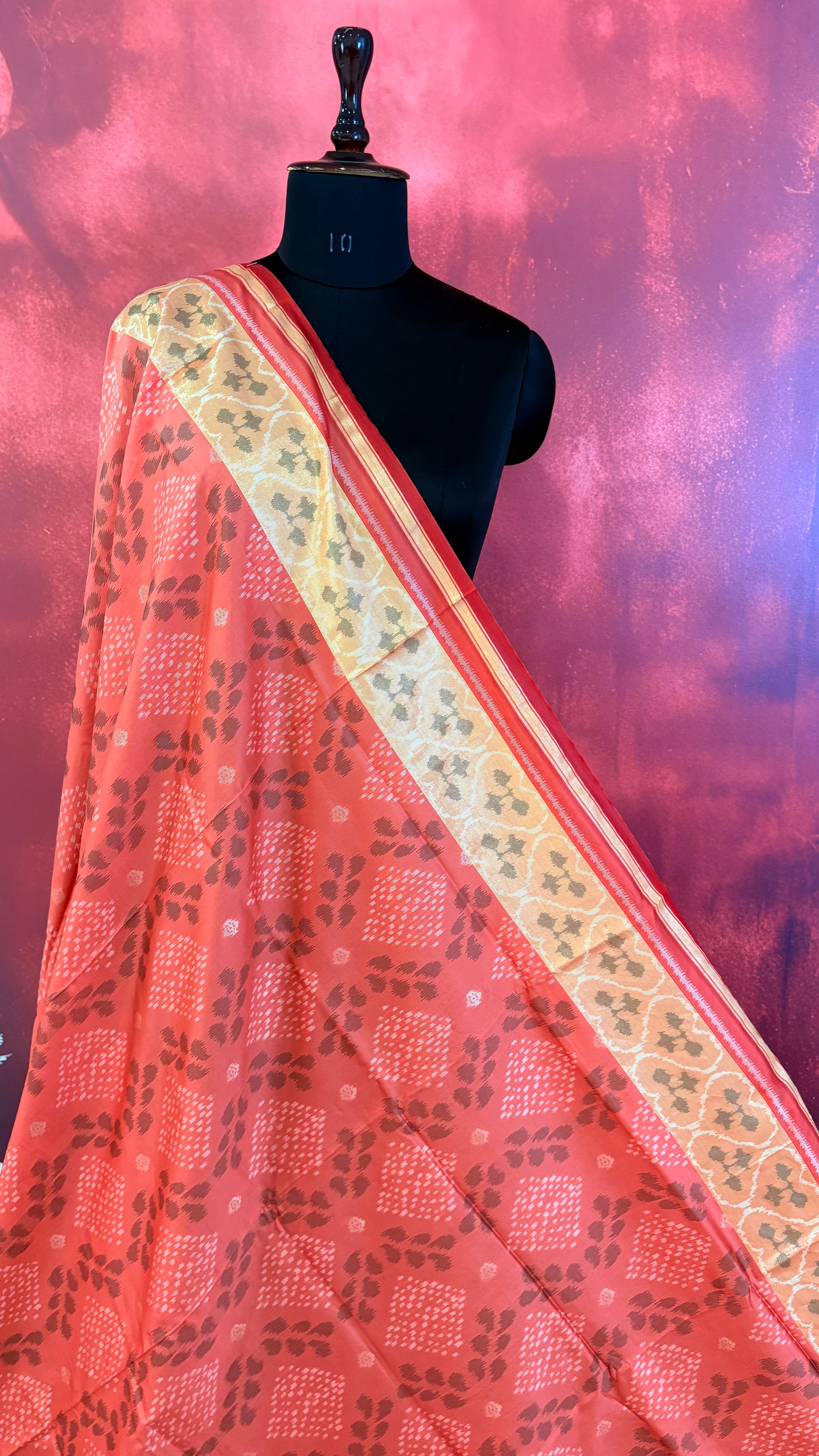 Patola is one of the most prestigious and luxurious handwoven textiles of India, originating from Patan, Gujarat. This exquisite double-ikat weaving technique dates back to the 11th century, once reserved for royalty and aristocrats. Known as the “Queen of Silks,” Patola is admired for its geometric precision, rich colors, and motifs symbolizing prosperity, fertility, and spirituality. What makes Patola unique is the double ikat method – both the warp and weft threads are dyed with exacting precision before weaving, creating identical patterns on both sides of the fabric. This mastery requires months of labor, making each Patola saree a priceless heirloom.