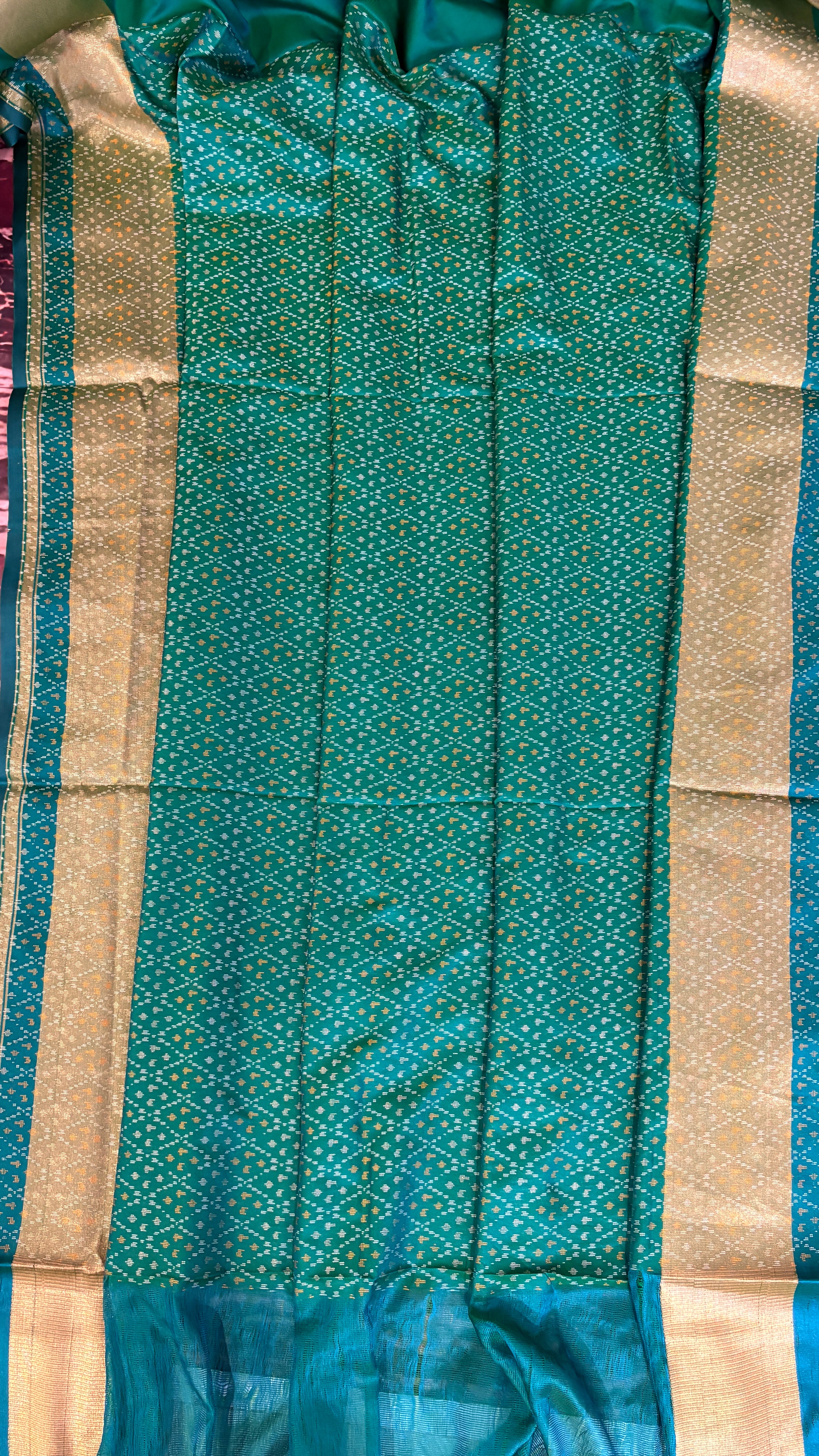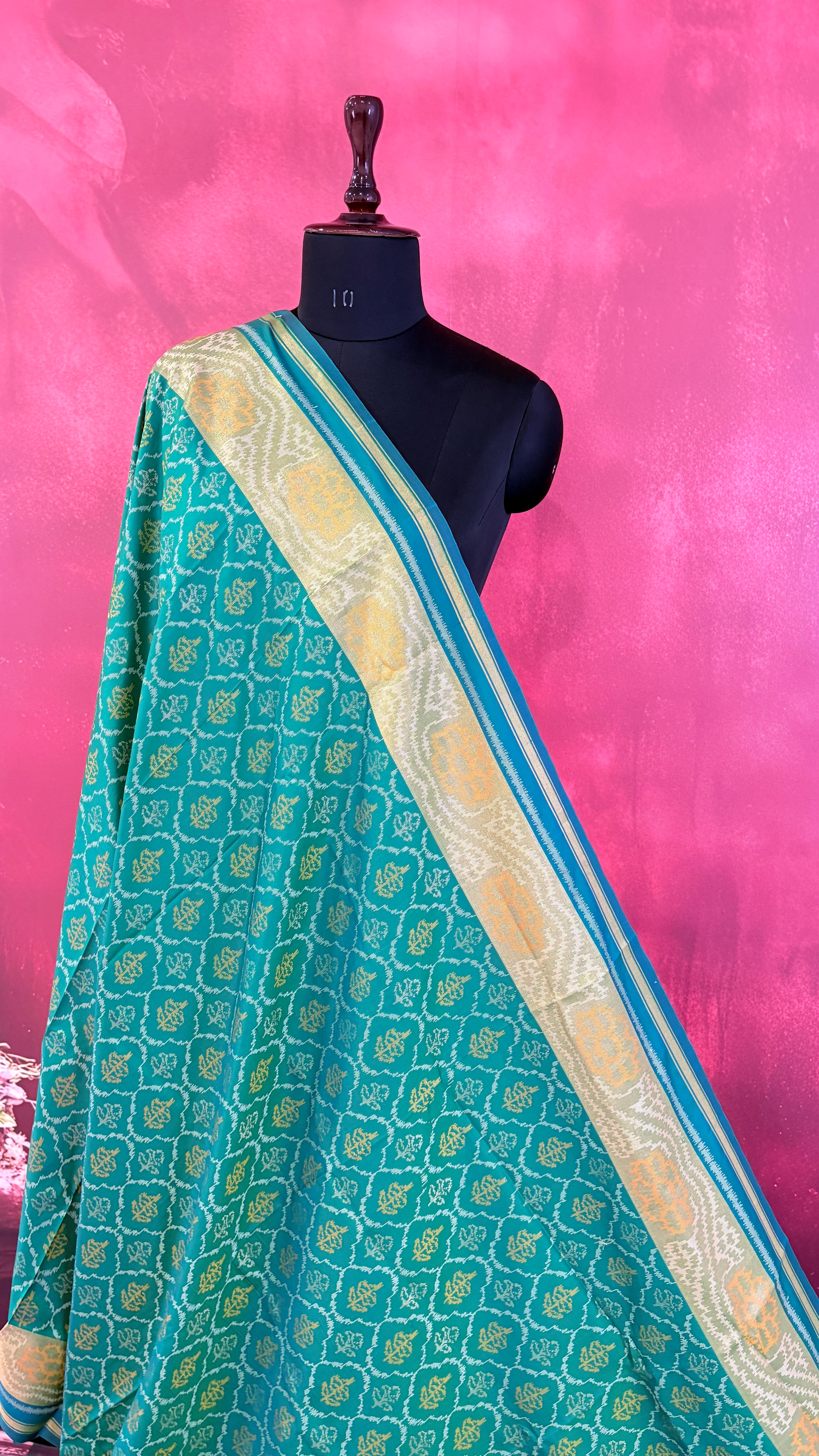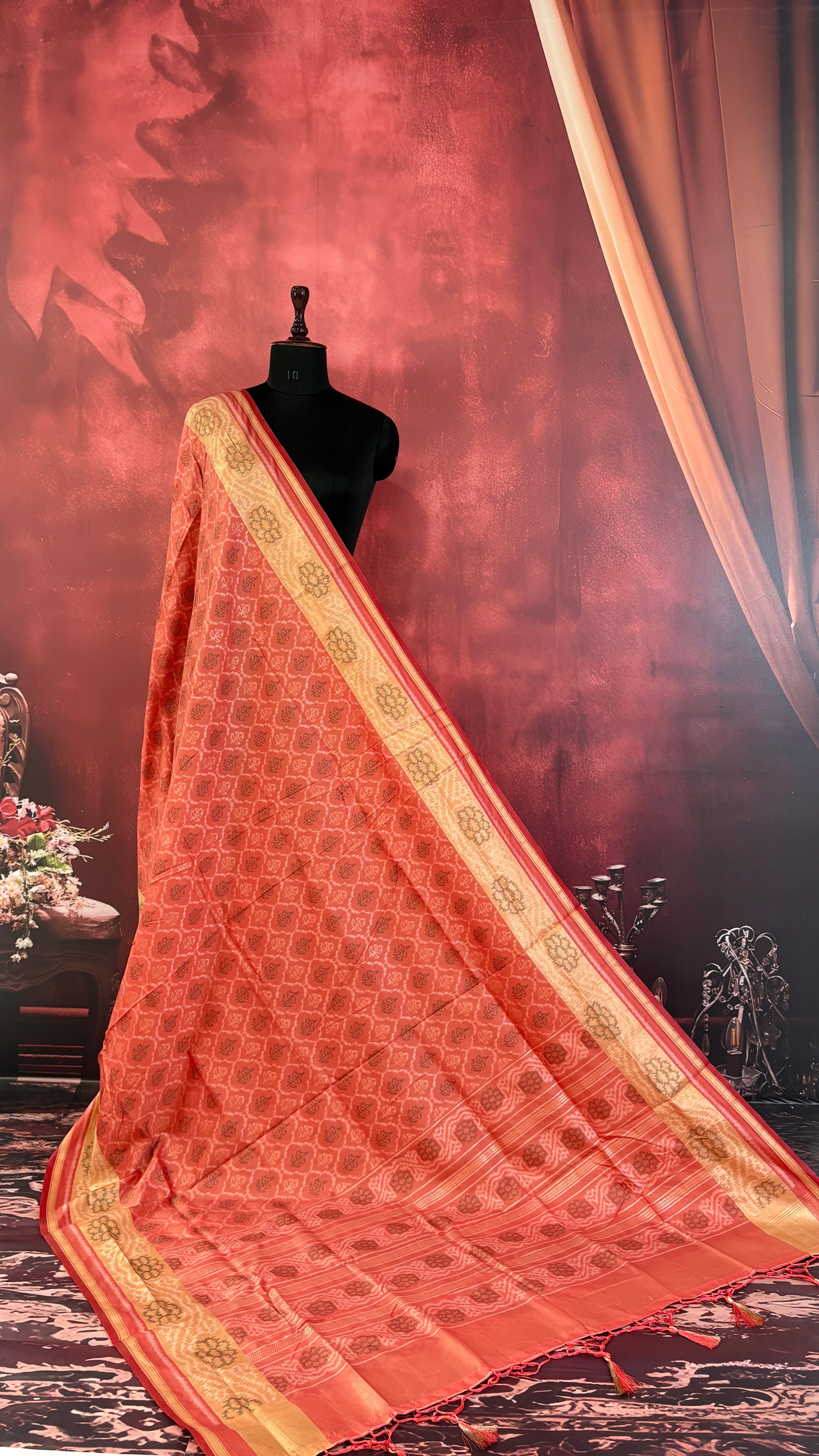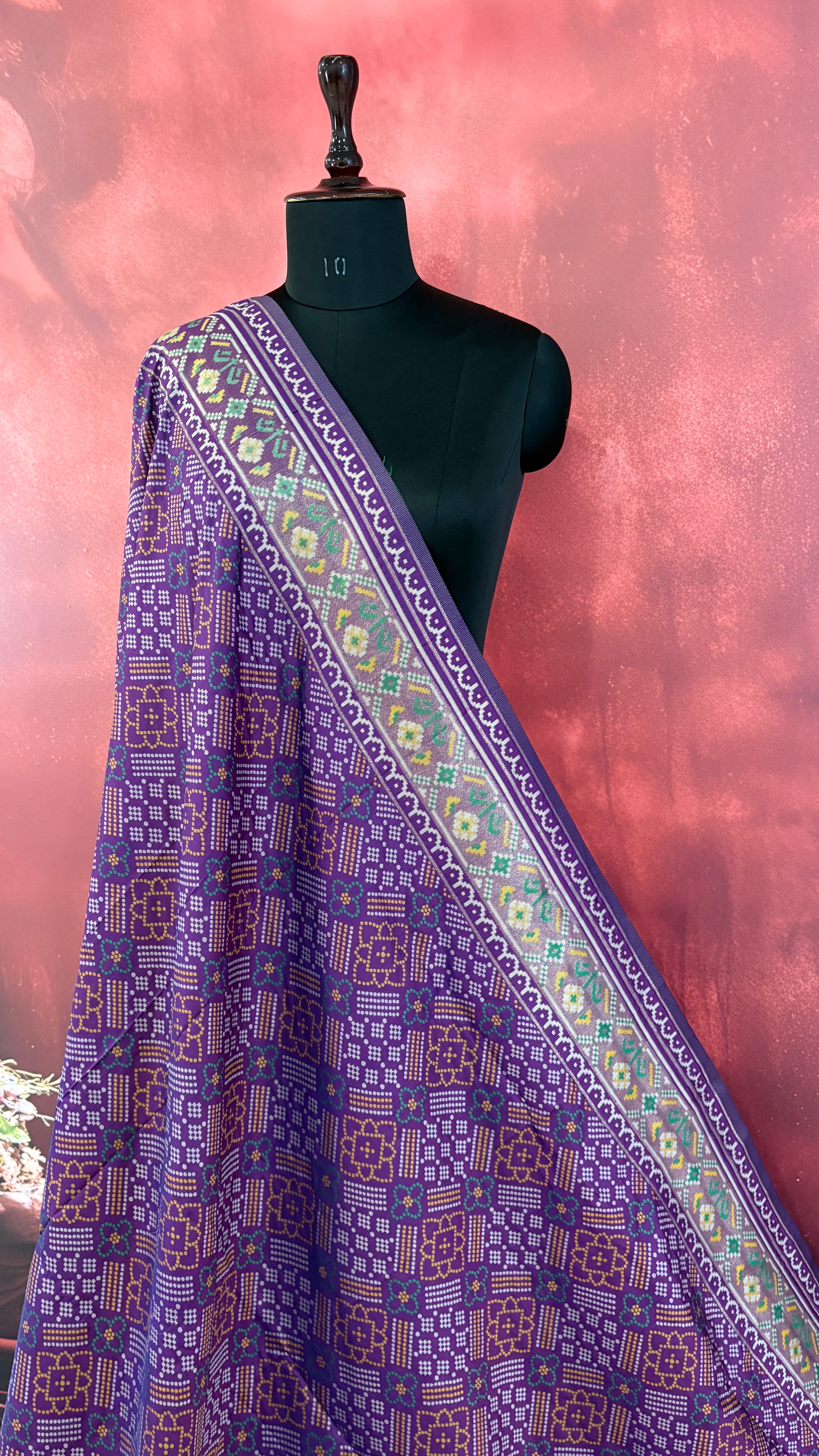 Patola is one of the most prestigious and luxurious handwoven textiles of India, originating from Patan, Gujarat. This exquisite double-ikat weaving technique dates back to the 11th century, once reserved for royalty and aristocrats. Known as the “Queen of Silks,” Patola is admired for its geometric precision, rich colors, and motifs symbolizing prosperity, fertility, and spirituality. What makes Patola unique is the double ikat method – both the warp and weft threads are dyed with exacting precision before weaving, creating identical patterns on both sides of the fabric. This mastery requires months of labor, making each Patola saree a priceless heirloom.