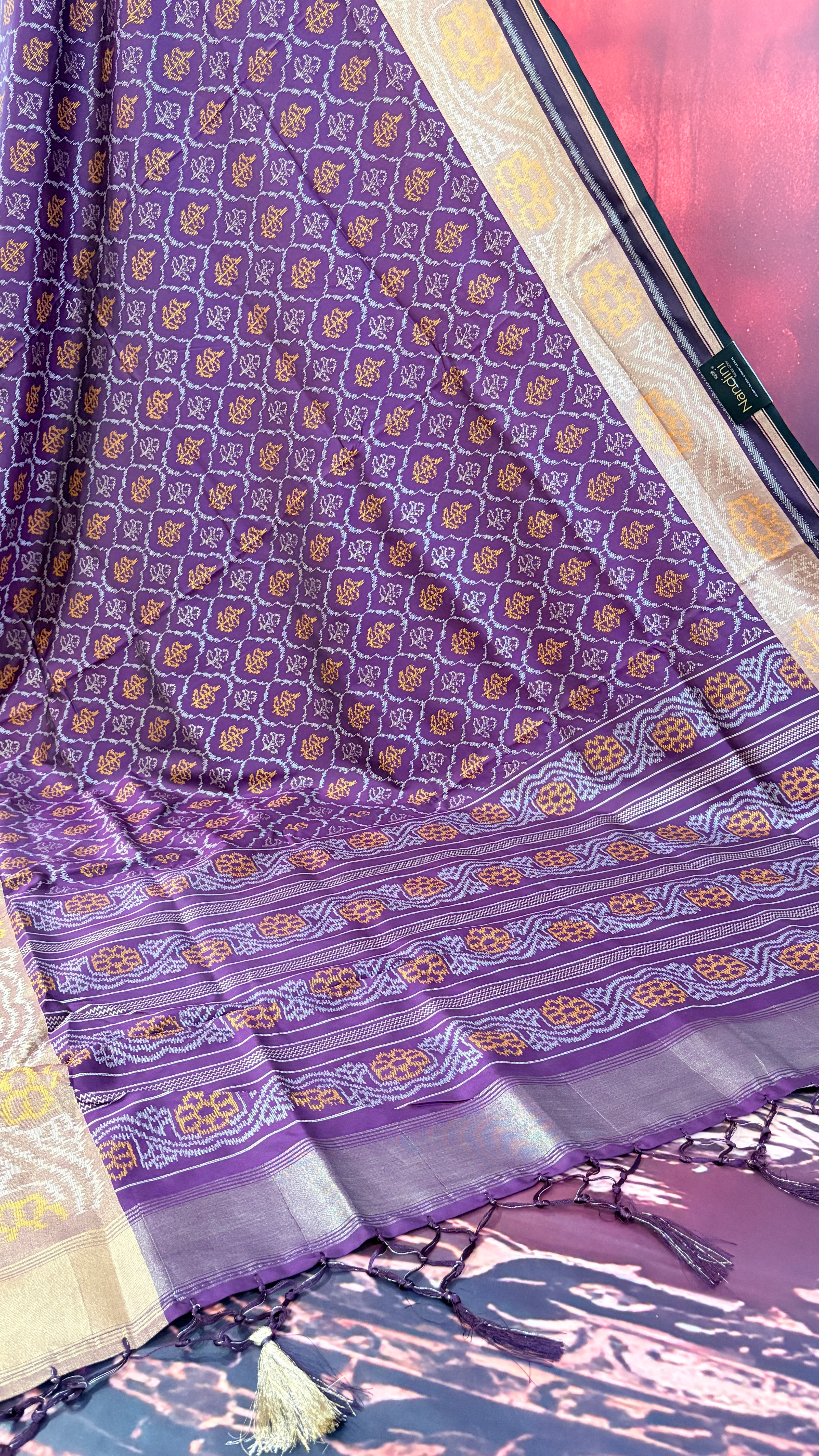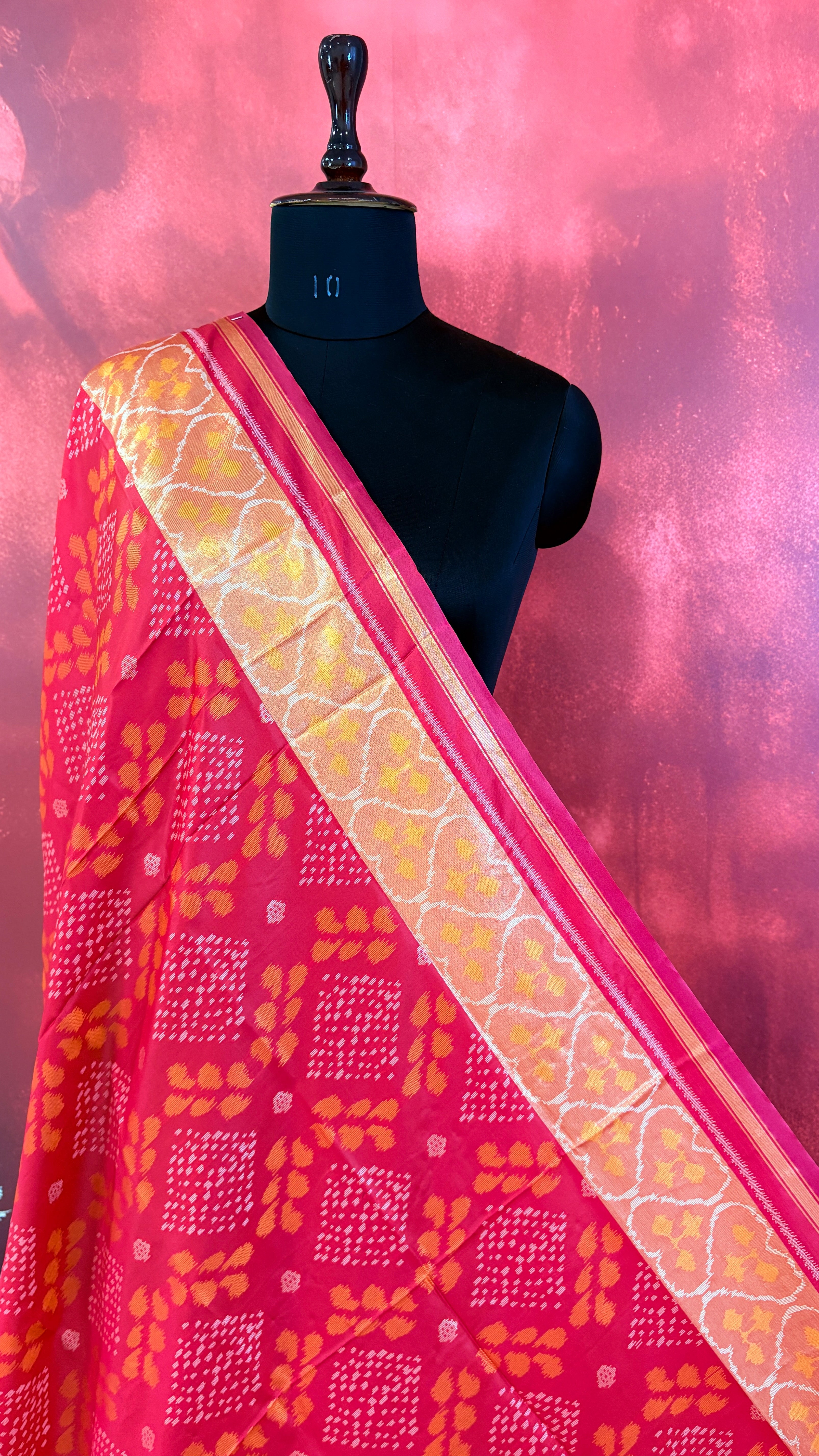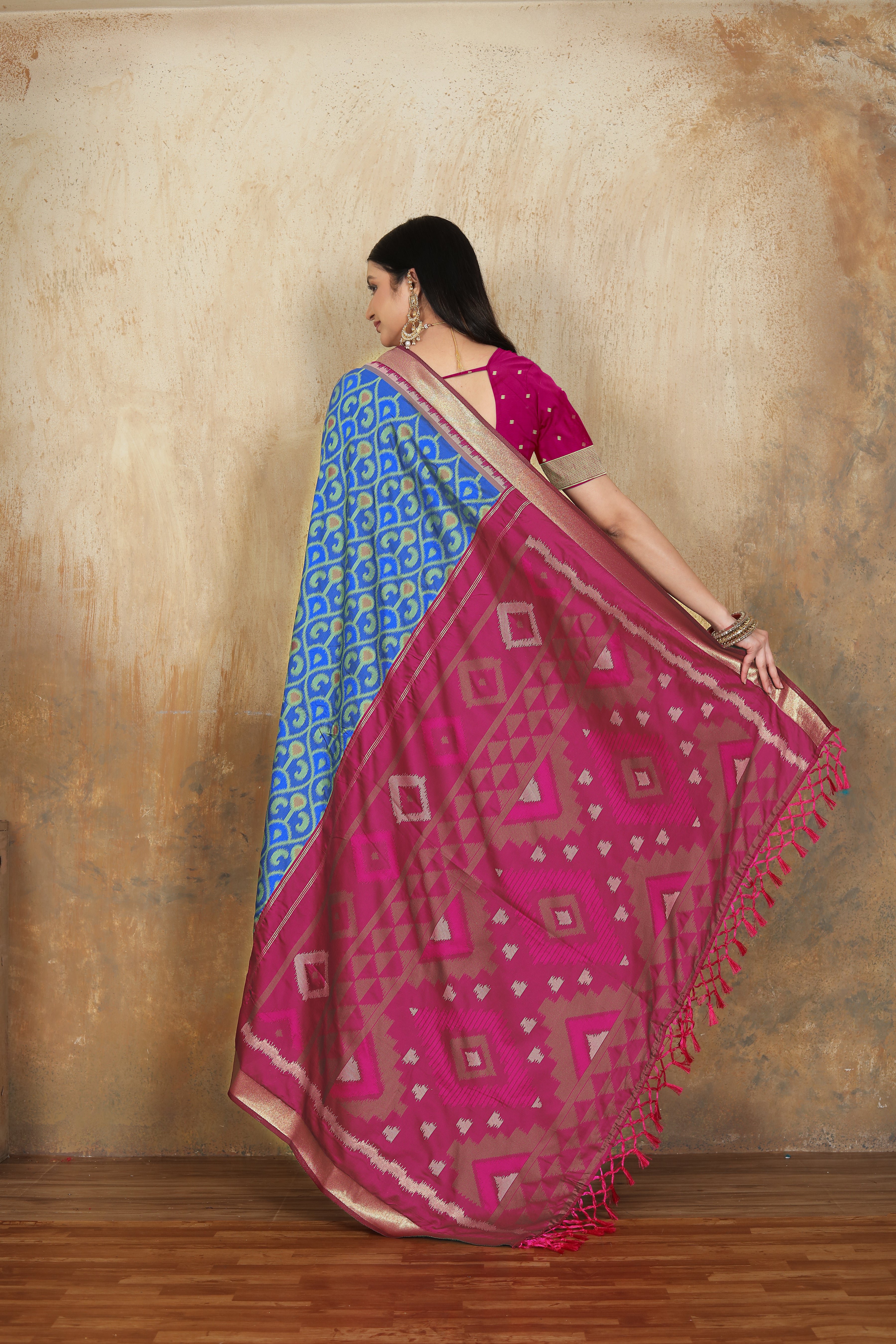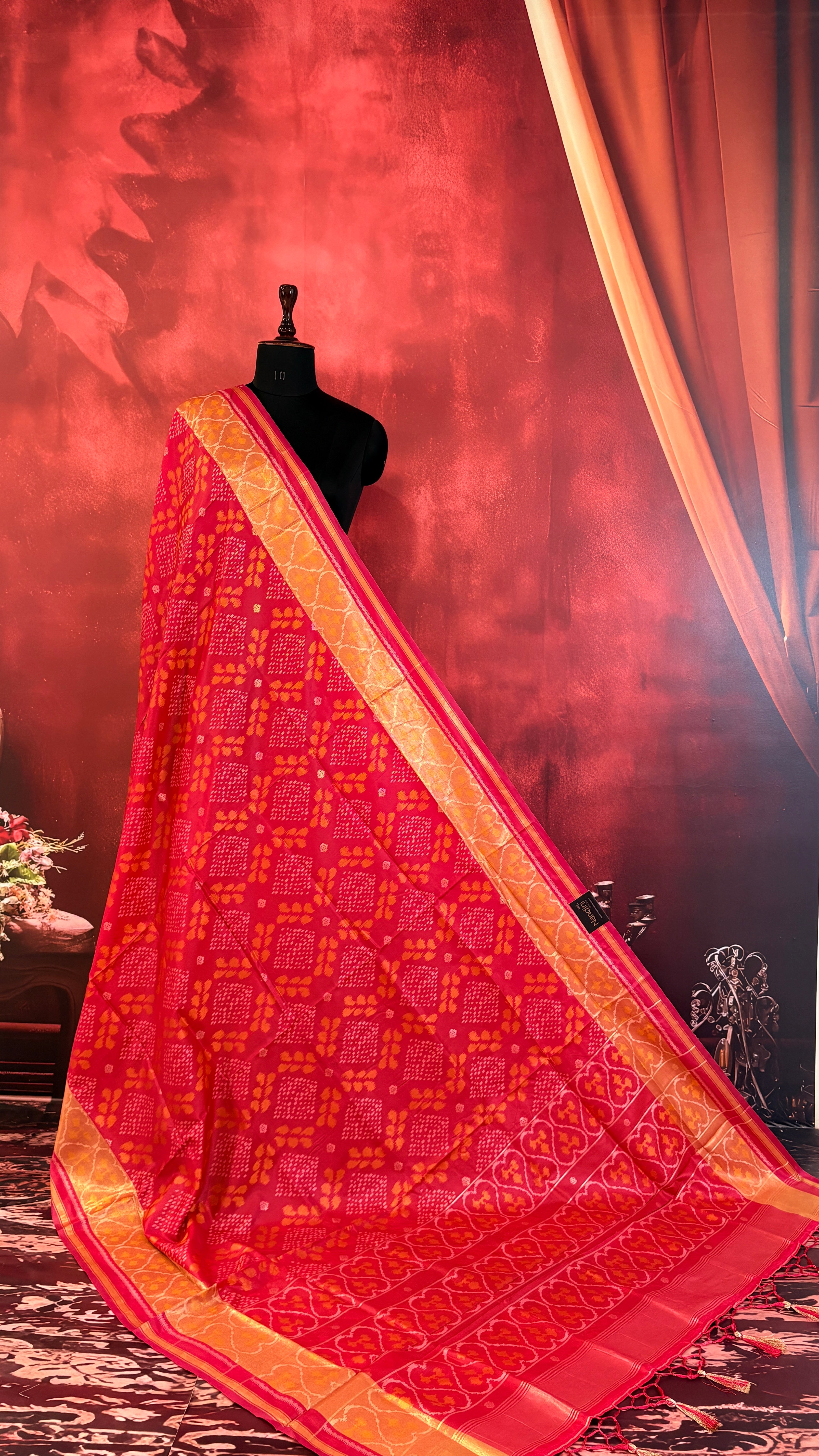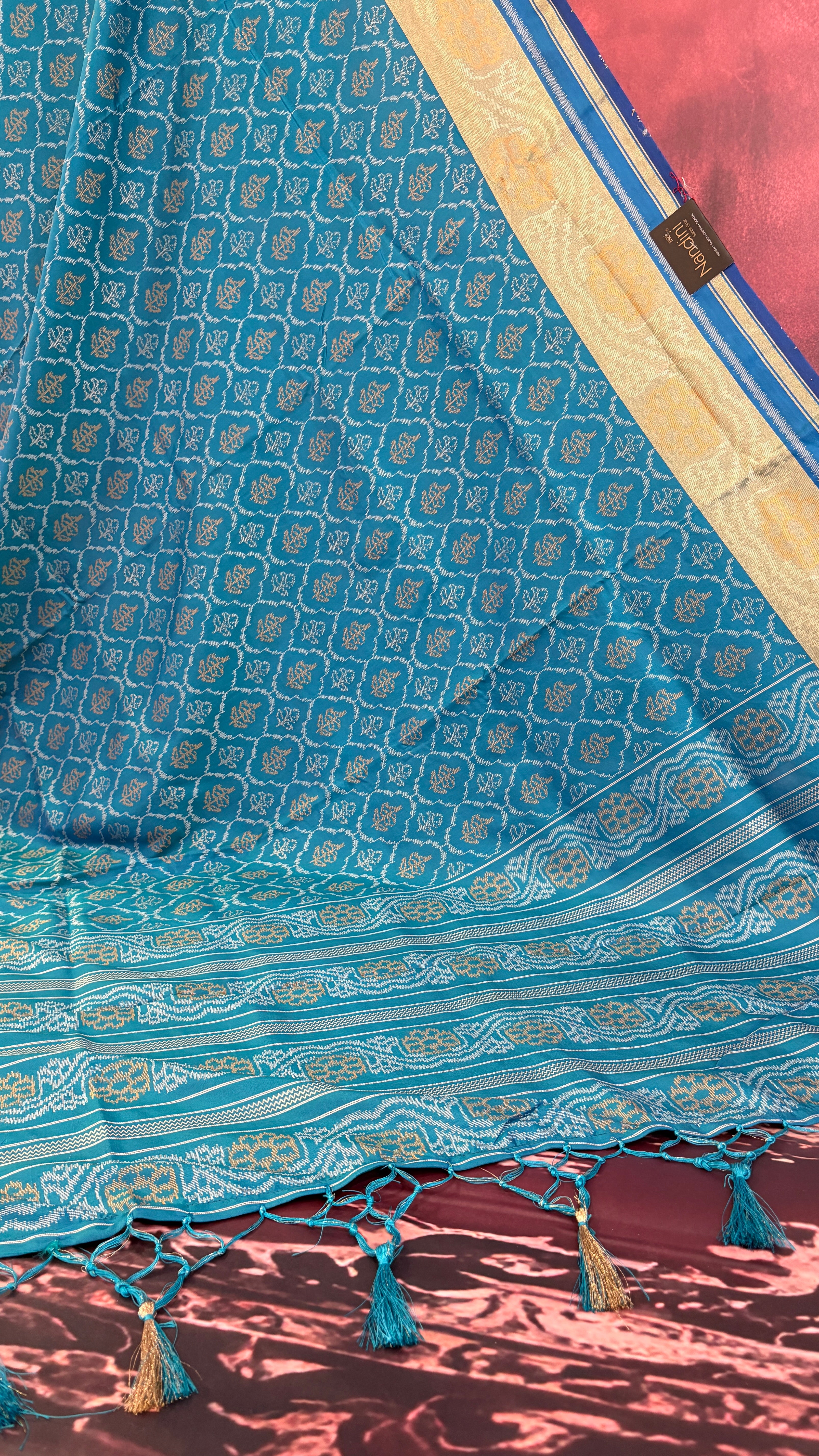 Patola is one of the most prestigious and luxurious handwoven textiles of India, originating from Patan, Gujarat. This exquisite double-ikat weaving technique dates back to the 11th century, once reserved for royalty and aristocrats. Known as the “Queen of Silks,” Patola is admired for its geometric precision, rich colors, and motifs symbolizing prosperity, fertility, and spirituality. What makes Patola unique is the double ikat method – both the warp and weft threads are dyed with exacting precision before weaving, creating identical patterns on both sides of the fabric. This mastery requires months of labor, making each Patola saree a priceless heirloom.