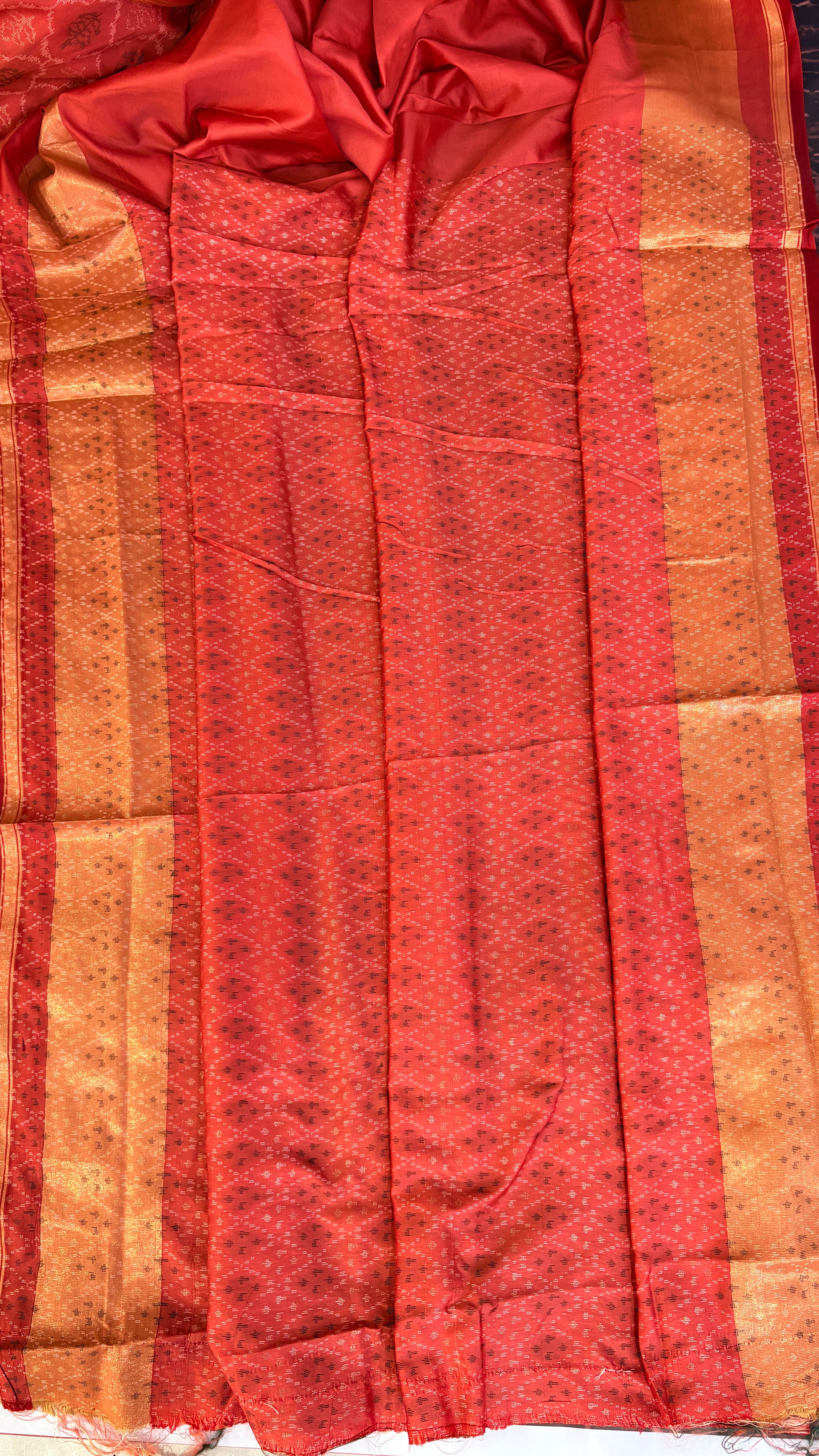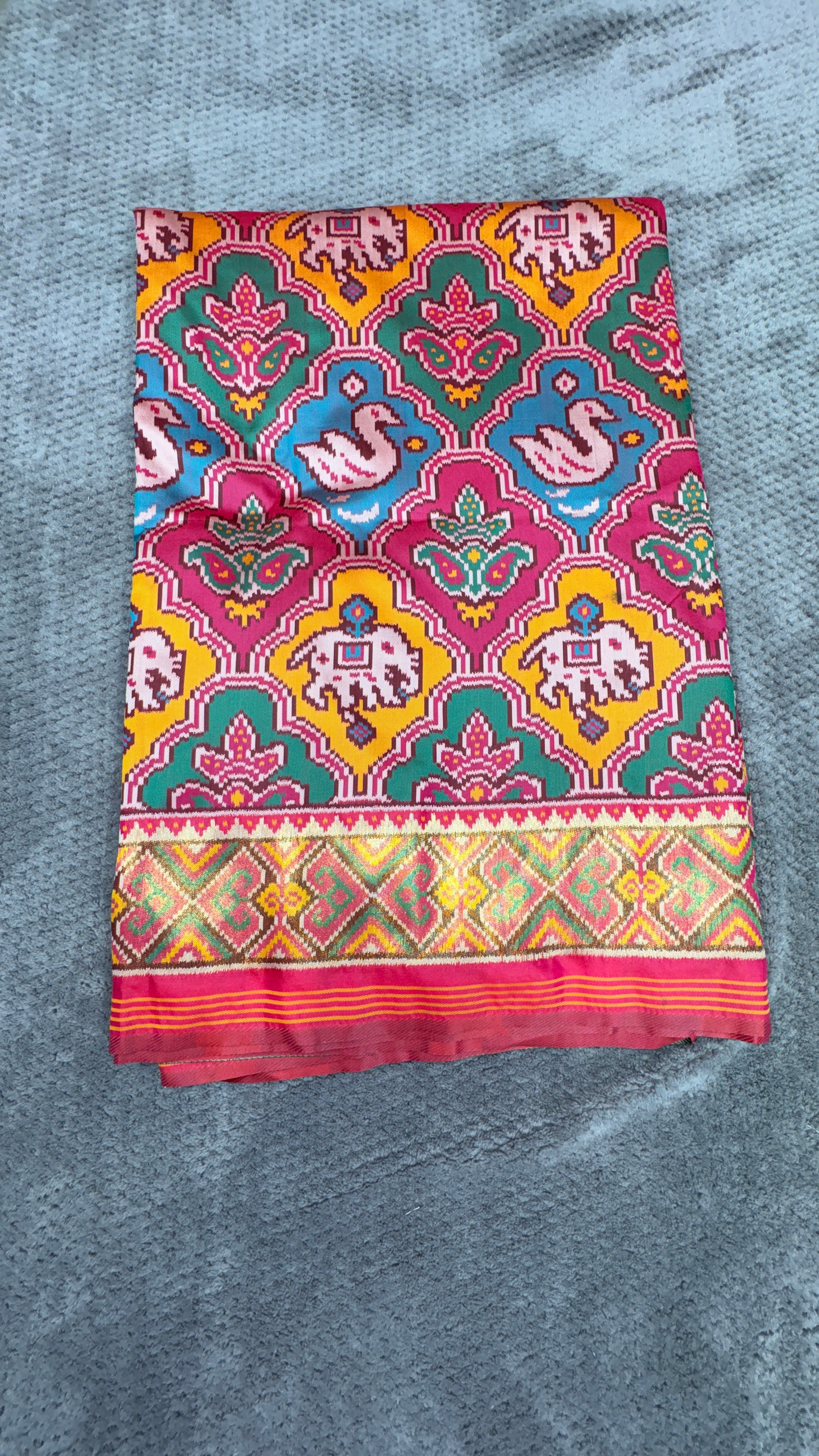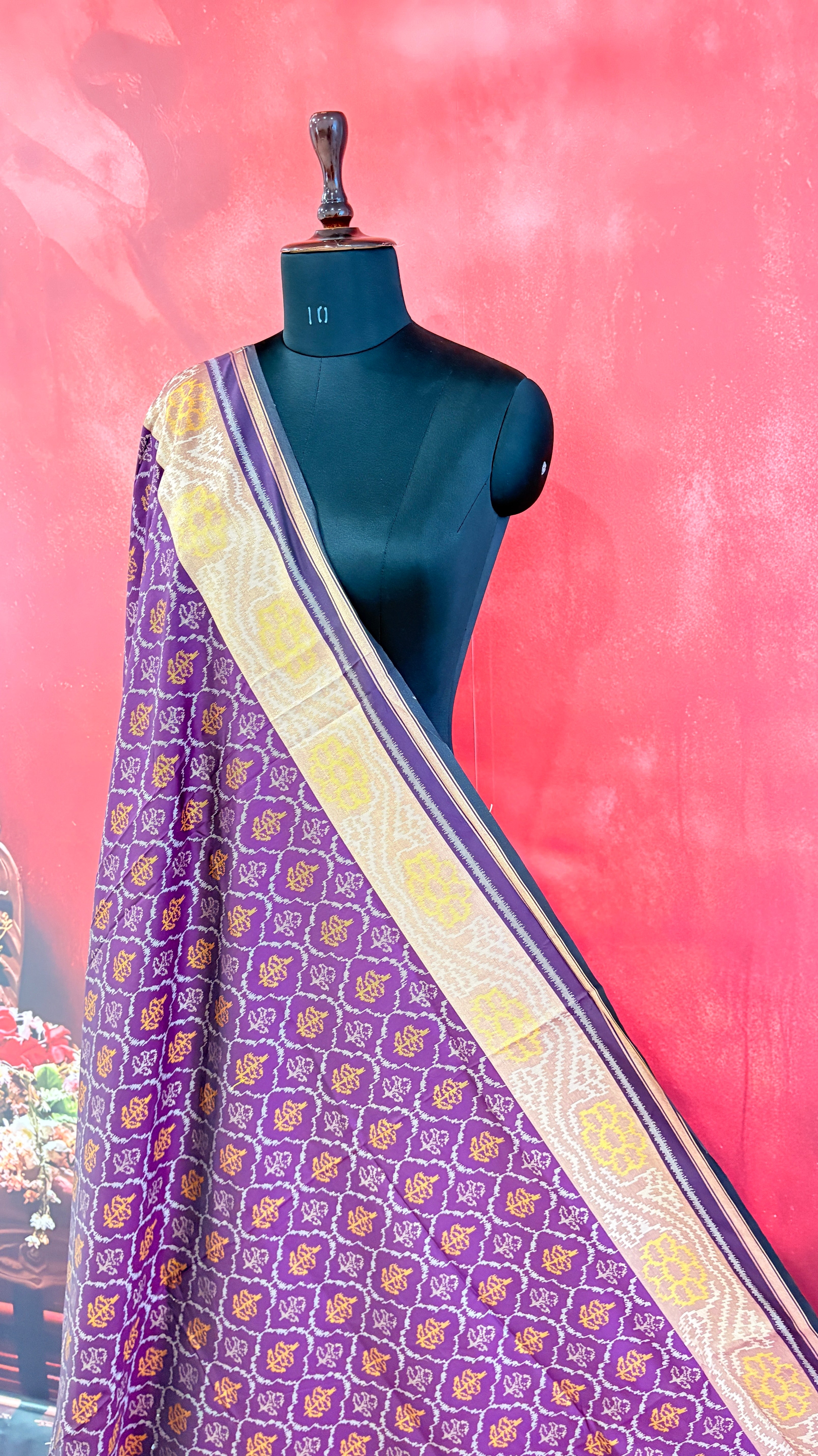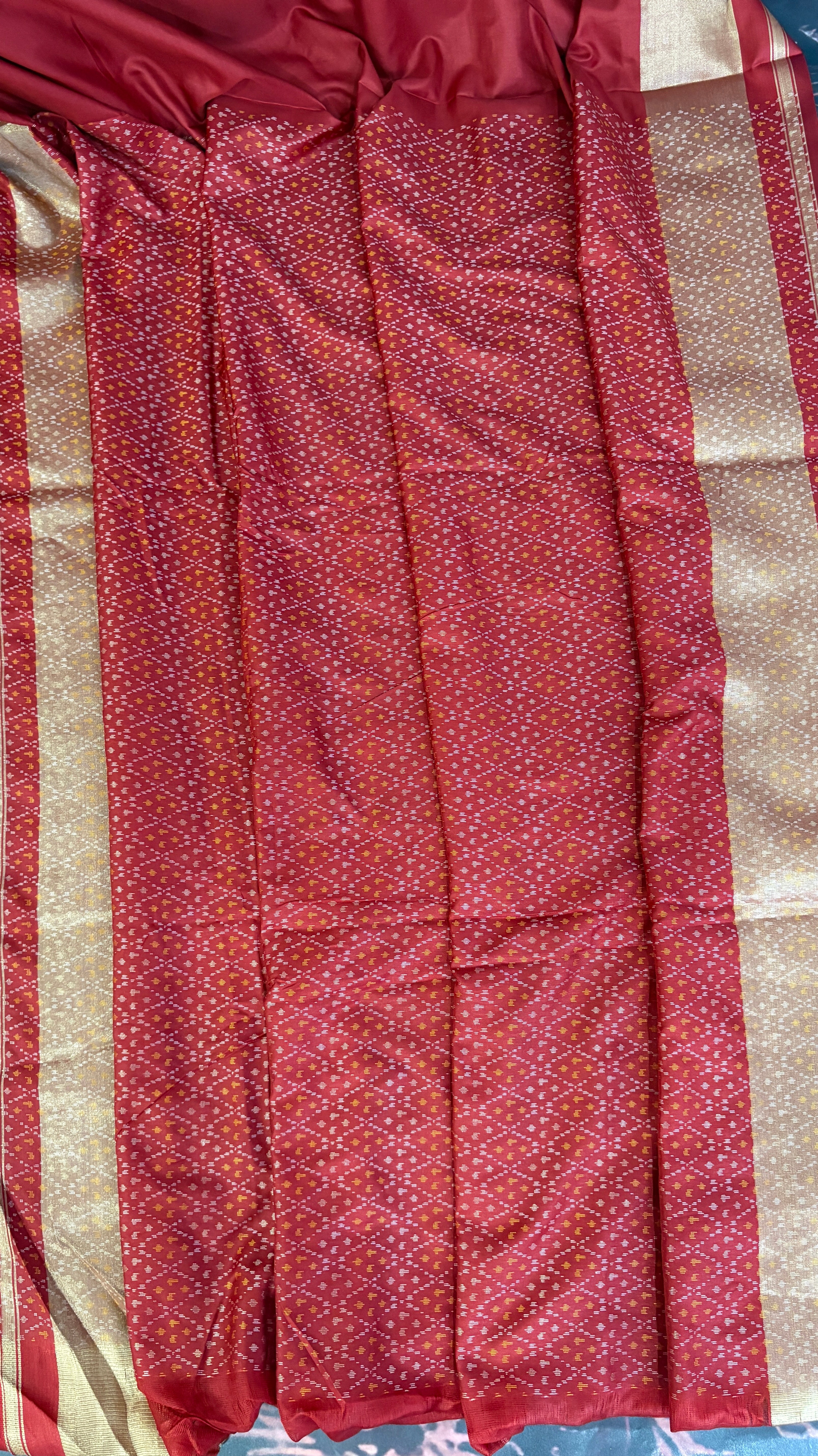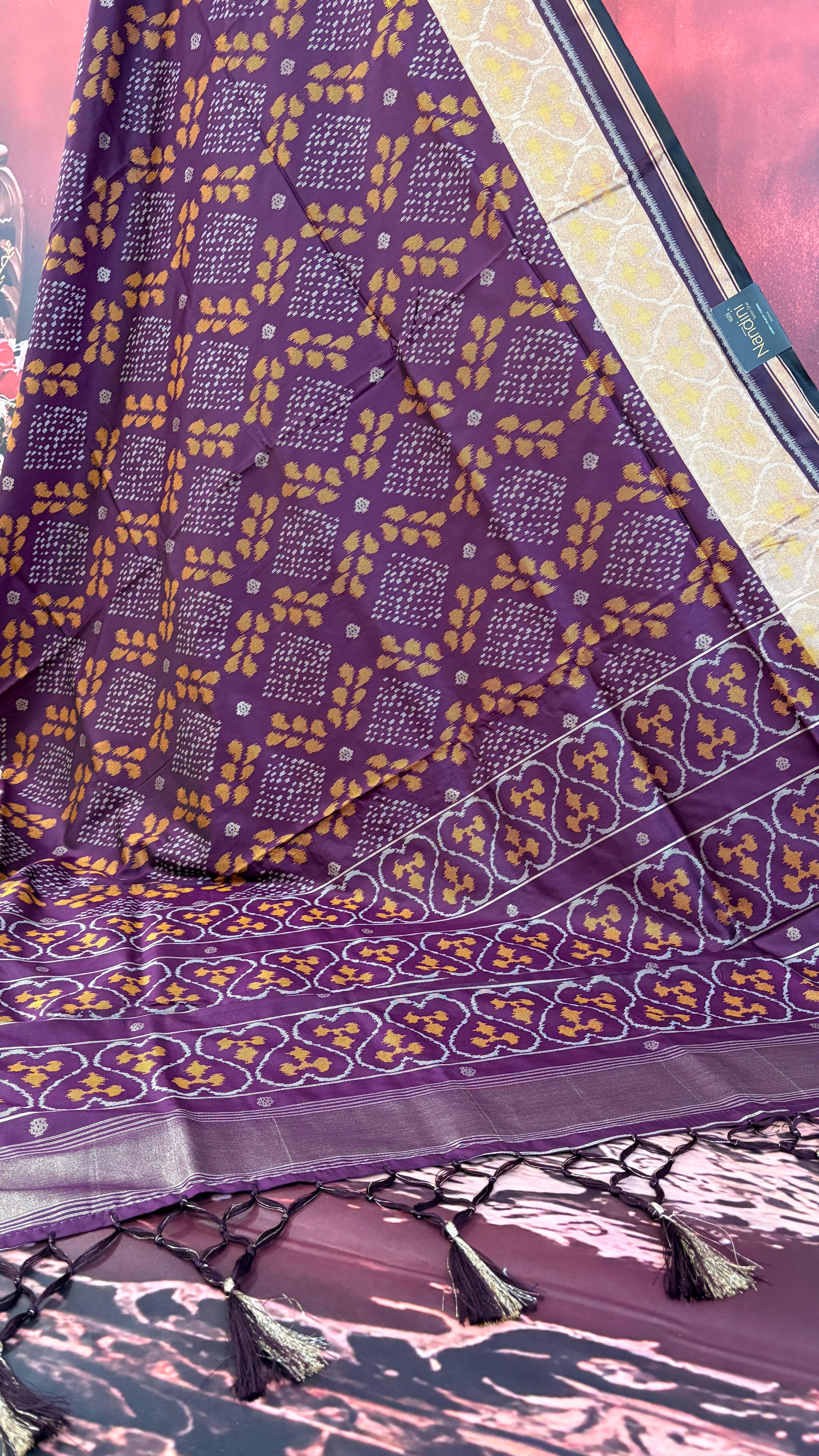 Patola is one of the most prestigious and luxurious handwoven textiles of India, originating from Patan, Gujarat. This exquisite double-ikat weaving technique dates back to the 11th century, once reserved for royalty and aristocrats. Known as the “Queen of Silks,” Patola is admired for its geometric precision, rich colors, and motifs symbolizing prosperity, fertility, and spirituality. What makes Patola unique is the double ikat method – both the warp and weft threads are dyed with exacting precision before weaving, creating identical patterns on both sides of the fabric. This mastery requires months of labor, making each Patola saree a priceless heirloom.