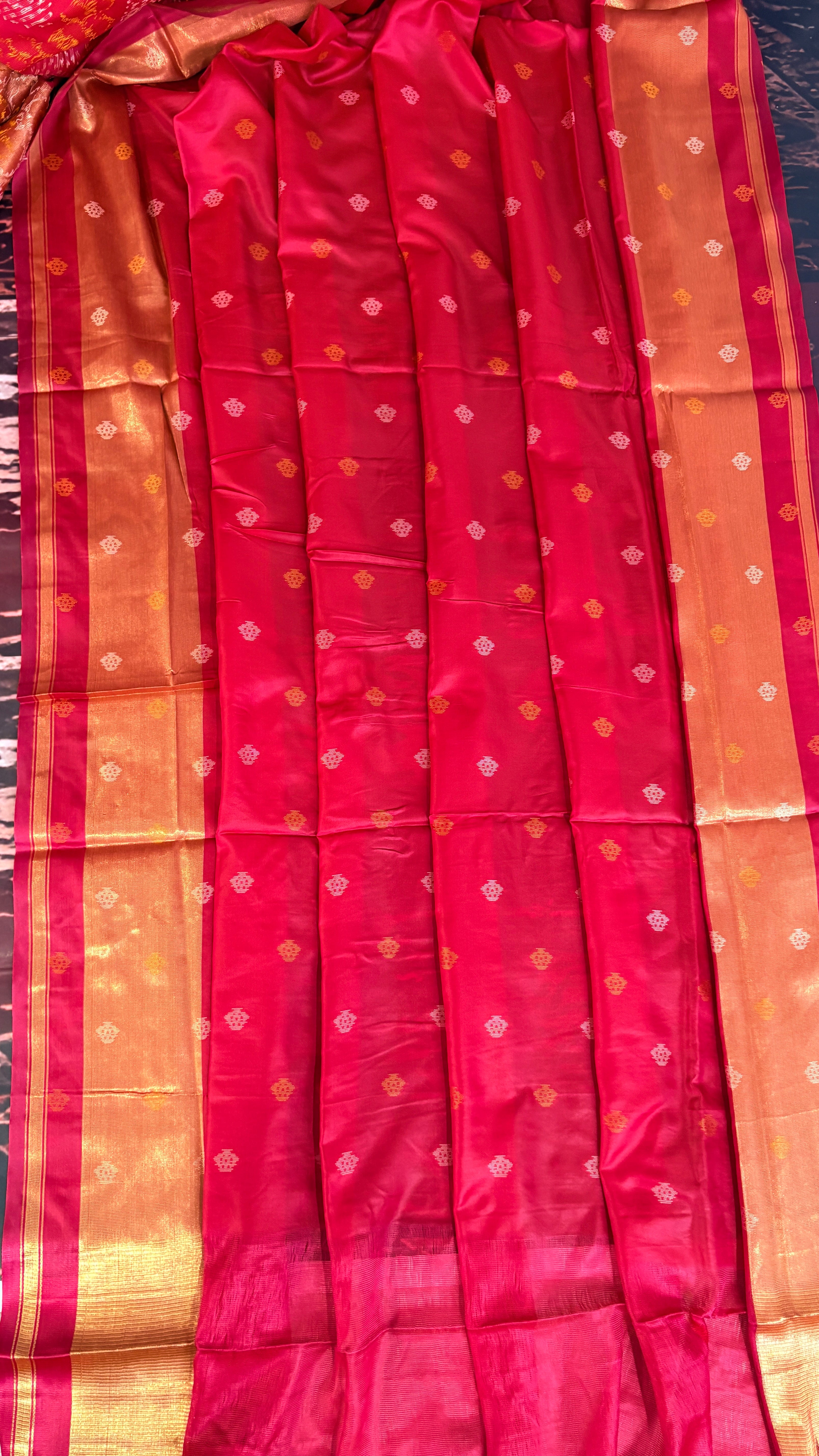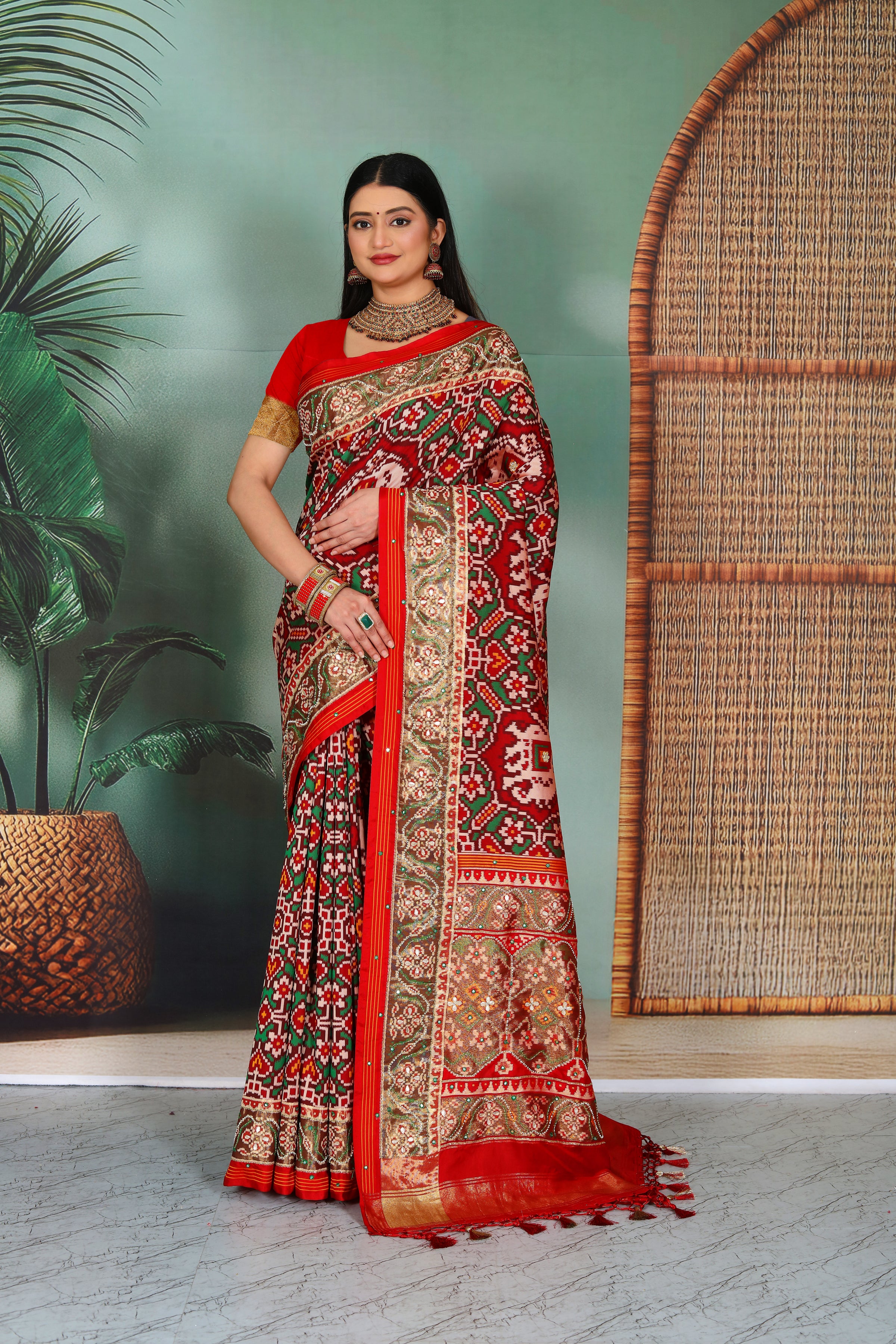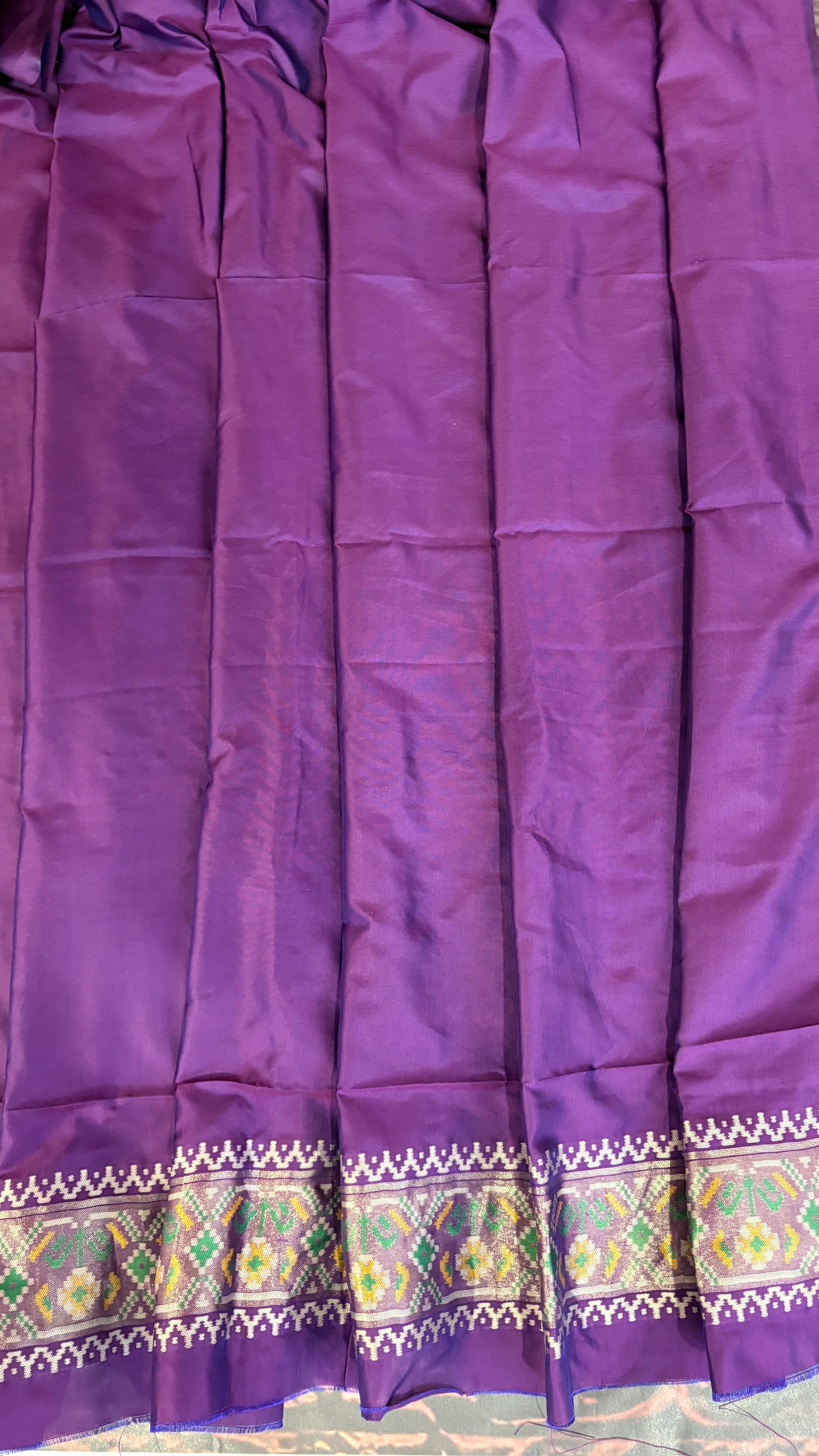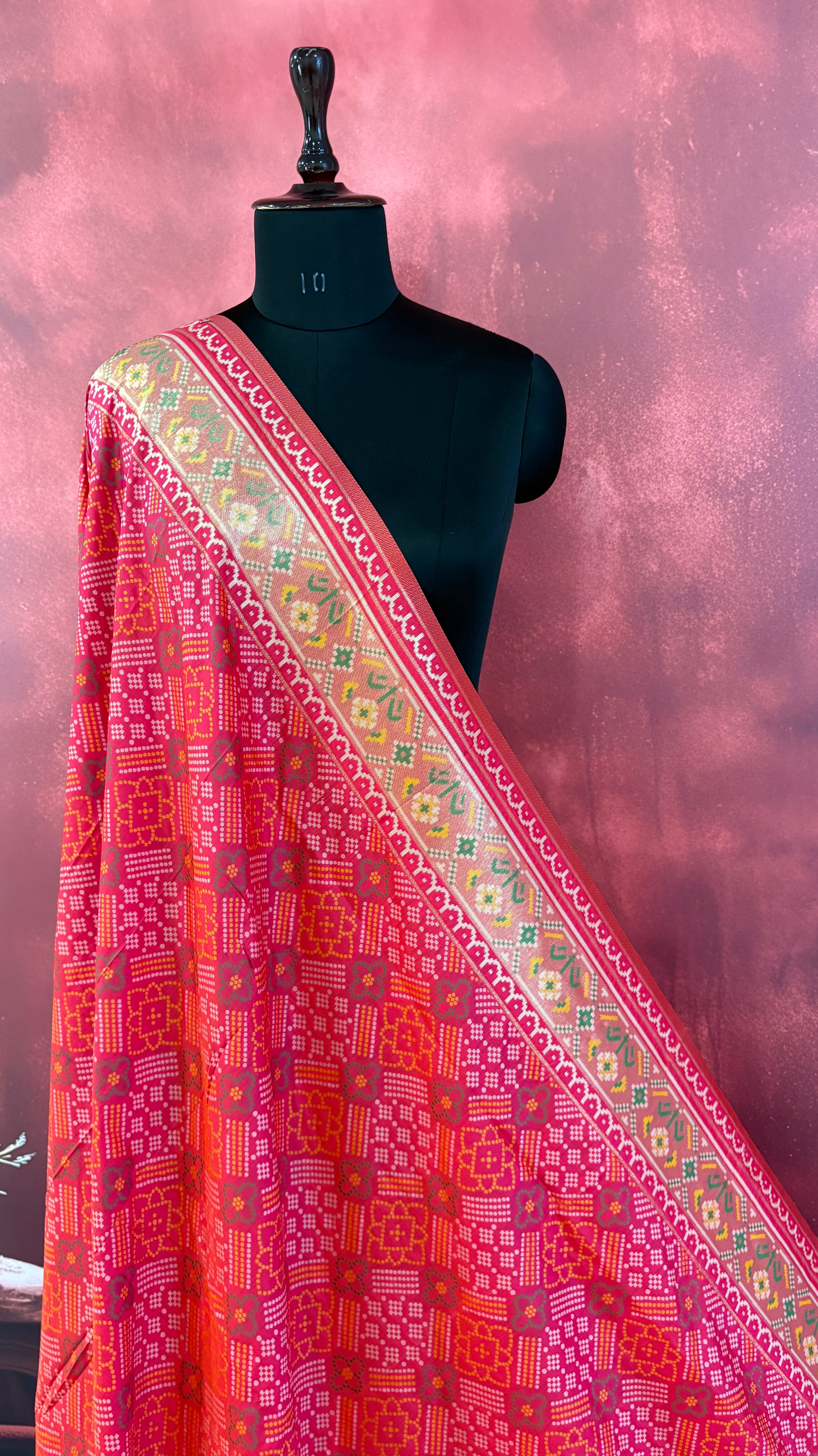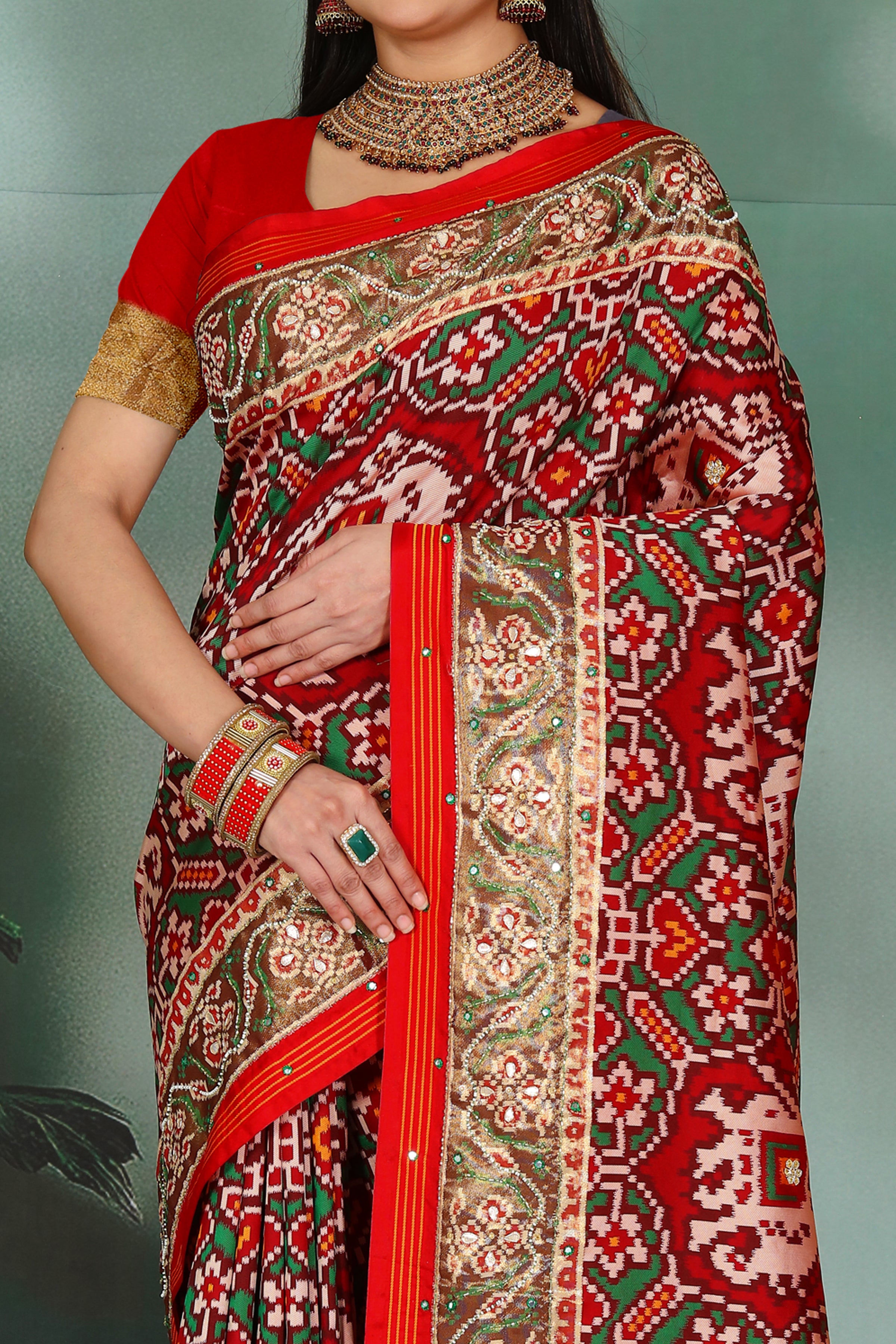 Patola is one of the most prestigious and luxurious handwoven textiles of India, originating from Patan, Gujarat. This exquisite double-ikat weaving technique dates back to the 11th century, once reserved for royalty and aristocrats. Known as the “Queen of Silks,” Patola is admired for its geometric precision, rich colors, and motifs symbolizing prosperity, fertility, and spirituality. What makes Patola unique is the double ikat method – both the warp and weft threads are dyed with exacting precision before weaving, creating identical patterns on both sides of the fabric. This mastery requires months of labor, making each Patola saree a priceless heirloom.