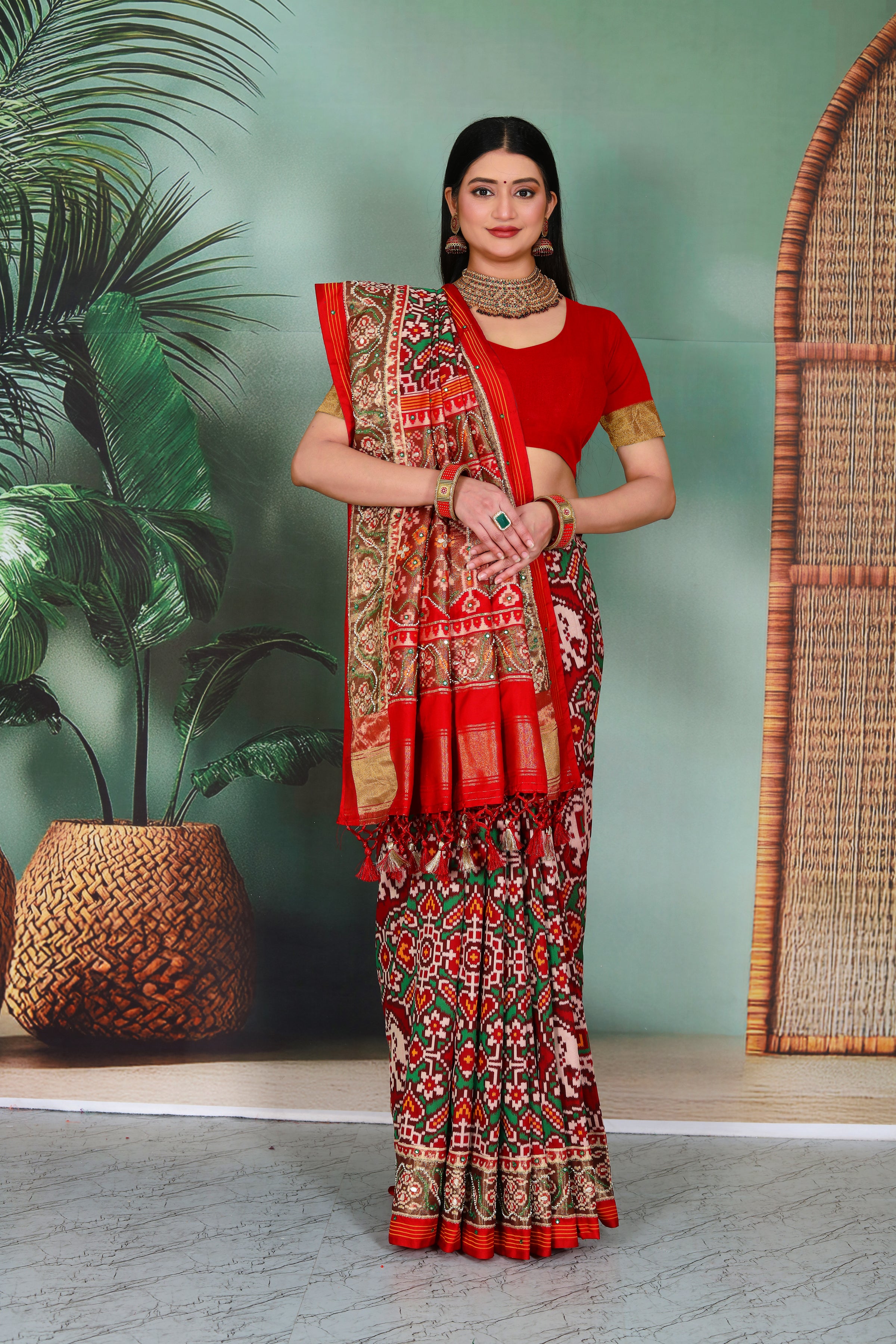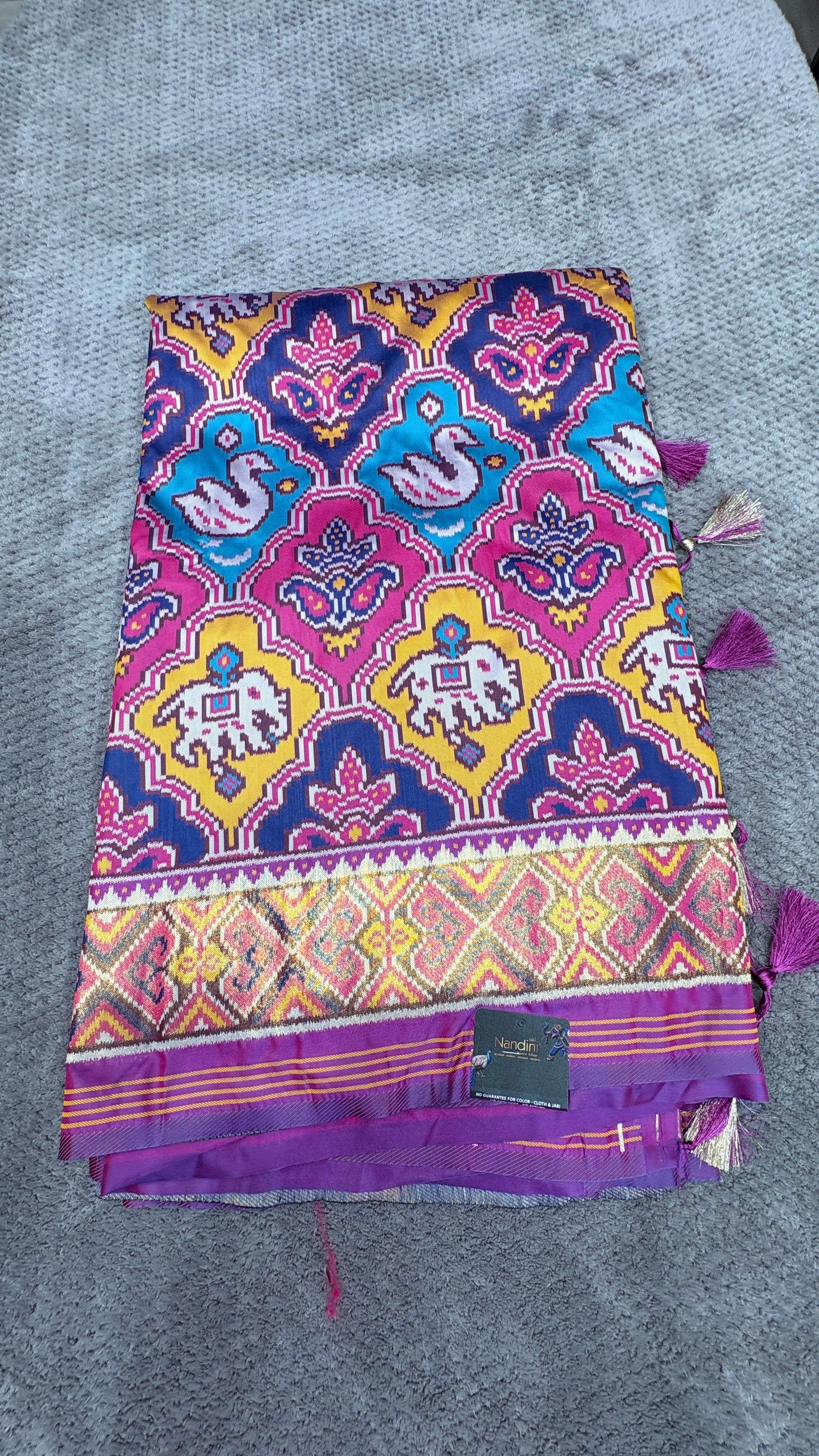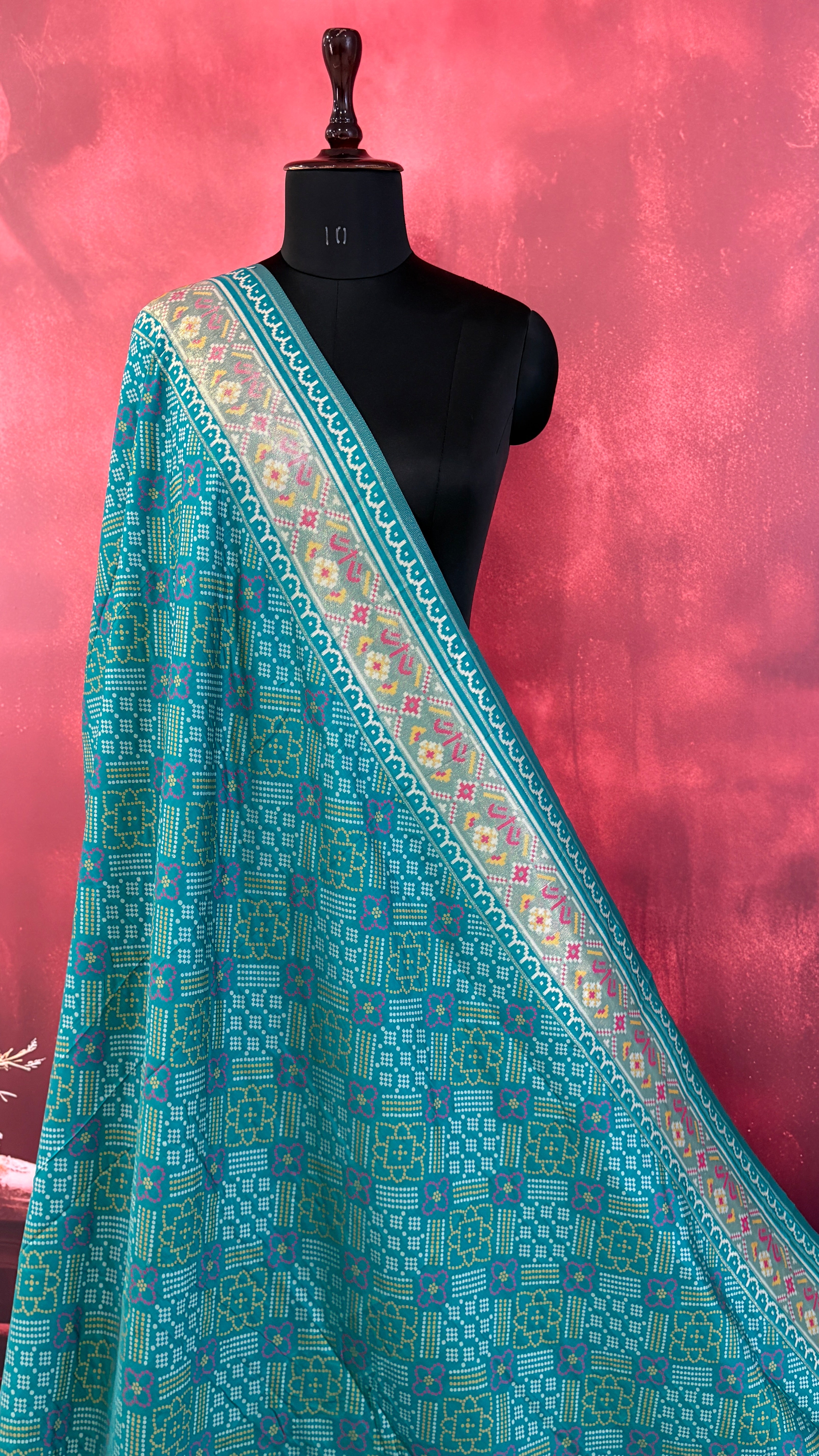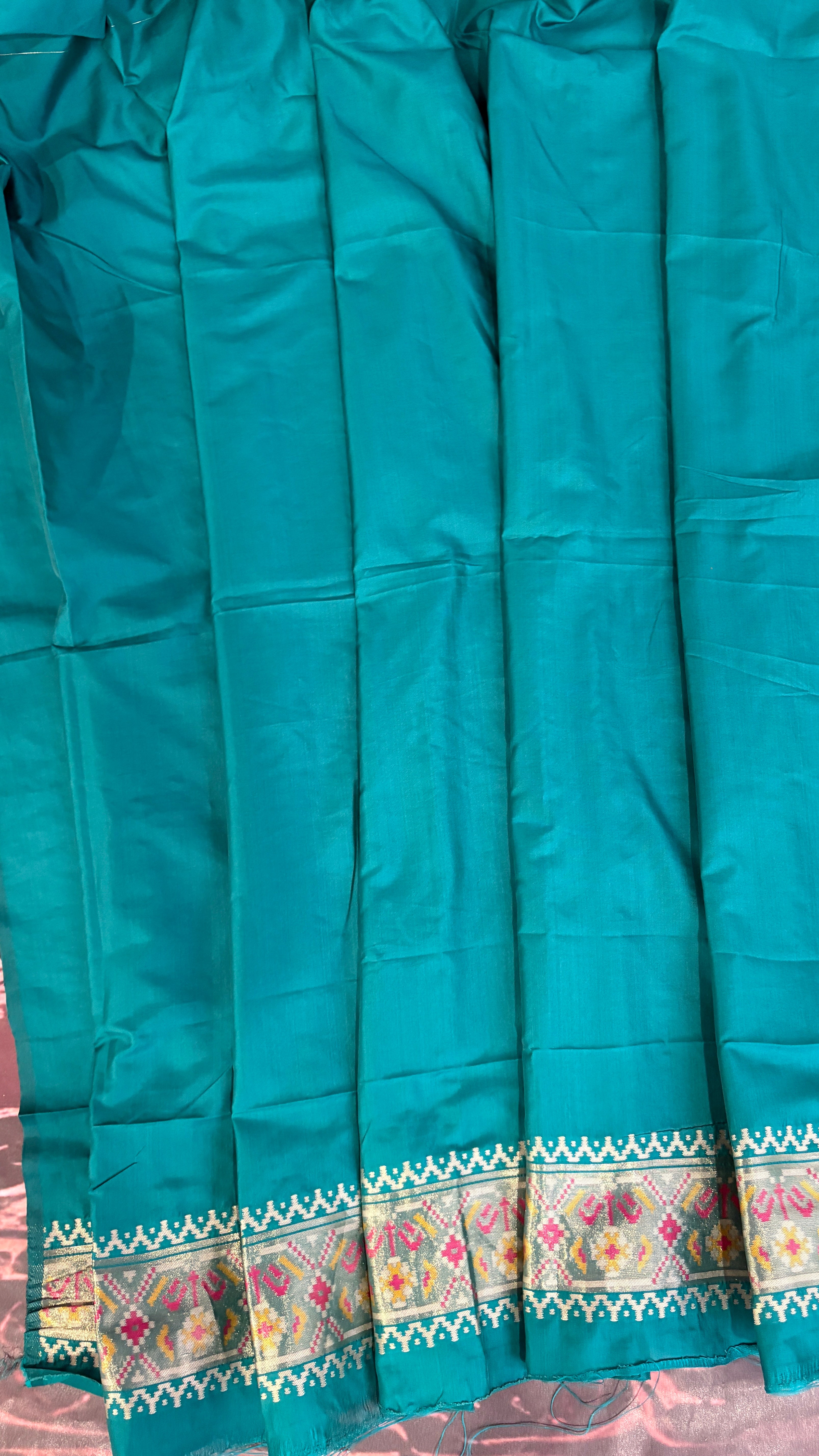 Patola is one of the most prestigious and luxurious handwoven textiles of India, originating from Patan, Gujarat. This exquisite double-ikat weaving technique dates back to the 11th century, once reserved for royalty and aristocrats. Known as the “Queen of Silks,” Patola is admired for its geometric precision, rich colors, and motifs symbolizing prosperity, fertility, and spirituality. What makes Patola unique is the double ikat method – both the warp and weft threads are dyed with exacting precision before weaving, creating identical patterns on both sides of the fabric. This mastery requires months of labor, making each Patola saree a priceless heirloom.
