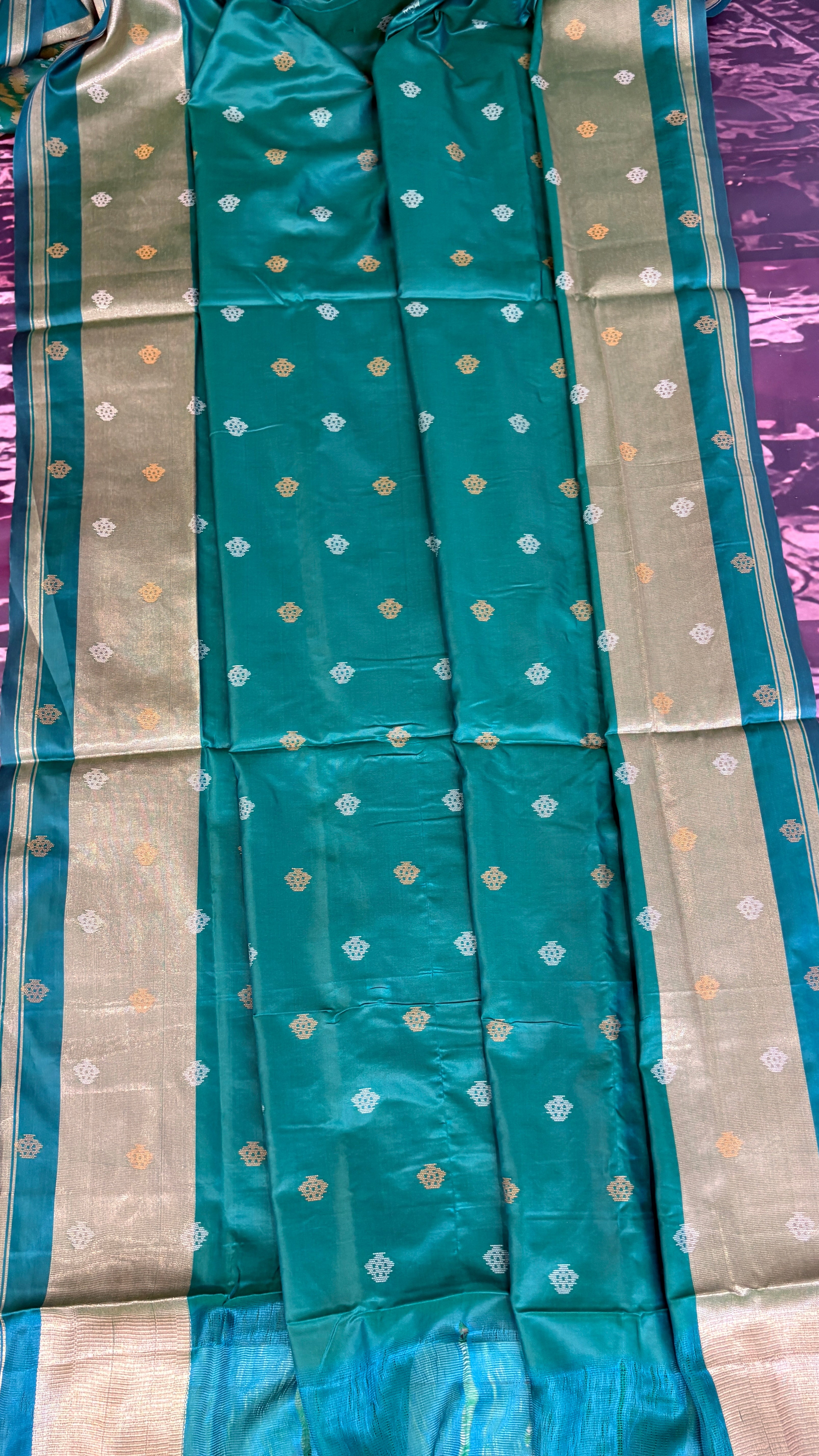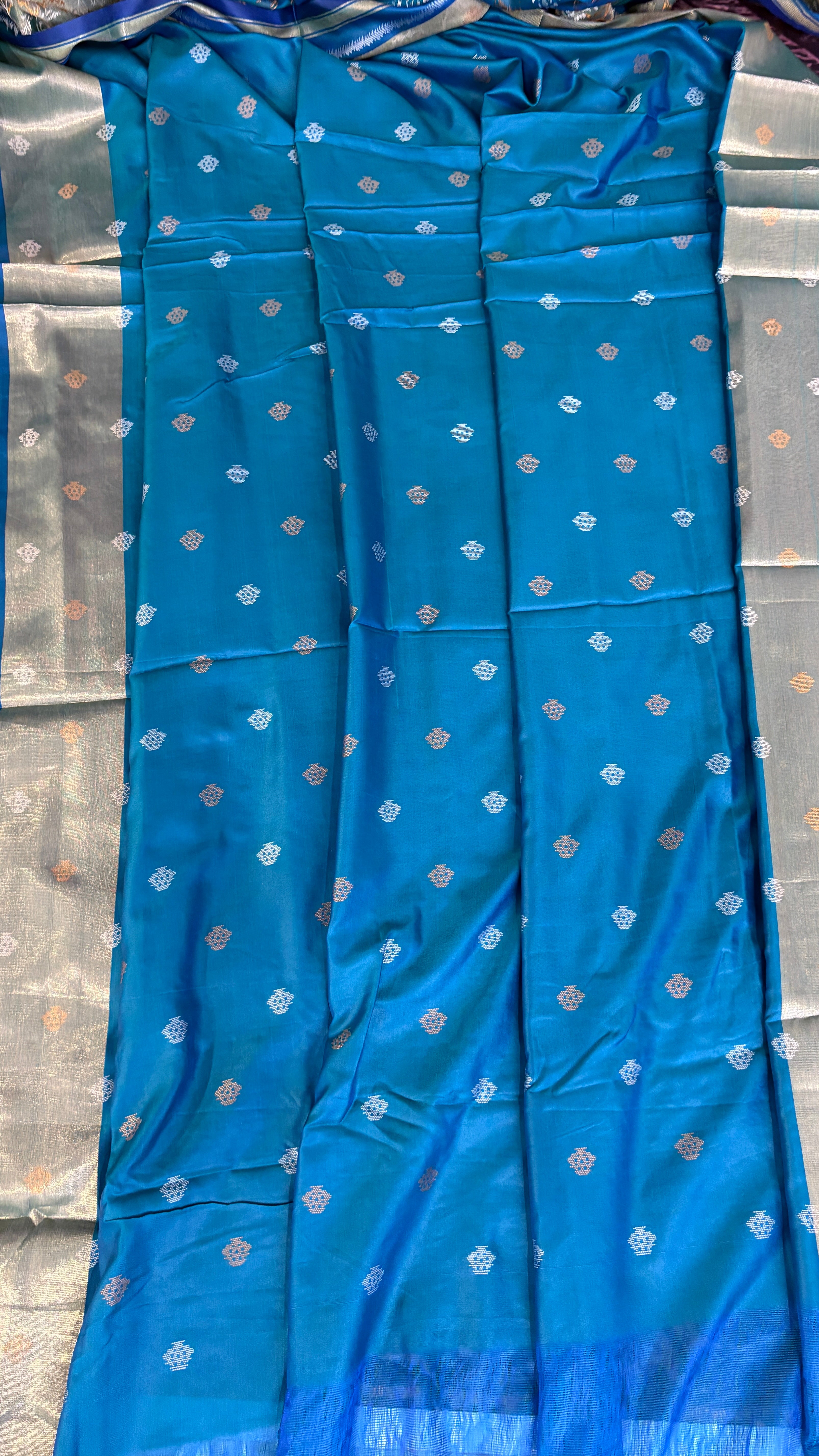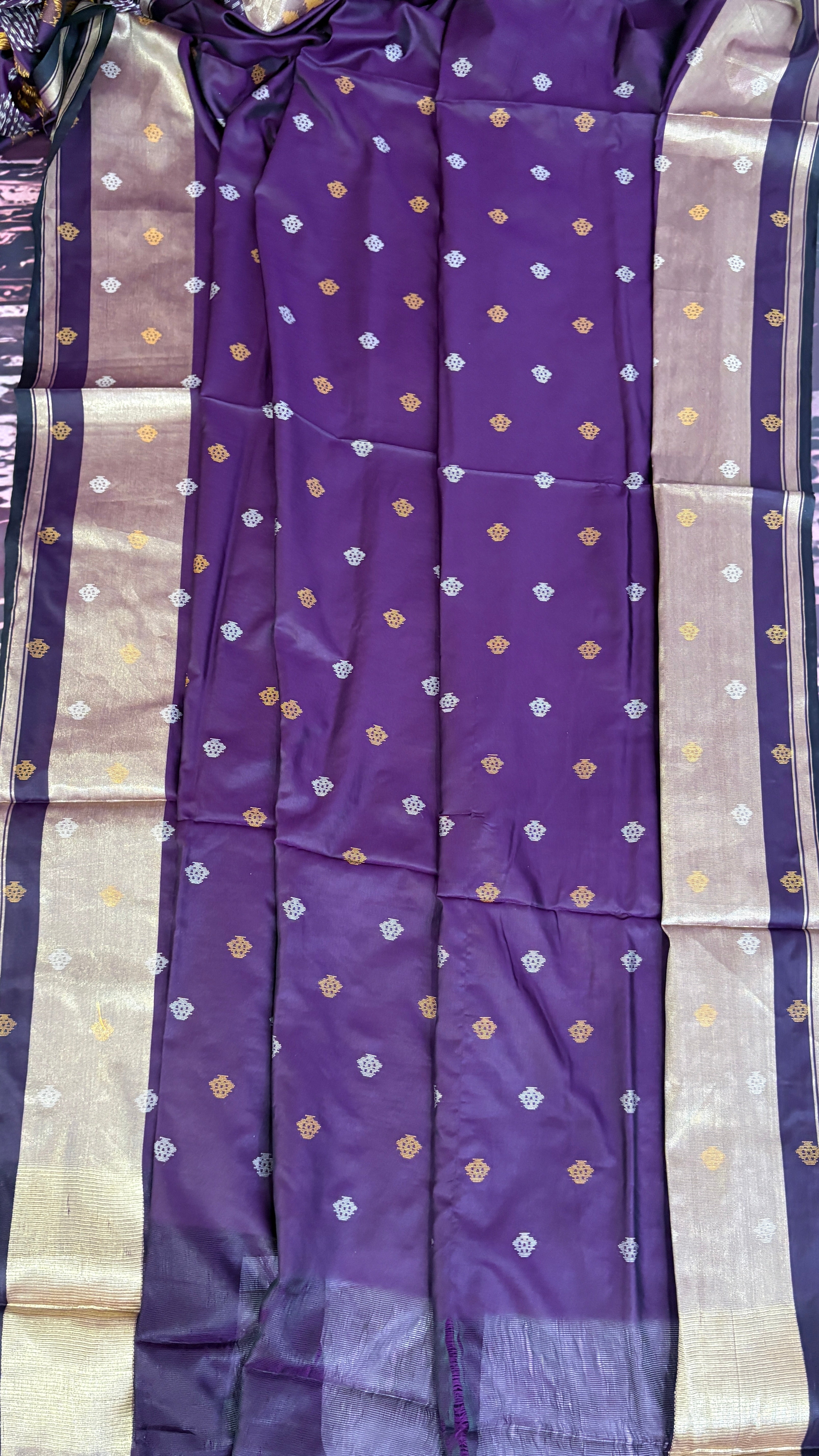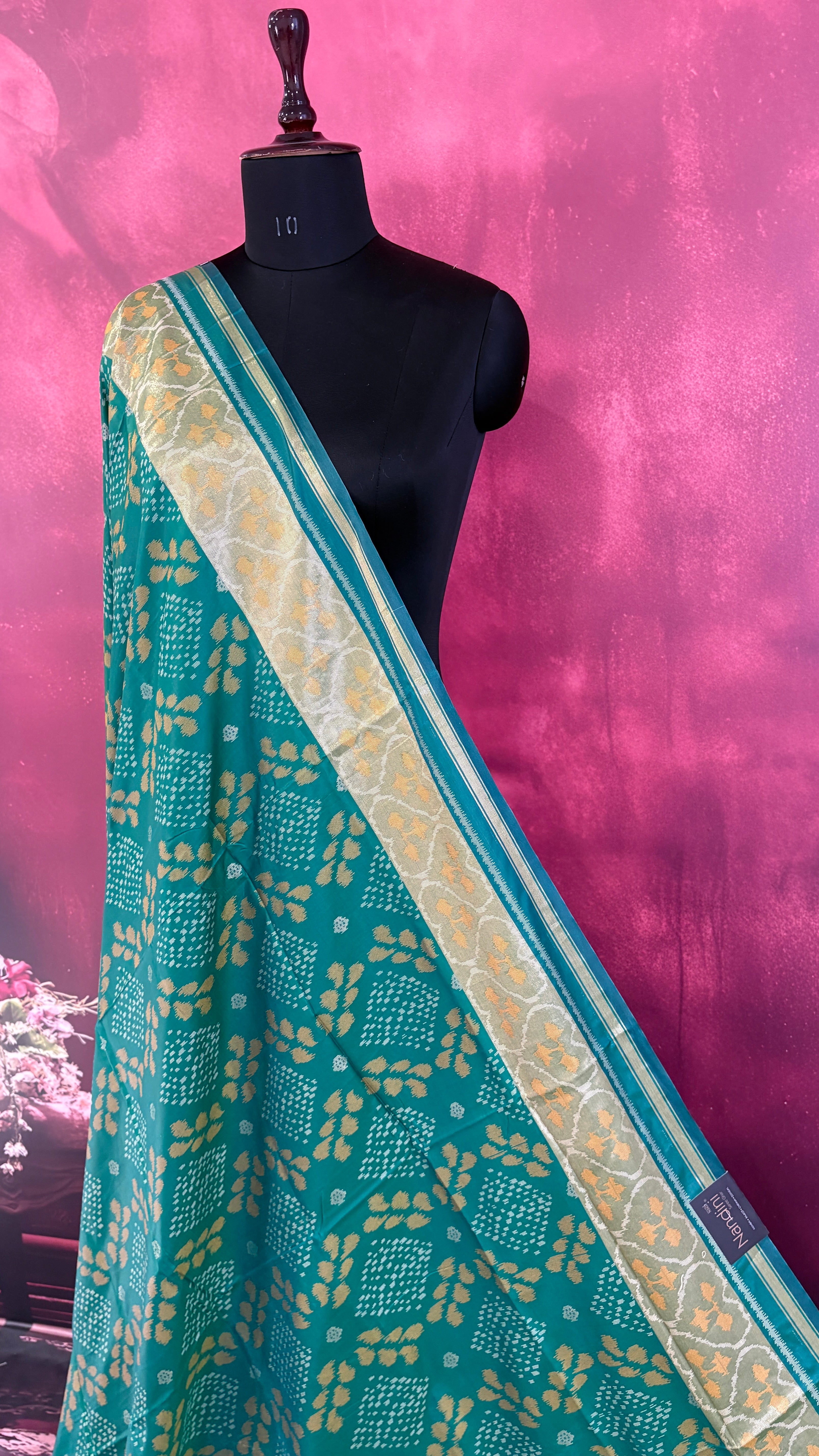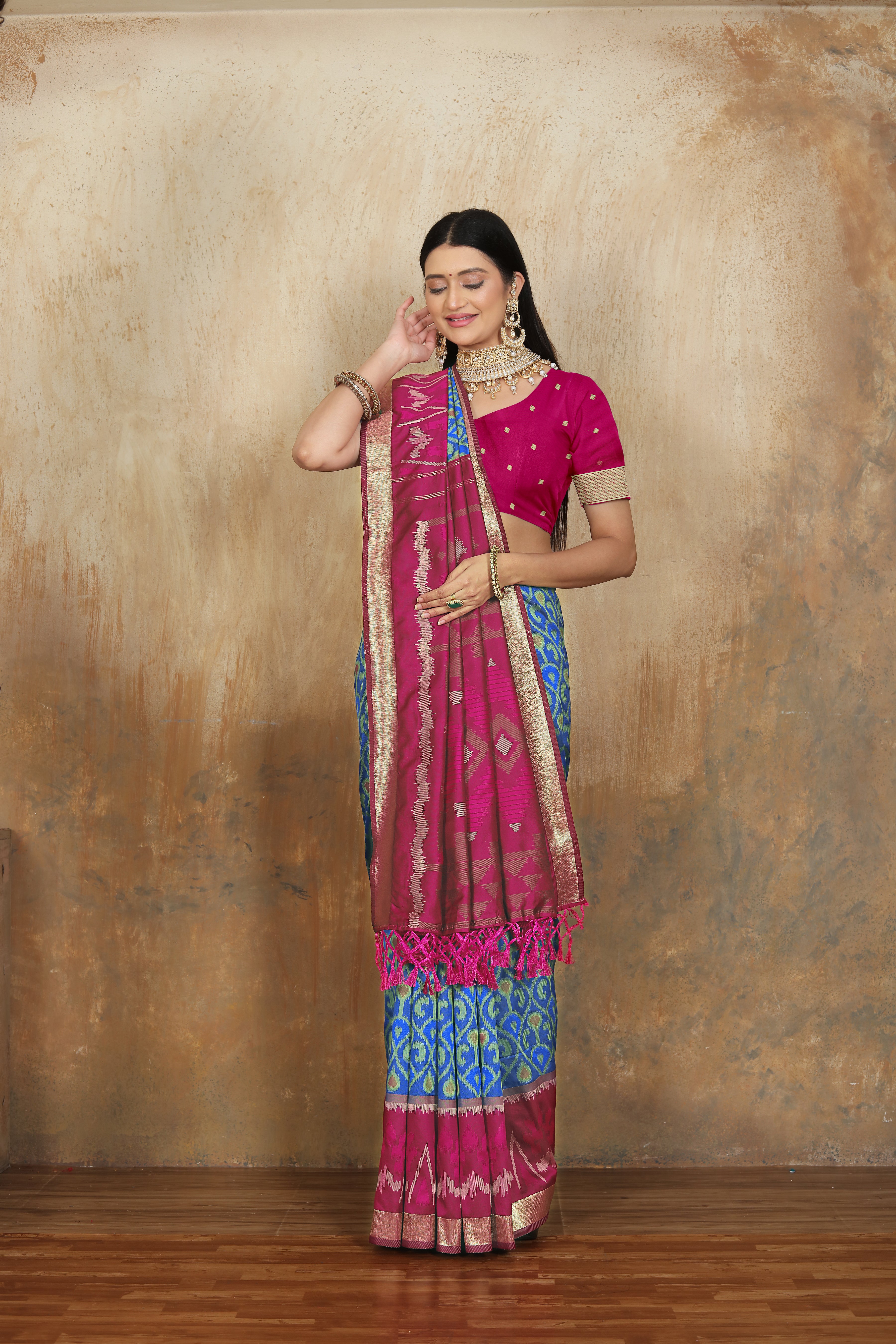 Patola is one of the most prestigious and luxurious handwoven textiles of India, originating from Patan, Gujarat. This exquisite double-ikat weaving technique dates back to the 11th century, once reserved for royalty and aristocrats. Known as the “Queen of Silks,” Patola is admired for its geometric precision, rich colors, and motifs symbolizing prosperity, fertility, and spirituality. What makes Patola unique is the double ikat method – both the warp and weft threads are dyed with exacting precision before weaving, creating identical patterns on both sides of the fabric. This mastery requires months of labor, making each Patola saree a priceless heirloom.
