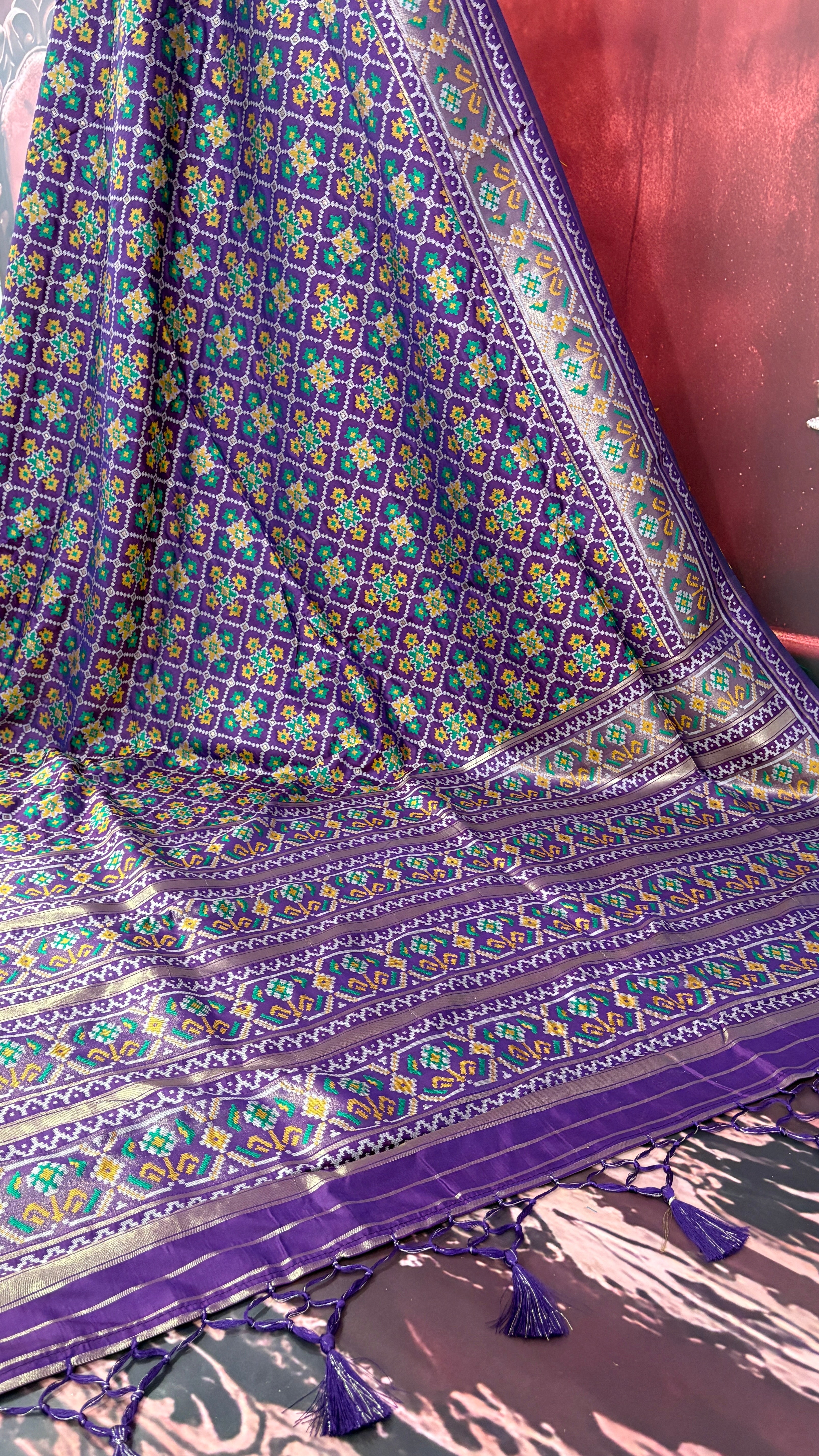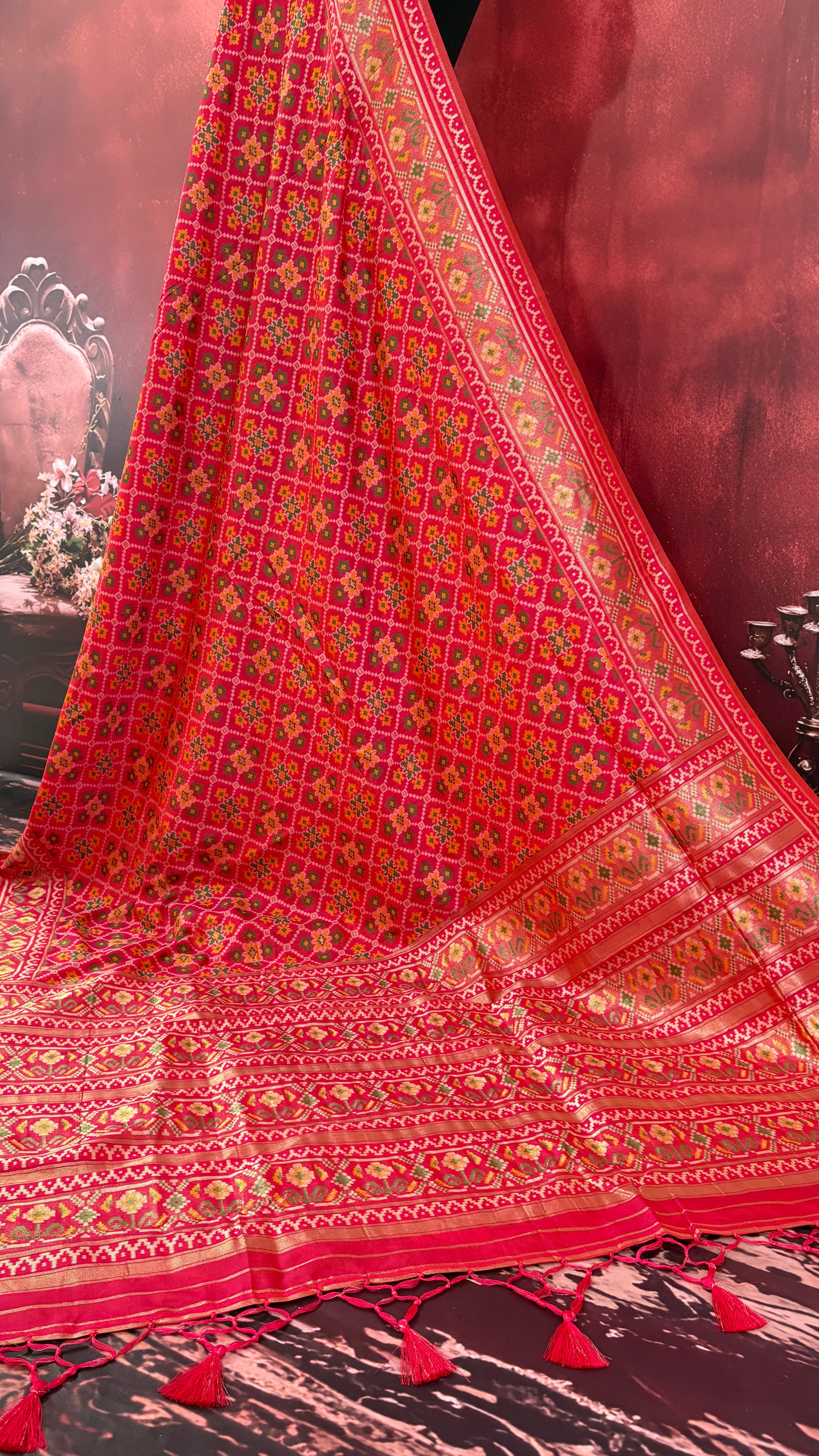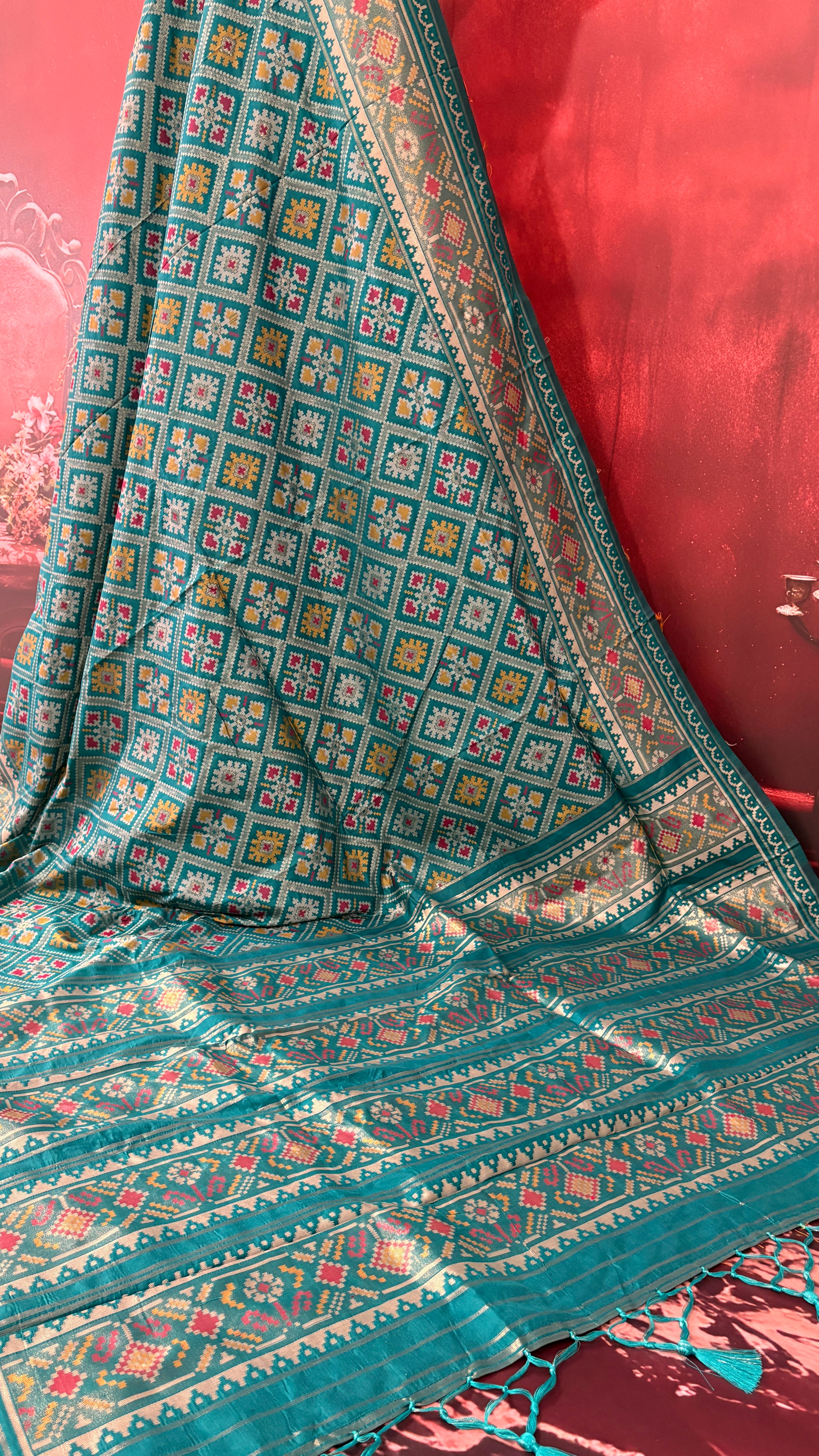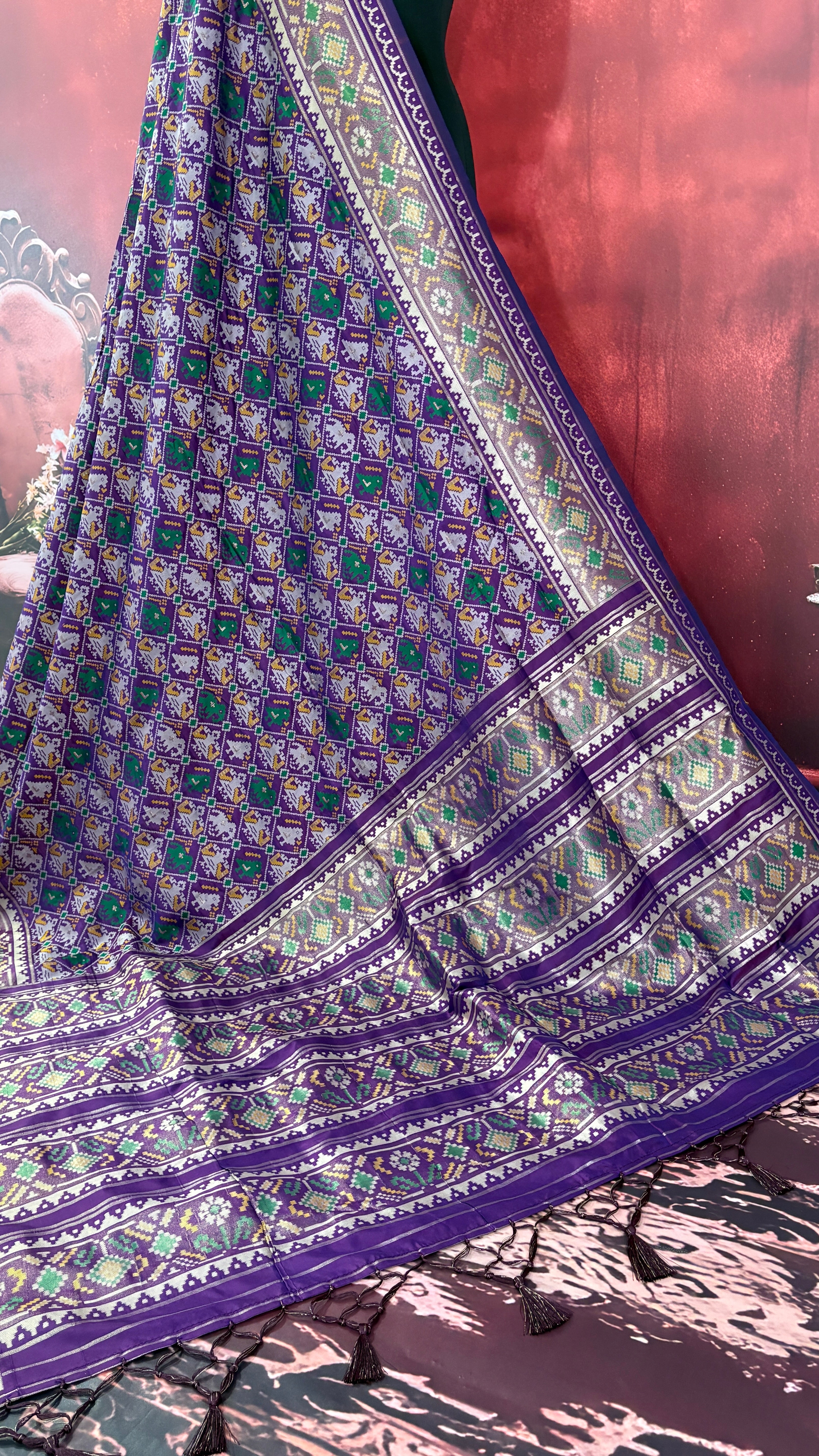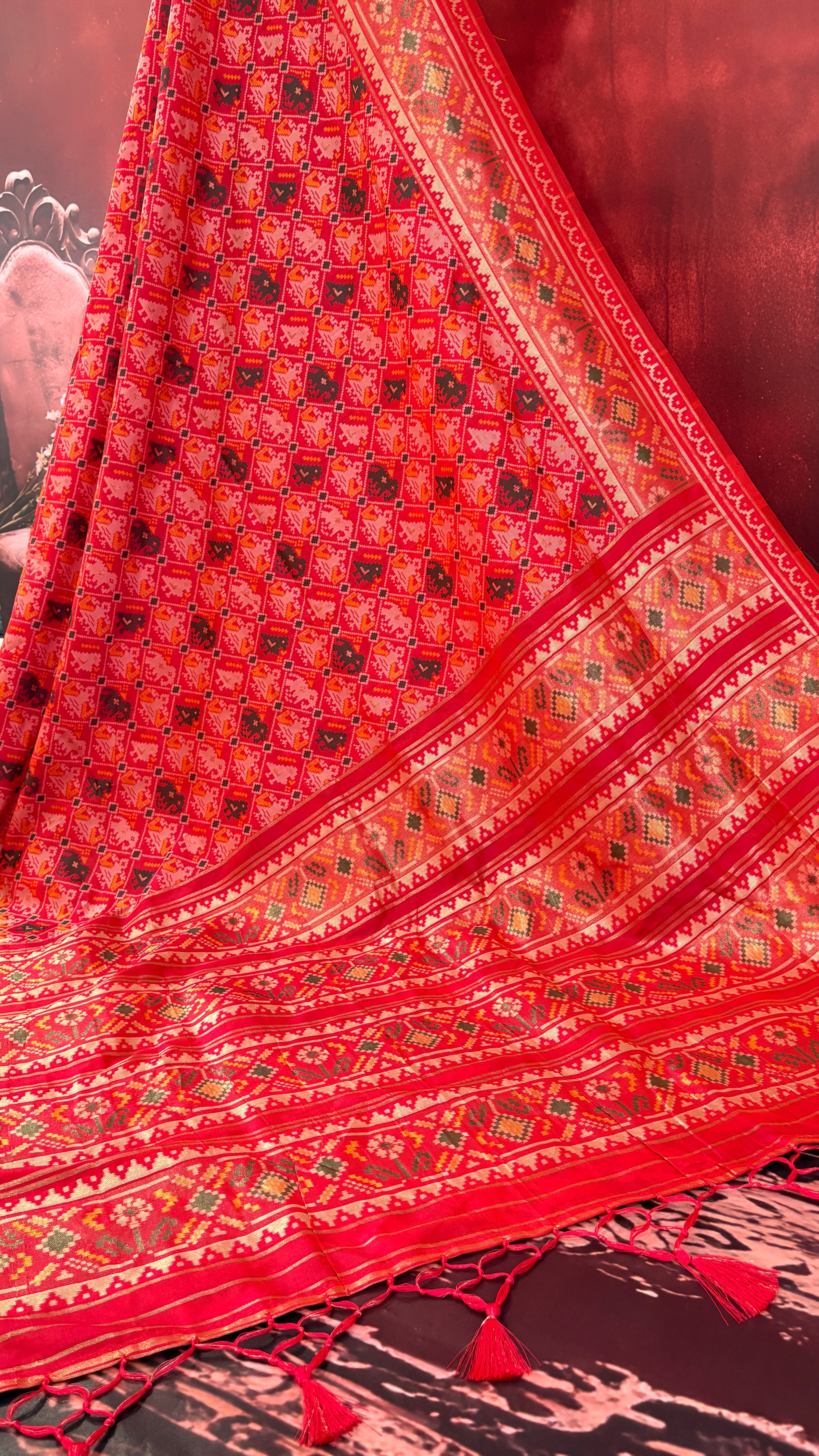 Patola is one of the most prestigious and luxurious handwoven textiles of India, originating from Patan, Gujarat. This exquisite double-ikat weaving technique dates back to the 11th century, once reserved for royalty and aristocrats. Known as the “Queen of Silks,” Patola is admired for its geometric precision, rich colors, and motifs symbolizing prosperity, fertility, and spirituality. What makes Patola unique is the double ikat method – both the warp and weft threads are dyed with exacting precision before weaving, creating identical patterns on both sides of the fabric. This mastery requires months of labor, making each Patola saree a priceless heirloom.