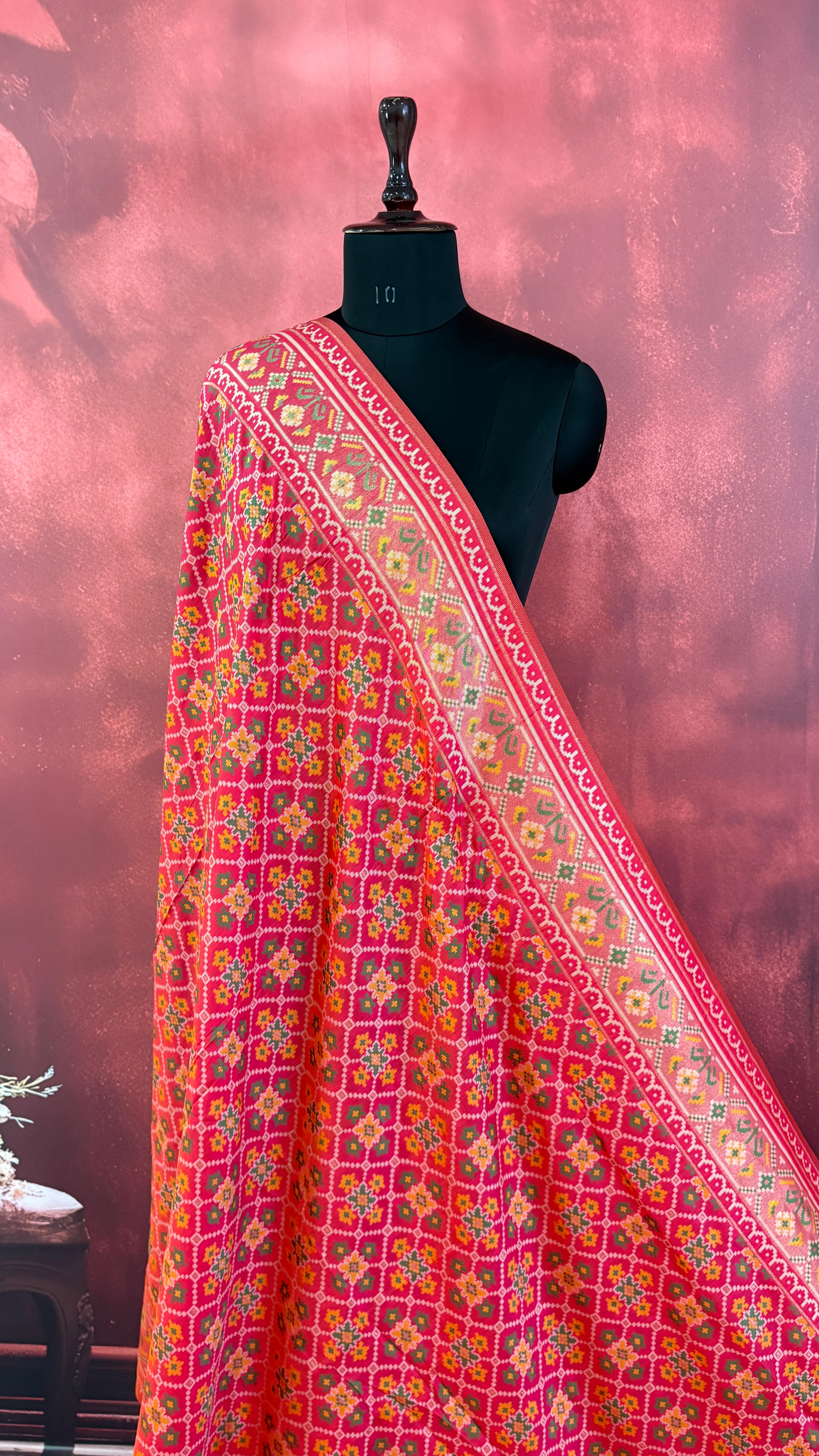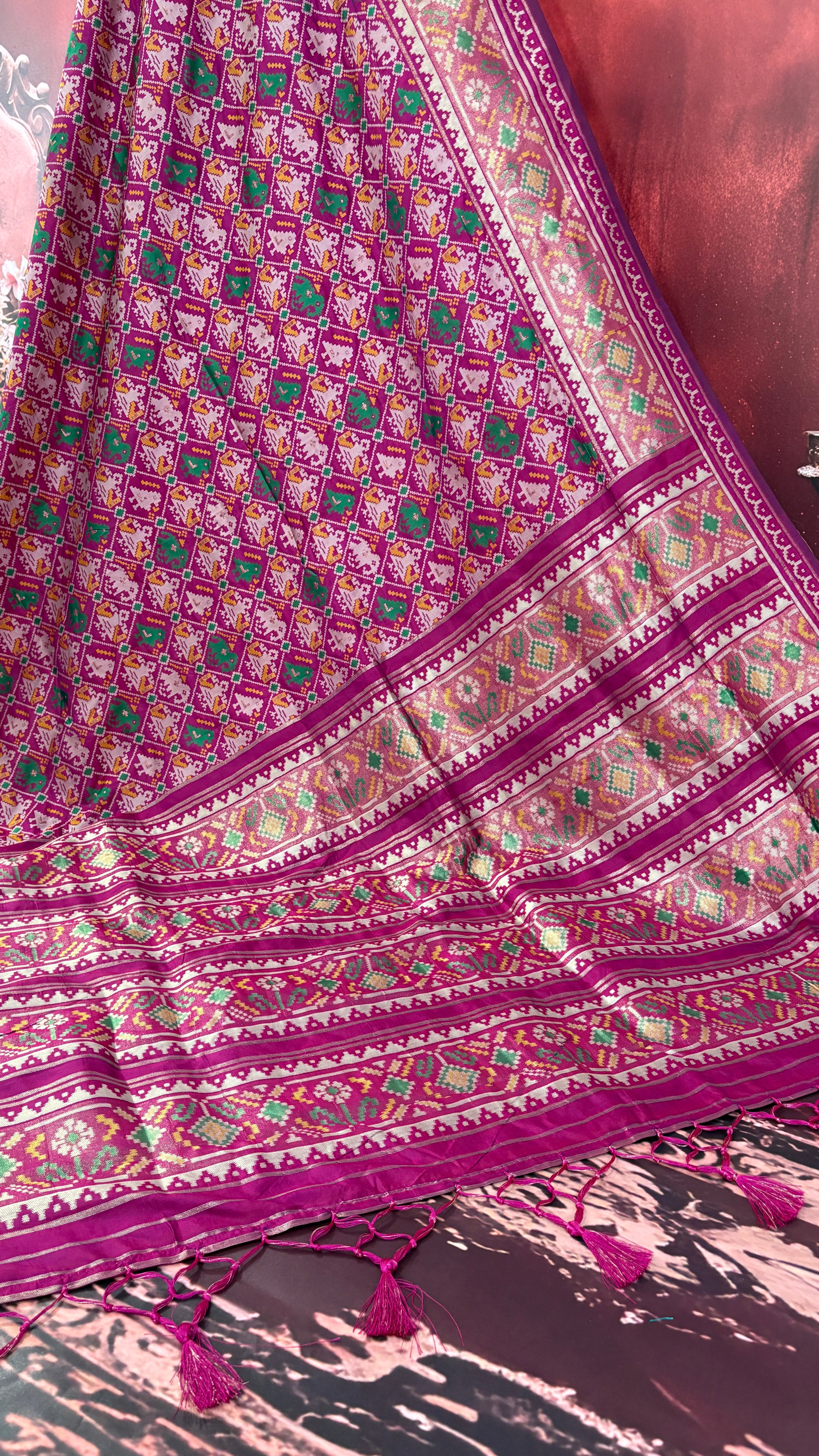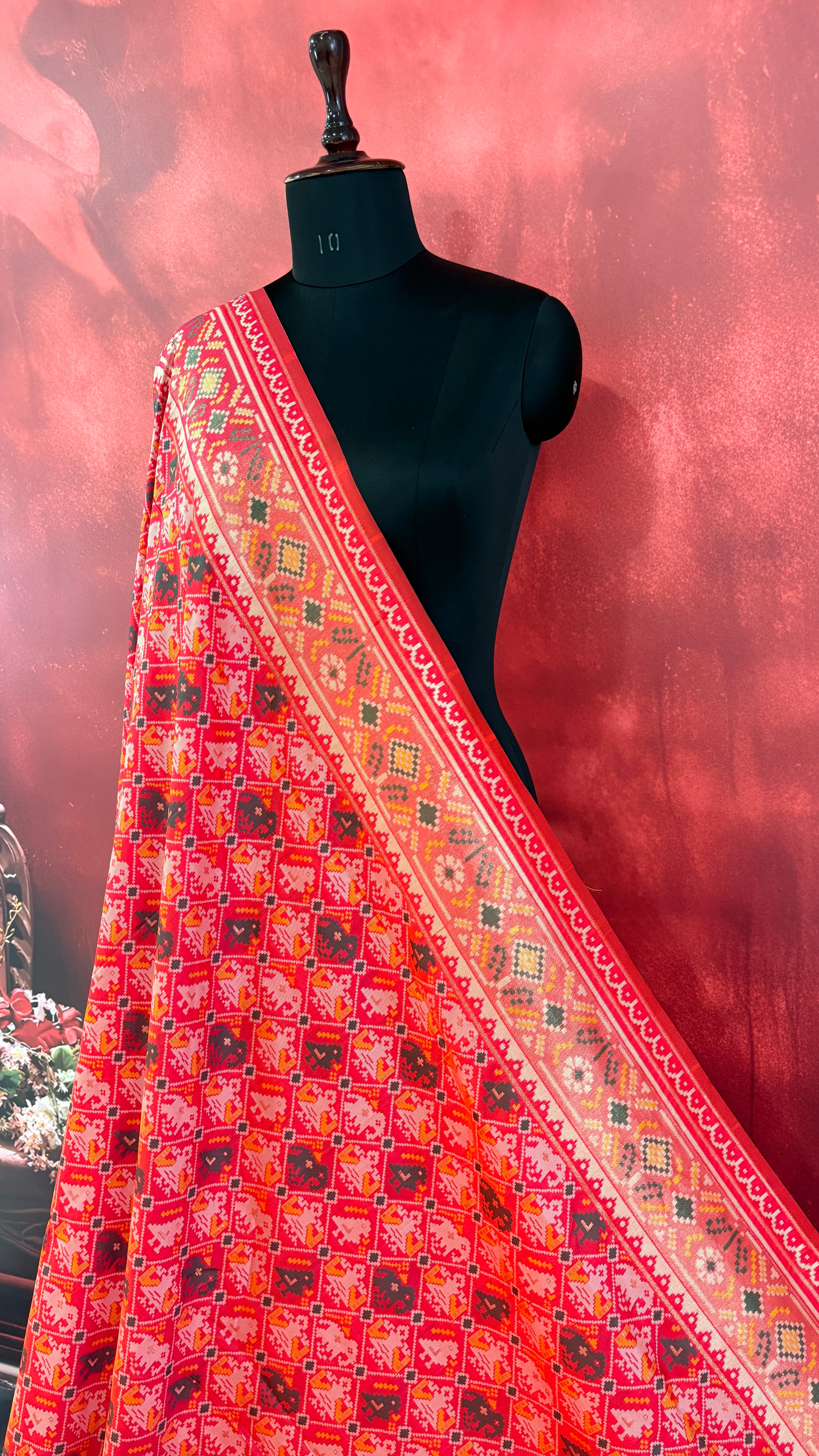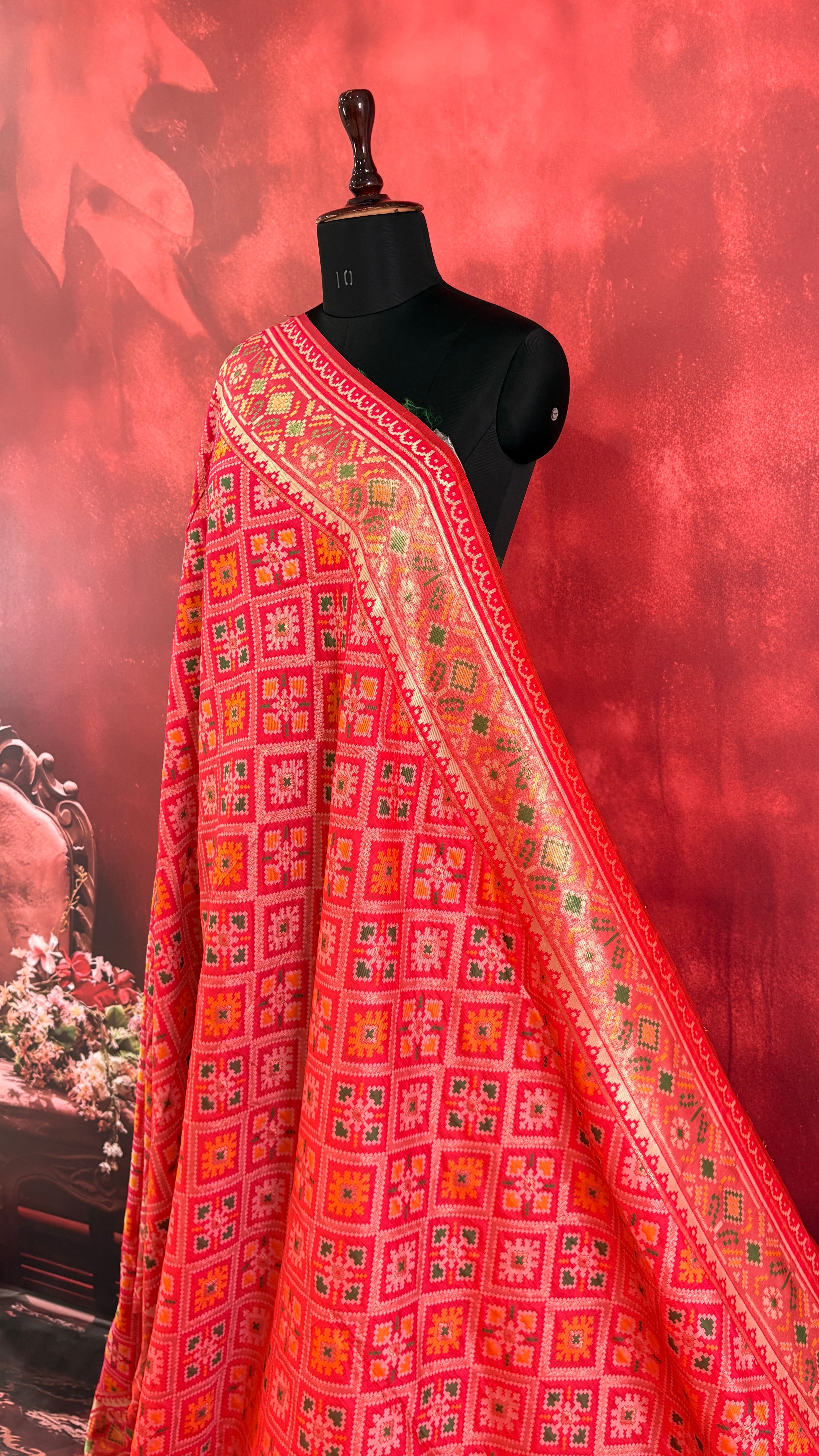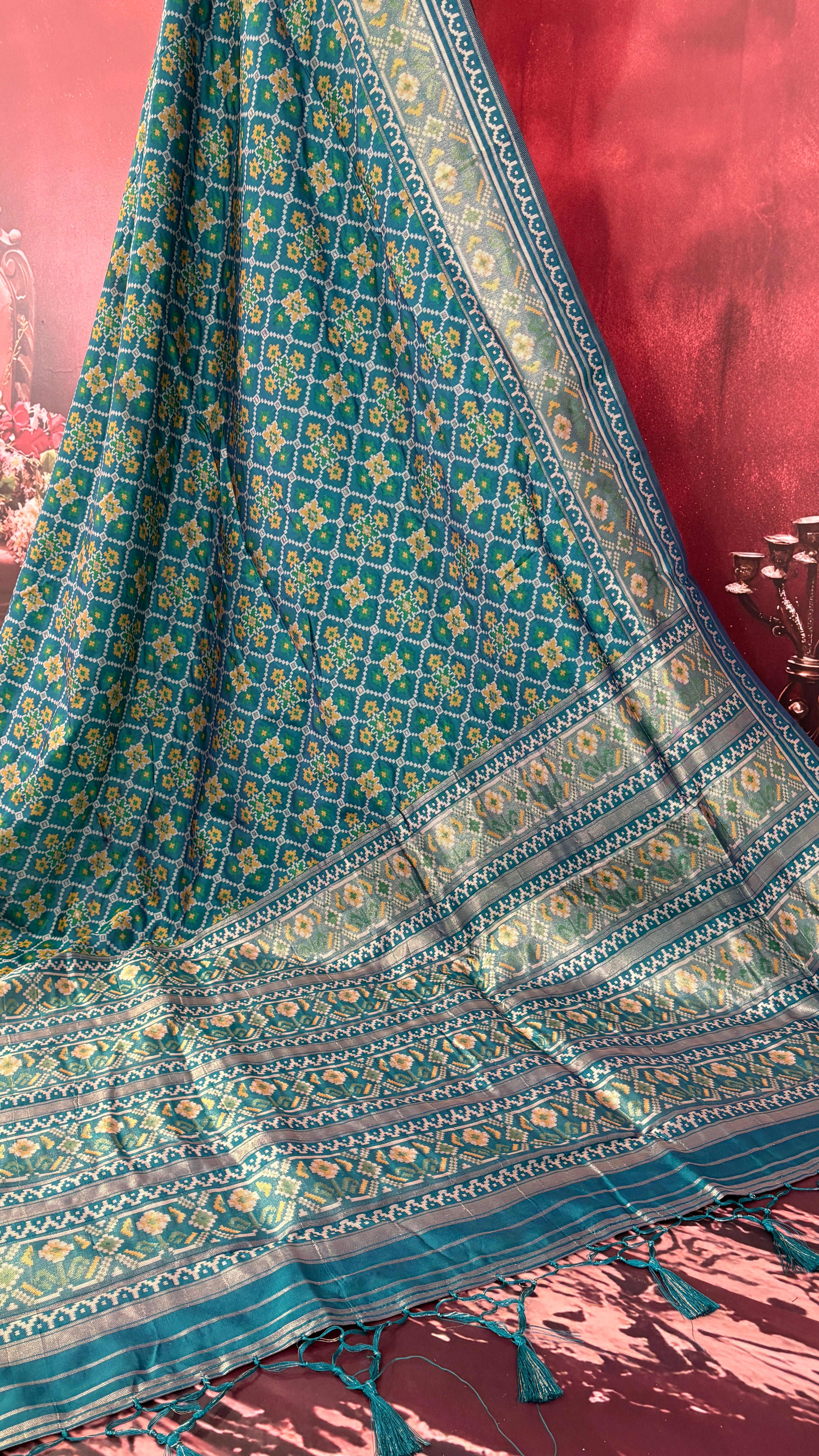 Patola is one of the most prestigious and luxurious handwoven textiles of India, originating from Patan, Gujarat. This exquisite double-ikat weaving technique dates back to the 11th century, once reserved for royalty and aristocrats. Known as the “Queen of Silks,” Patola is admired for its geometric precision, rich colors, and motifs symbolizing prosperity, fertility, and spirituality. What makes Patola unique is the double ikat method – both the warp and weft threads are dyed with exacting precision before weaving, creating identical patterns on both sides of the fabric. This mastery requires months of labor, making each Patola saree a priceless heirloom.