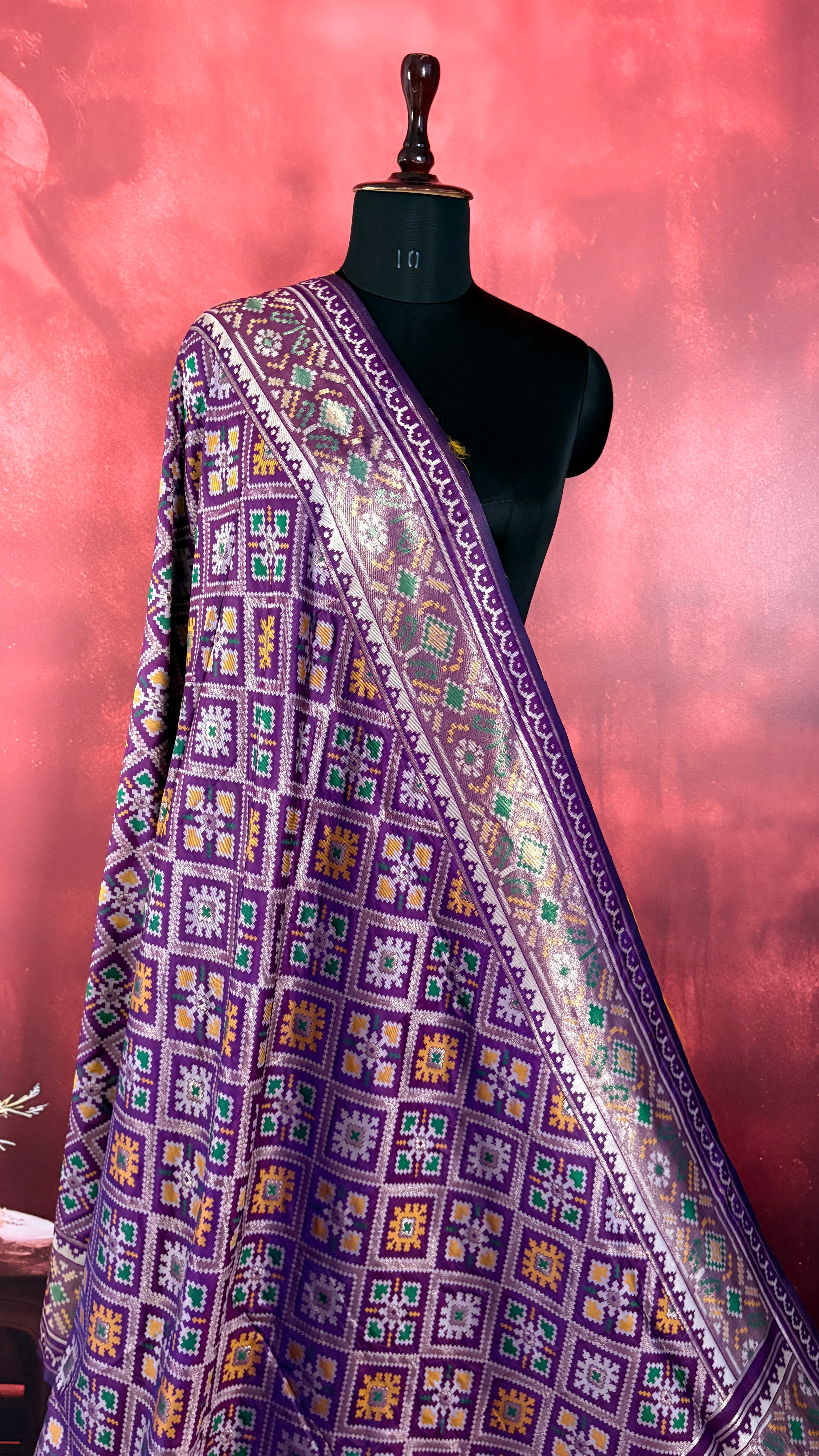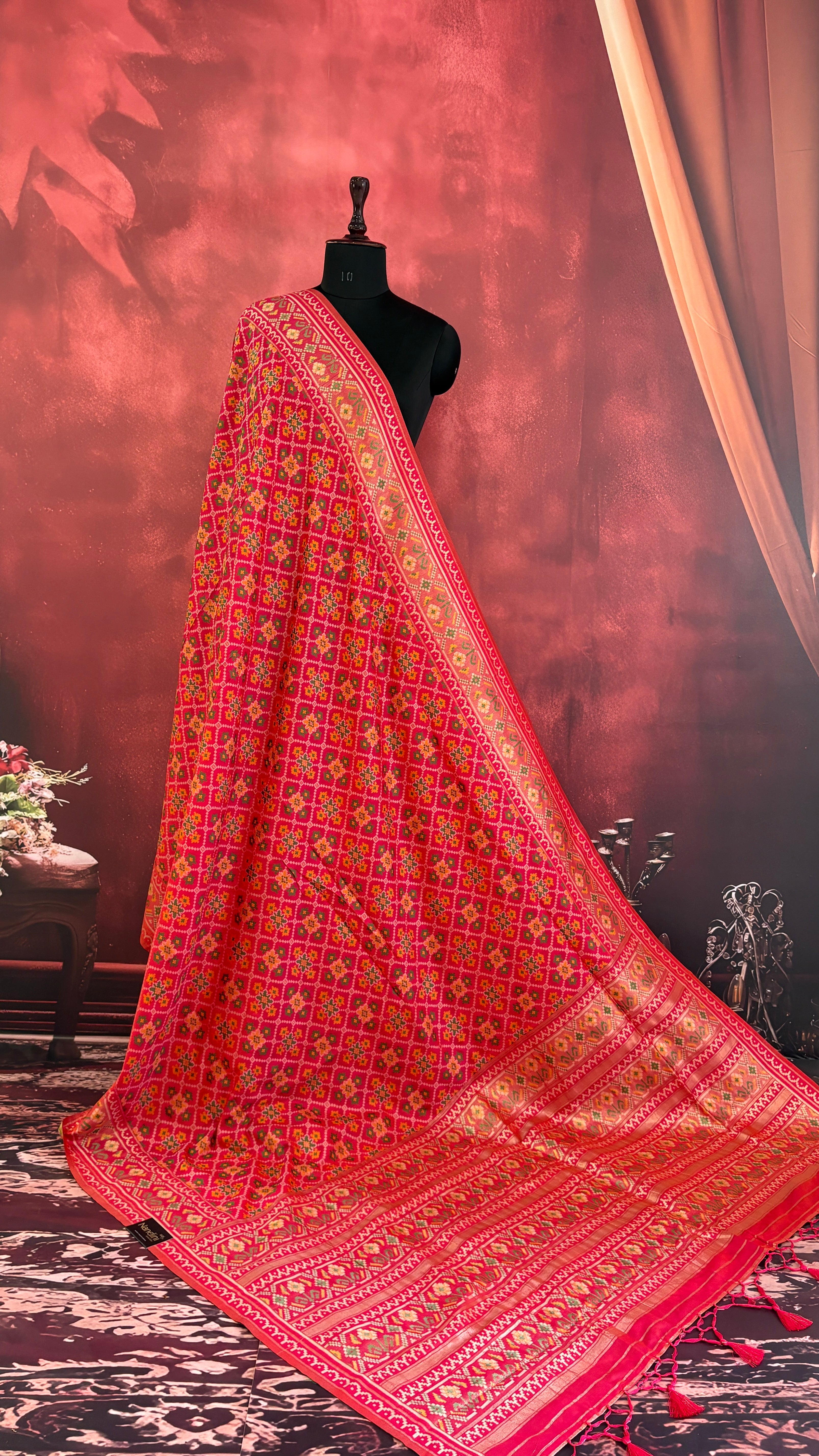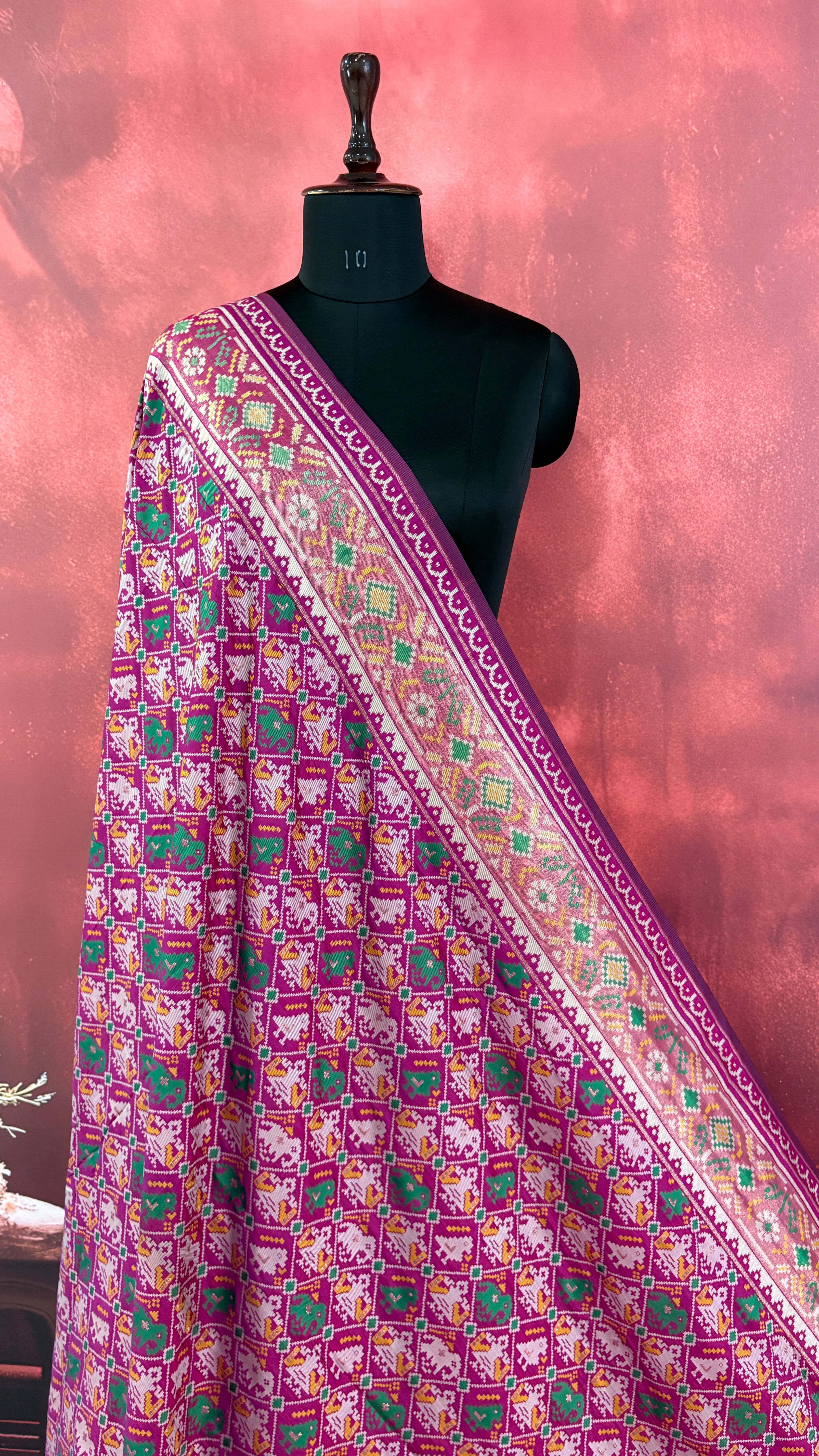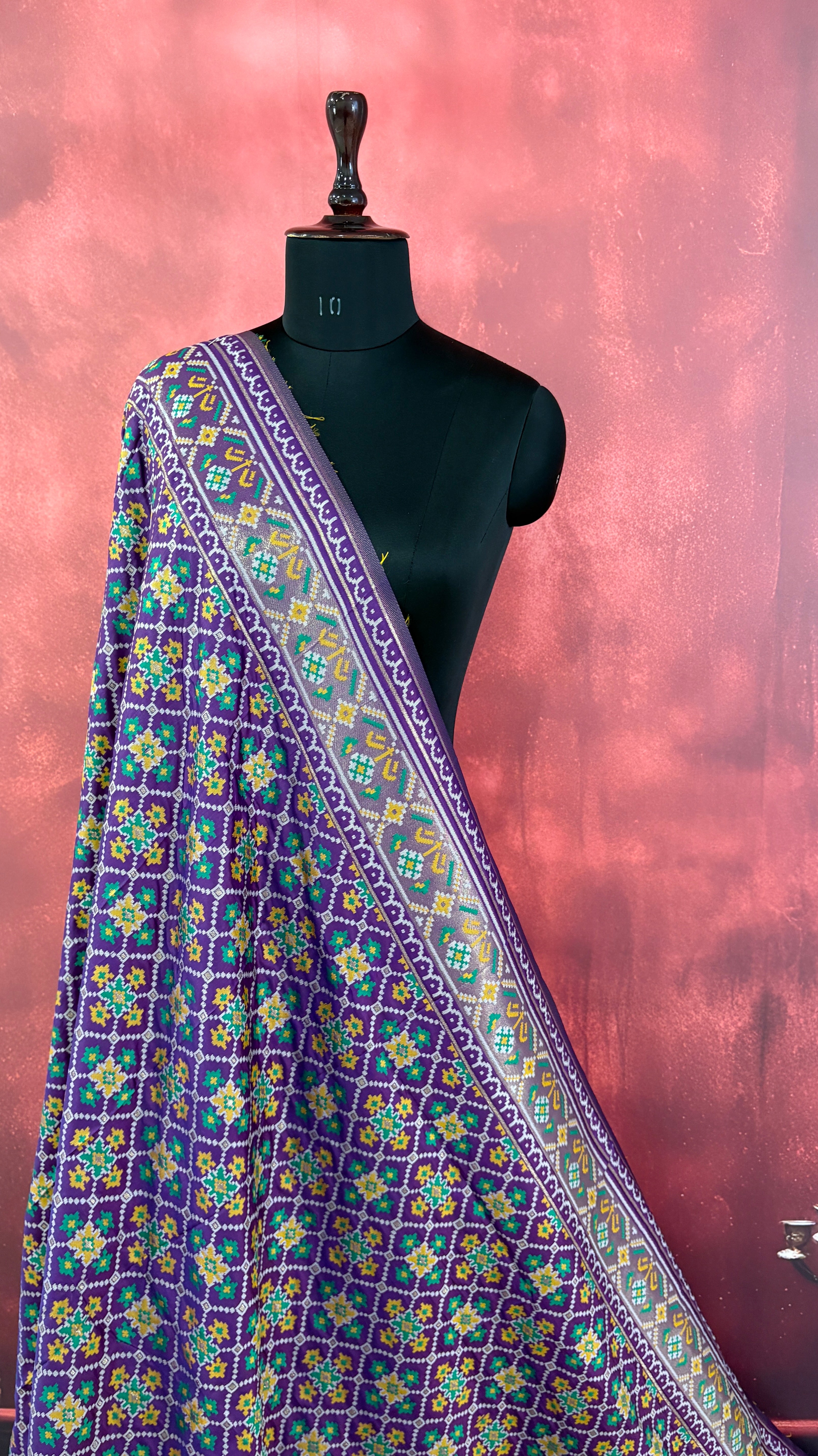 Patola is one of the most prestigious and luxurious handwoven textiles of India, originating from Patan, Gujarat. This exquisite double-ikat weaving technique dates back to the 11th century, once reserved for royalty and aristocrats. Known as the “Queen of Silks,” Patola is admired for its geometric precision, rich colors, and motifs symbolizing prosperity, fertility, and spirituality. What makes Patola unique is the double ikat method – both the warp and weft threads are dyed with exacting precision before weaving, creating identical patterns on both sides of the fabric. This mastery requires months of labor, making each Patola saree a priceless heirloom.