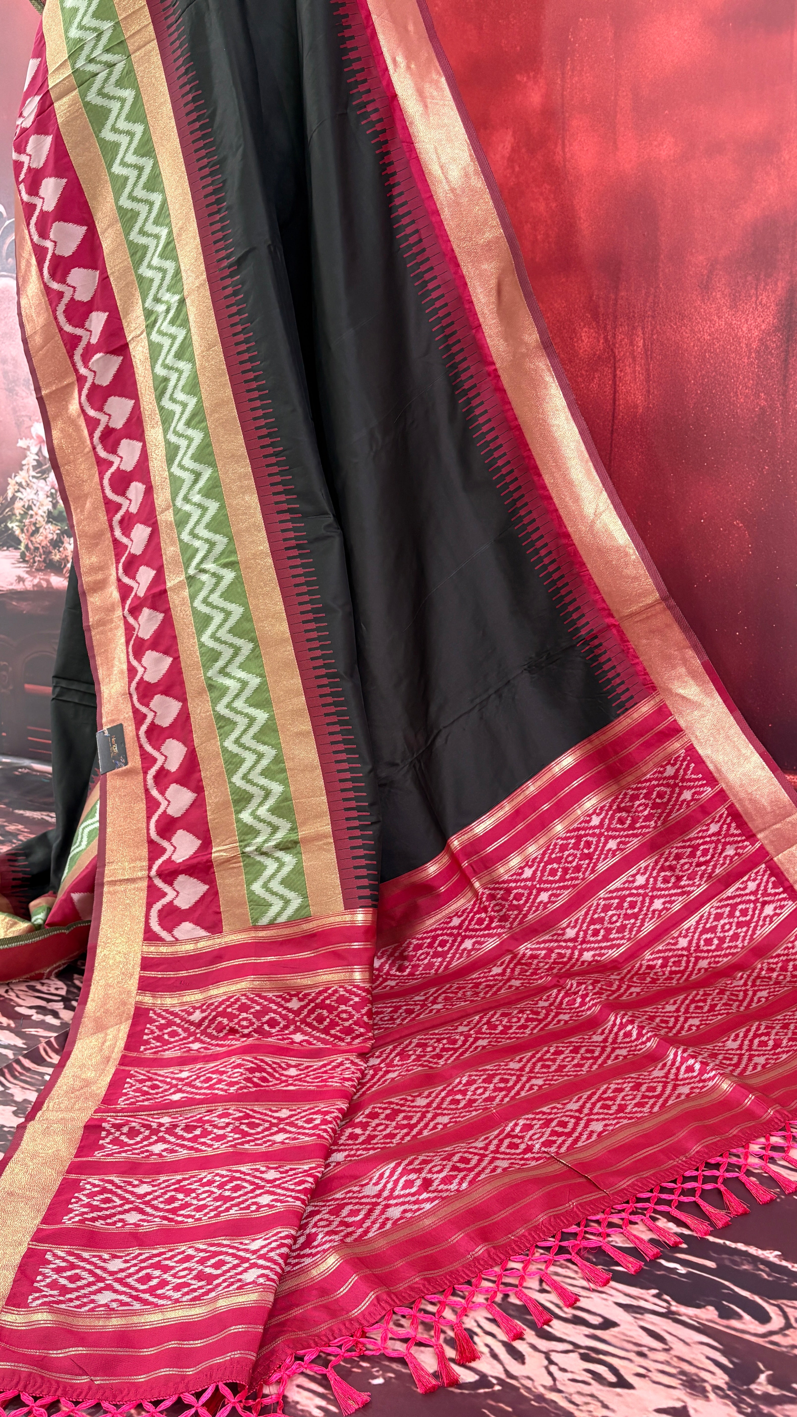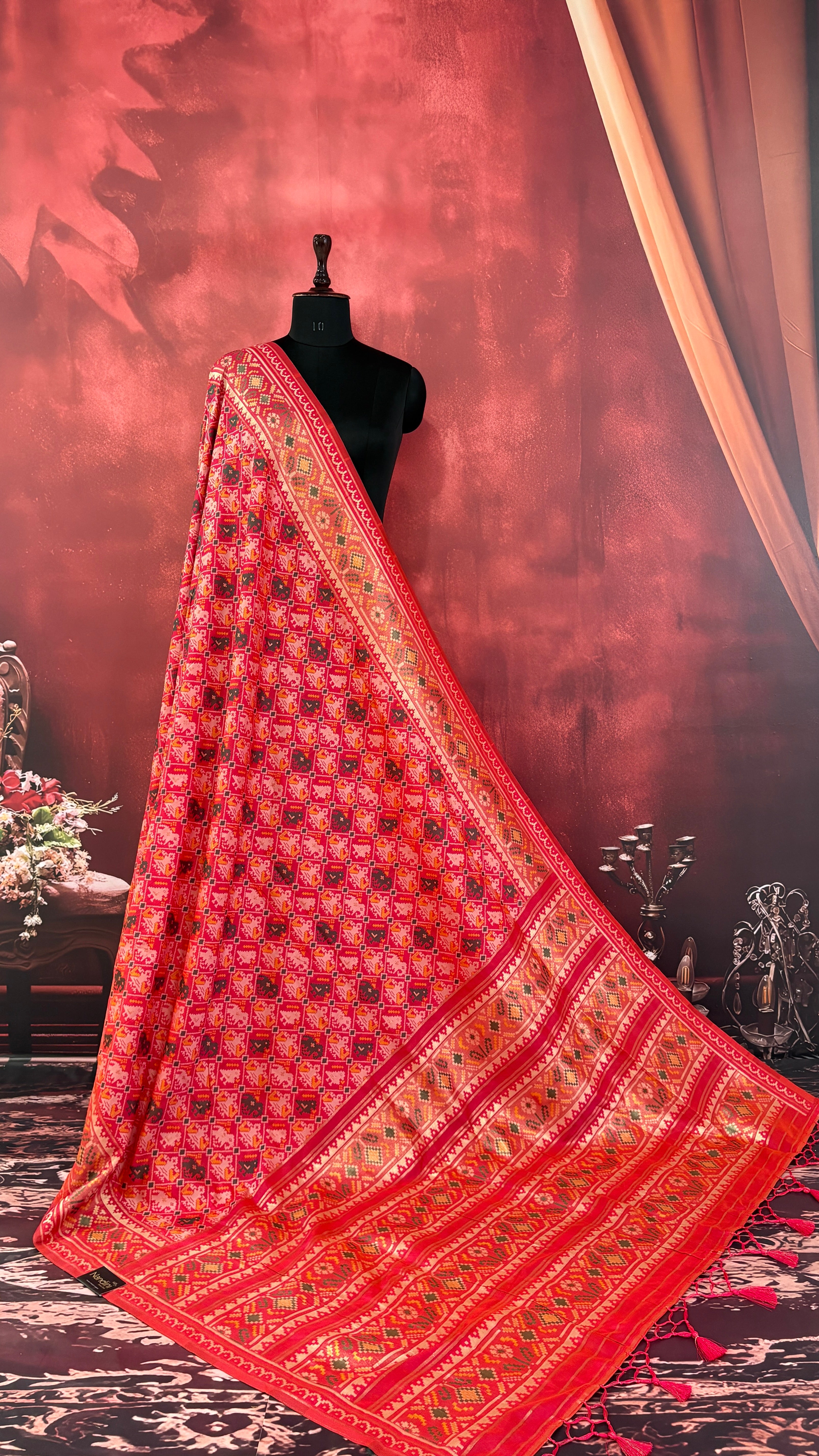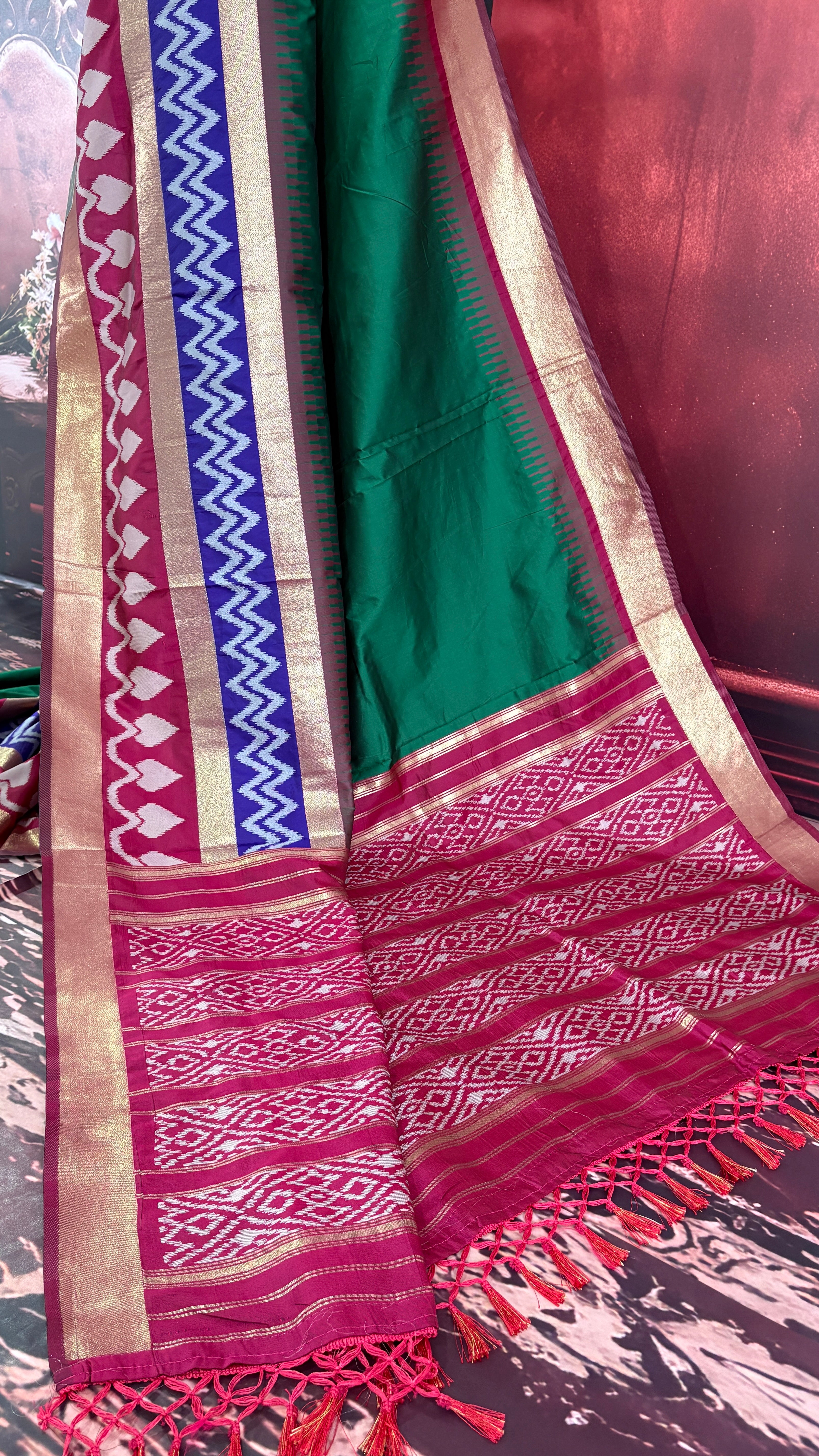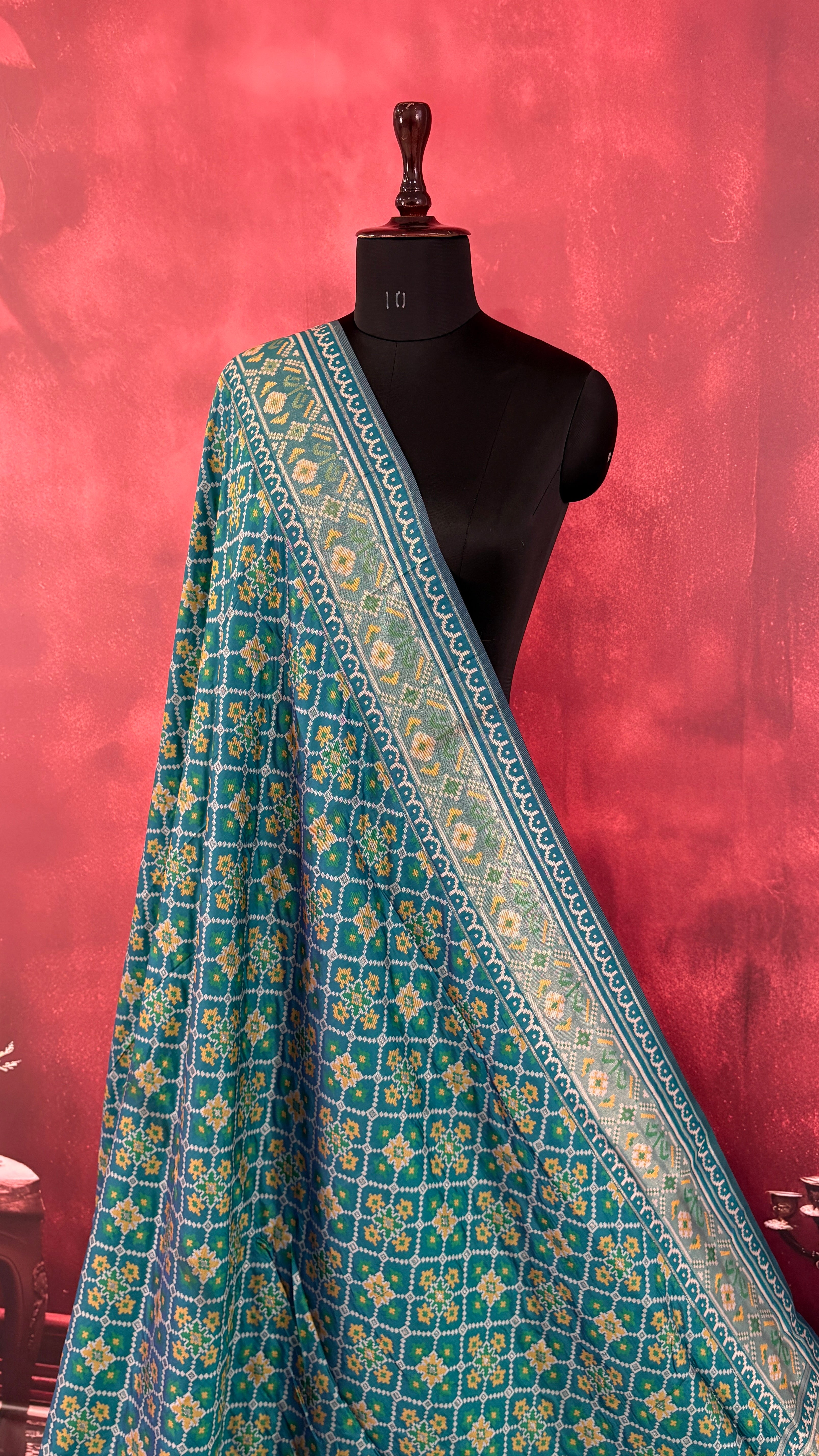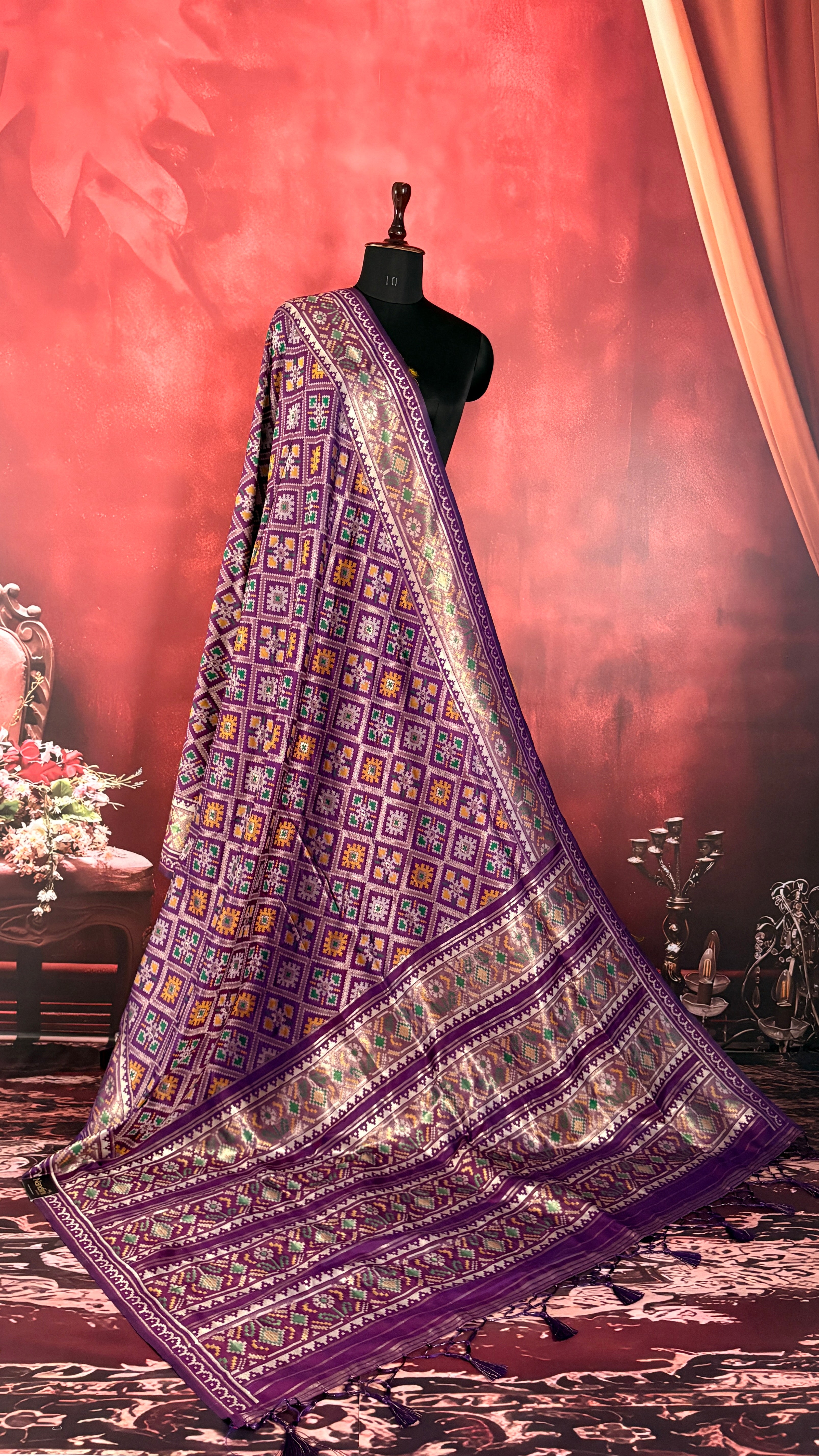 Patola is one of the most prestigious and luxurious handwoven textiles of India, originating from Patan, Gujarat. This exquisite double-ikat weaving technique dates back to the 11th century, once reserved for royalty and aristocrats. Known as the “Queen of Silks,” Patola is admired for its geometric precision, rich colors, and motifs symbolizing prosperity, fertility, and spirituality. What makes Patola unique is the double ikat method – both the warp and weft threads are dyed with exacting precision before weaving, creating identical patterns on both sides of the fabric. This mastery requires months of labor, making each Patola saree a priceless heirloom.