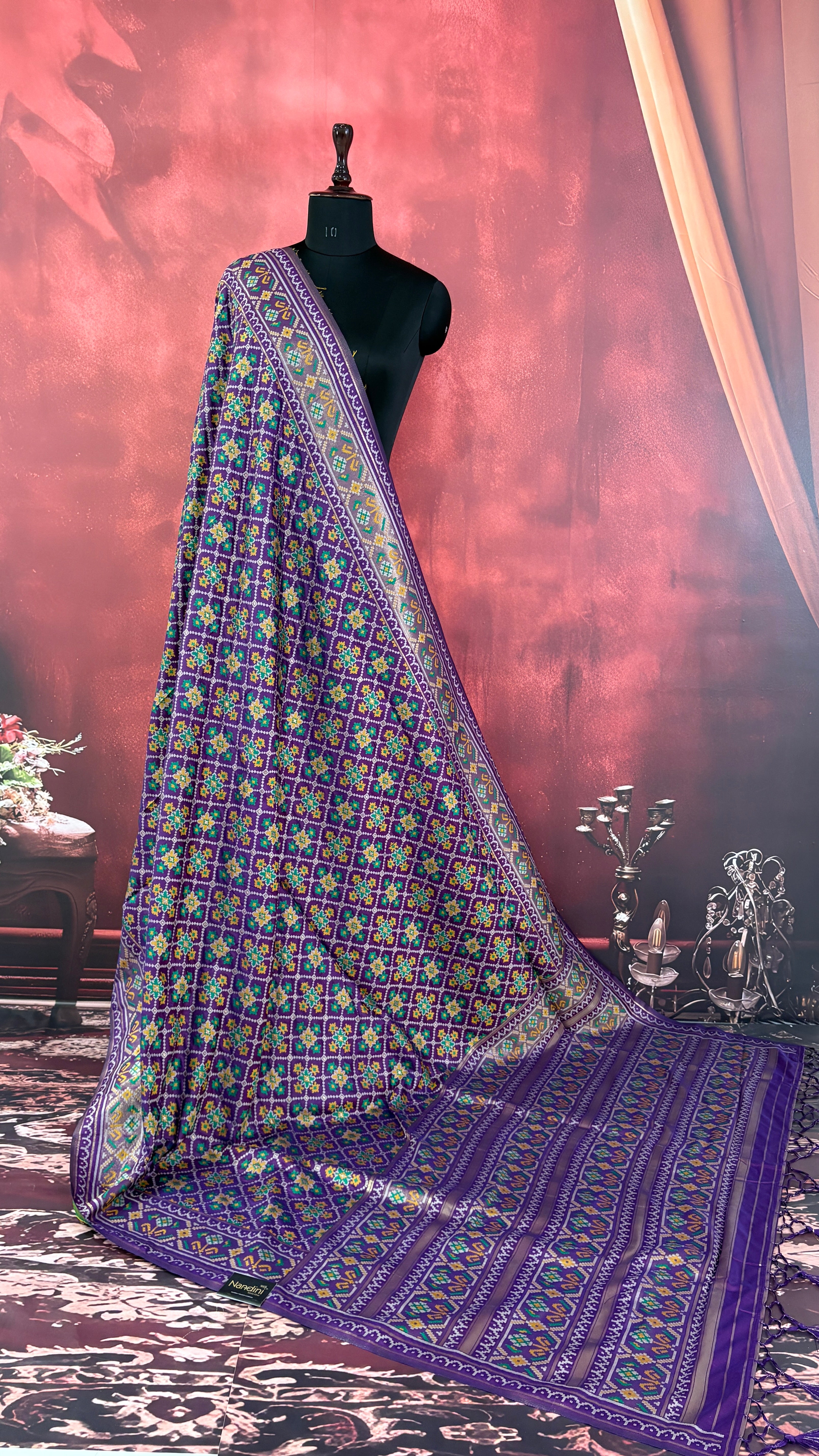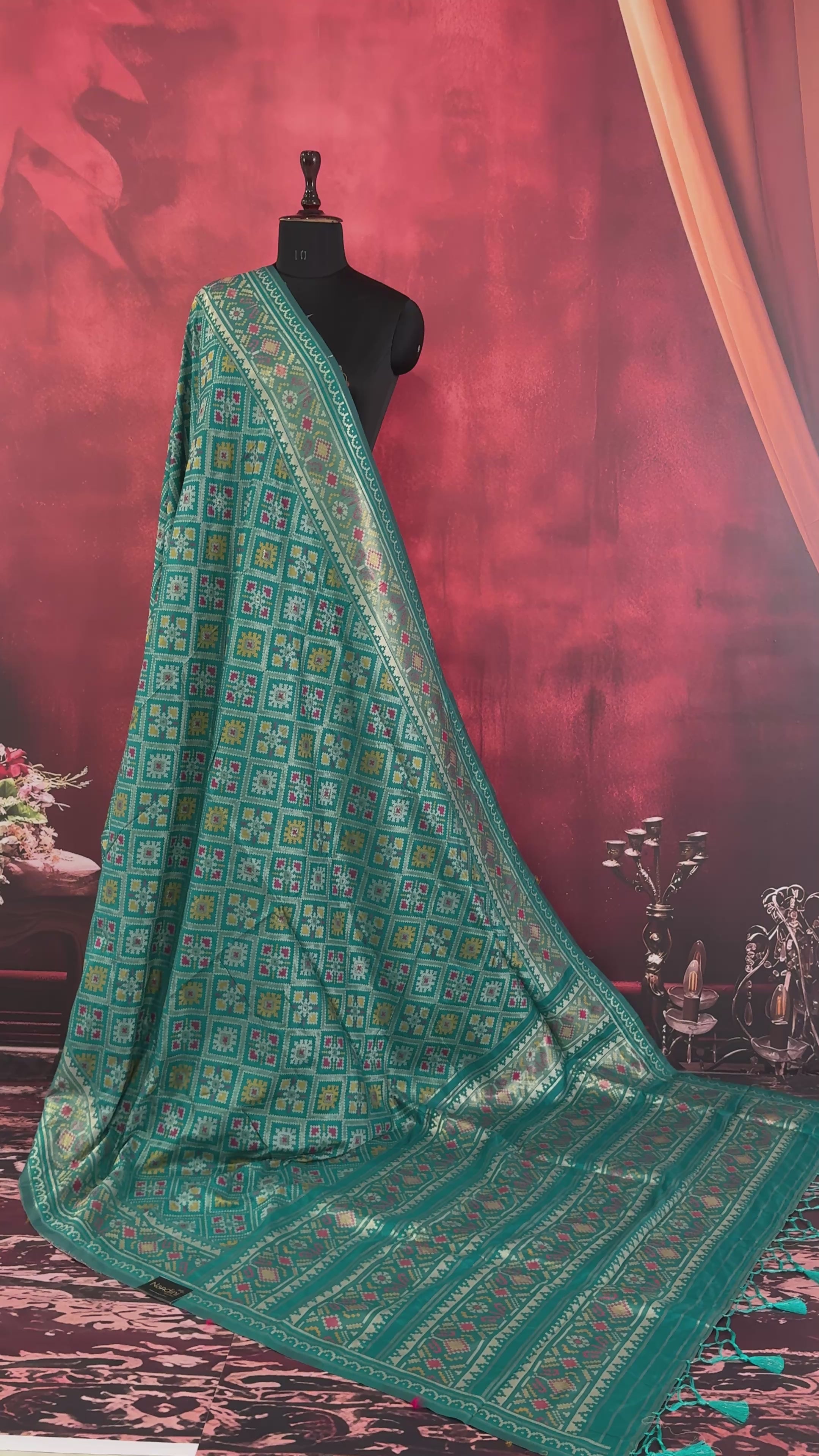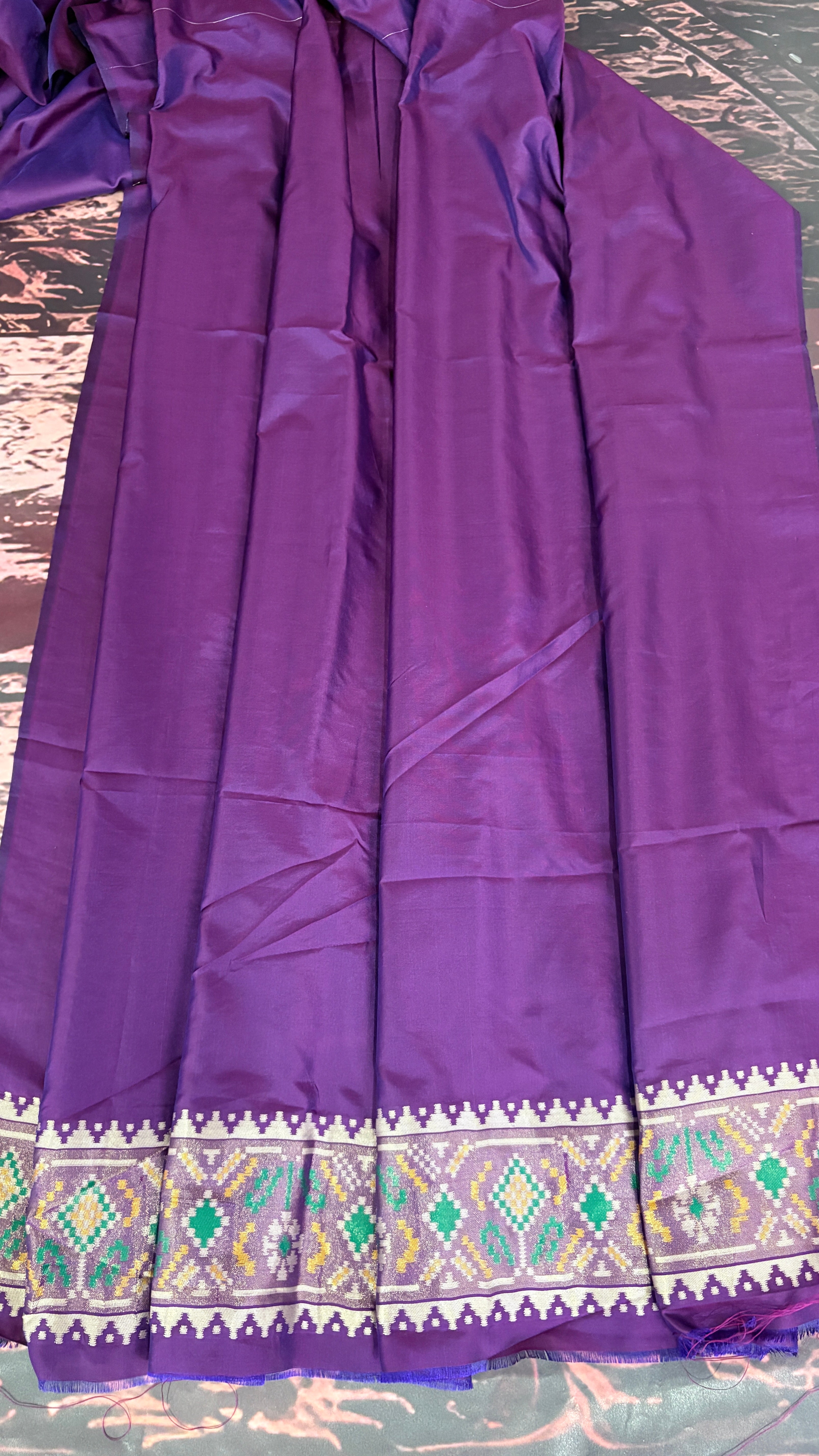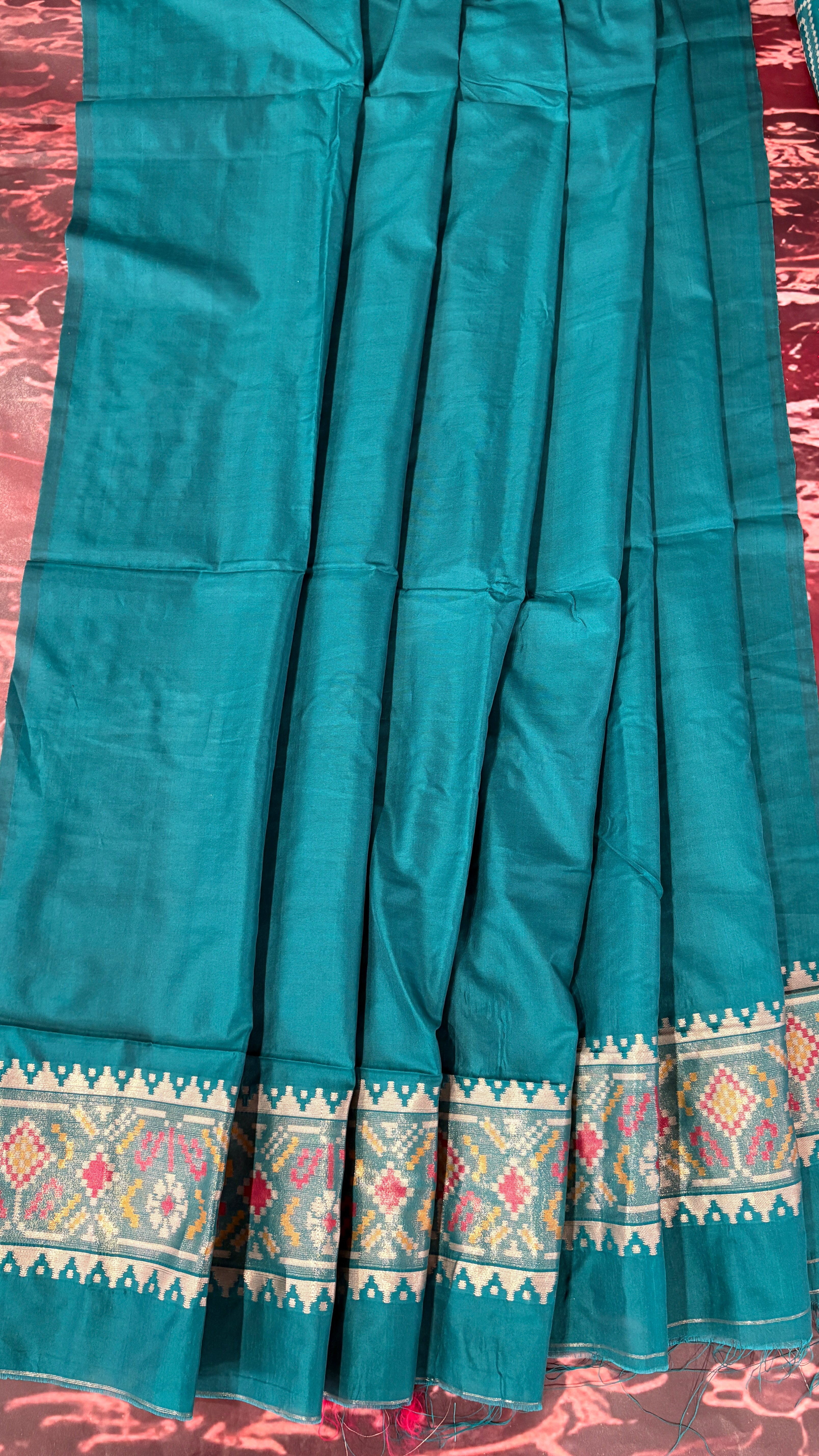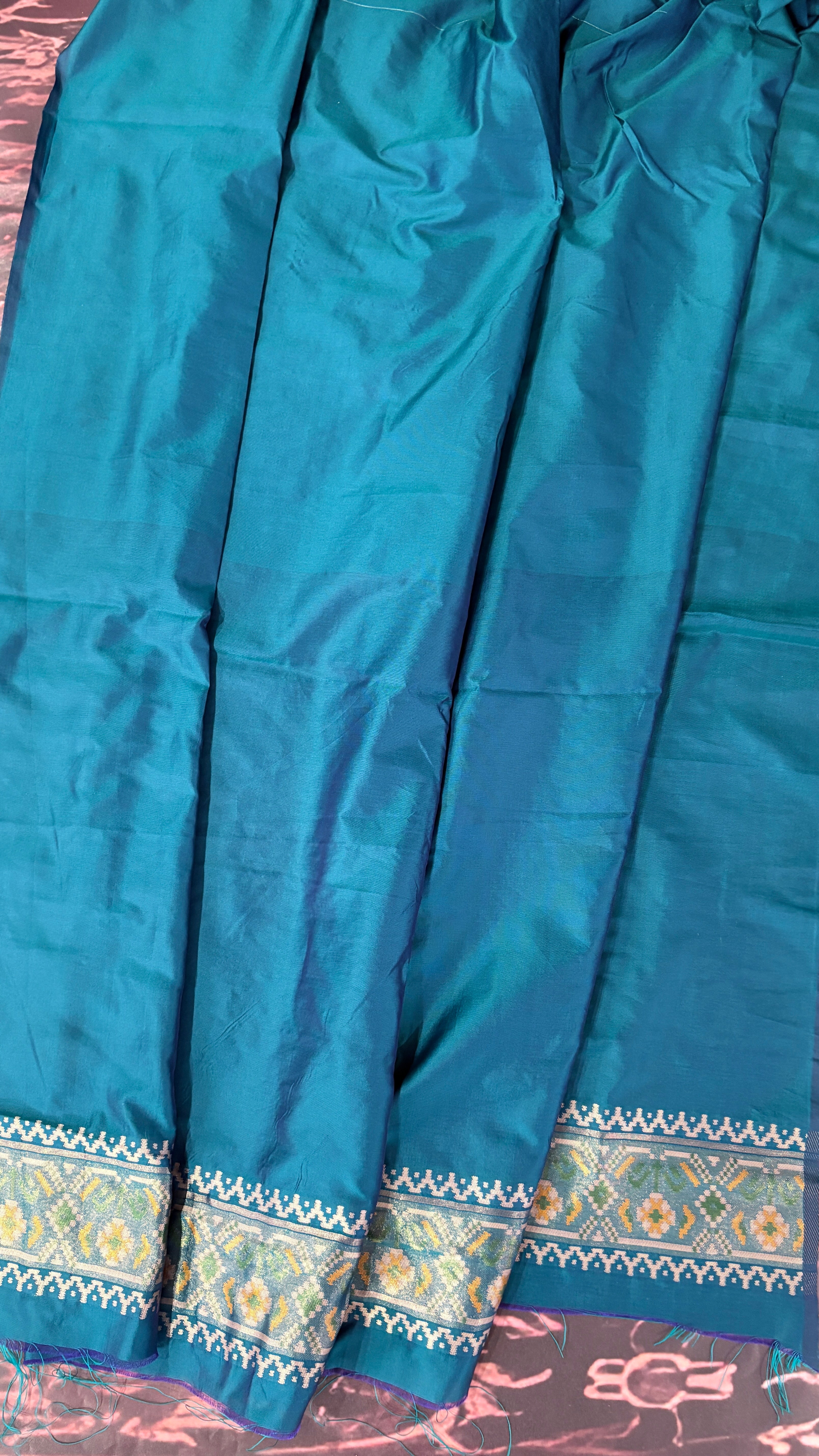 Patola is one of the most prestigious and luxurious handwoven textiles of India, originating from Patan, Gujarat. This exquisite double-ikat weaving technique dates back to the 11th century, once reserved for royalty and aristocrats. Known as the “Queen of Silks,” Patola is admired for its geometric precision, rich colors, and motifs symbolizing prosperity, fertility, and spirituality. What makes Patola unique is the double ikat method – both the warp and weft threads are dyed with exacting precision before weaving, creating identical patterns on both sides of the fabric. This mastery requires months of labor, making each Patola saree a priceless heirloom.