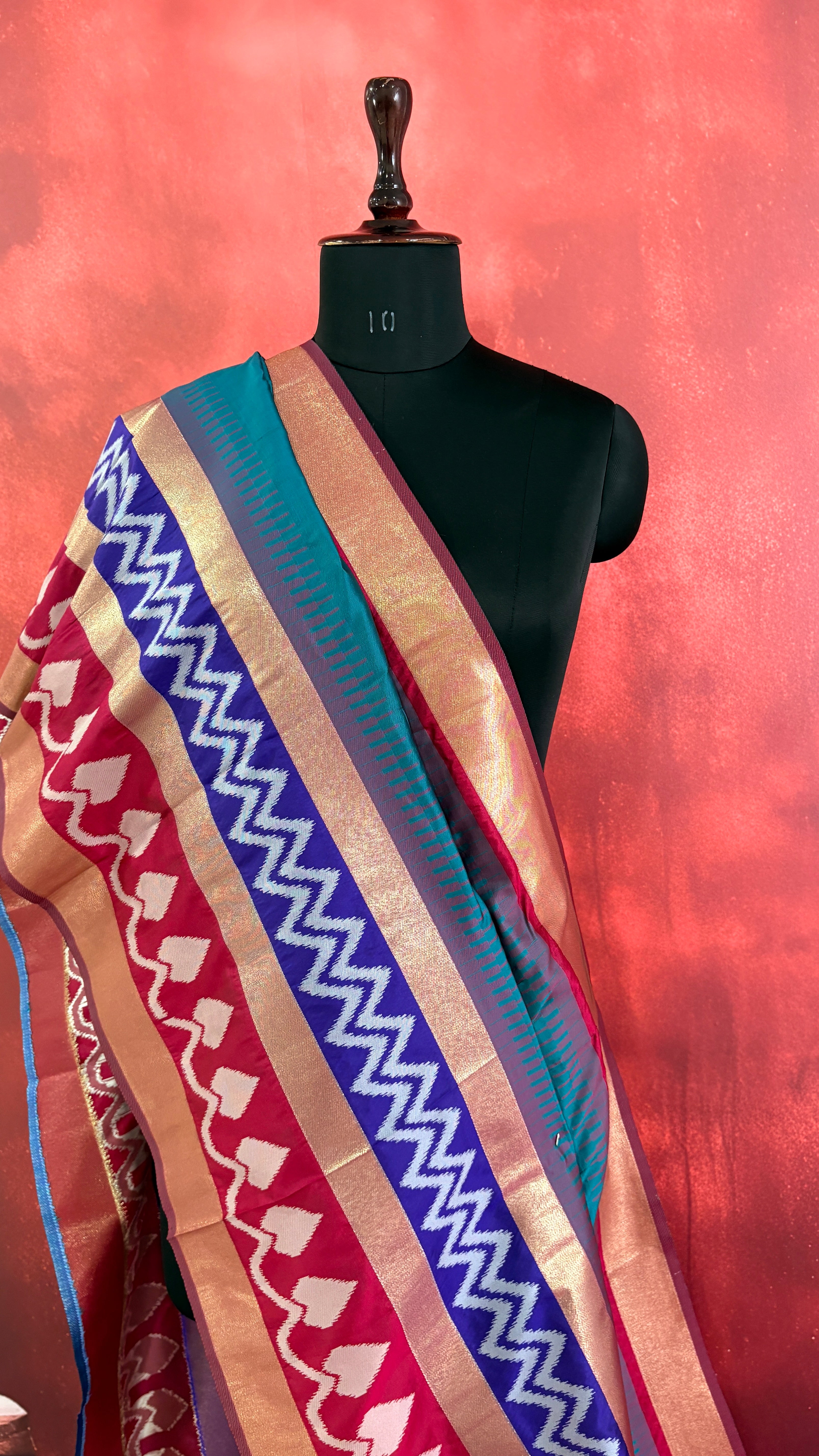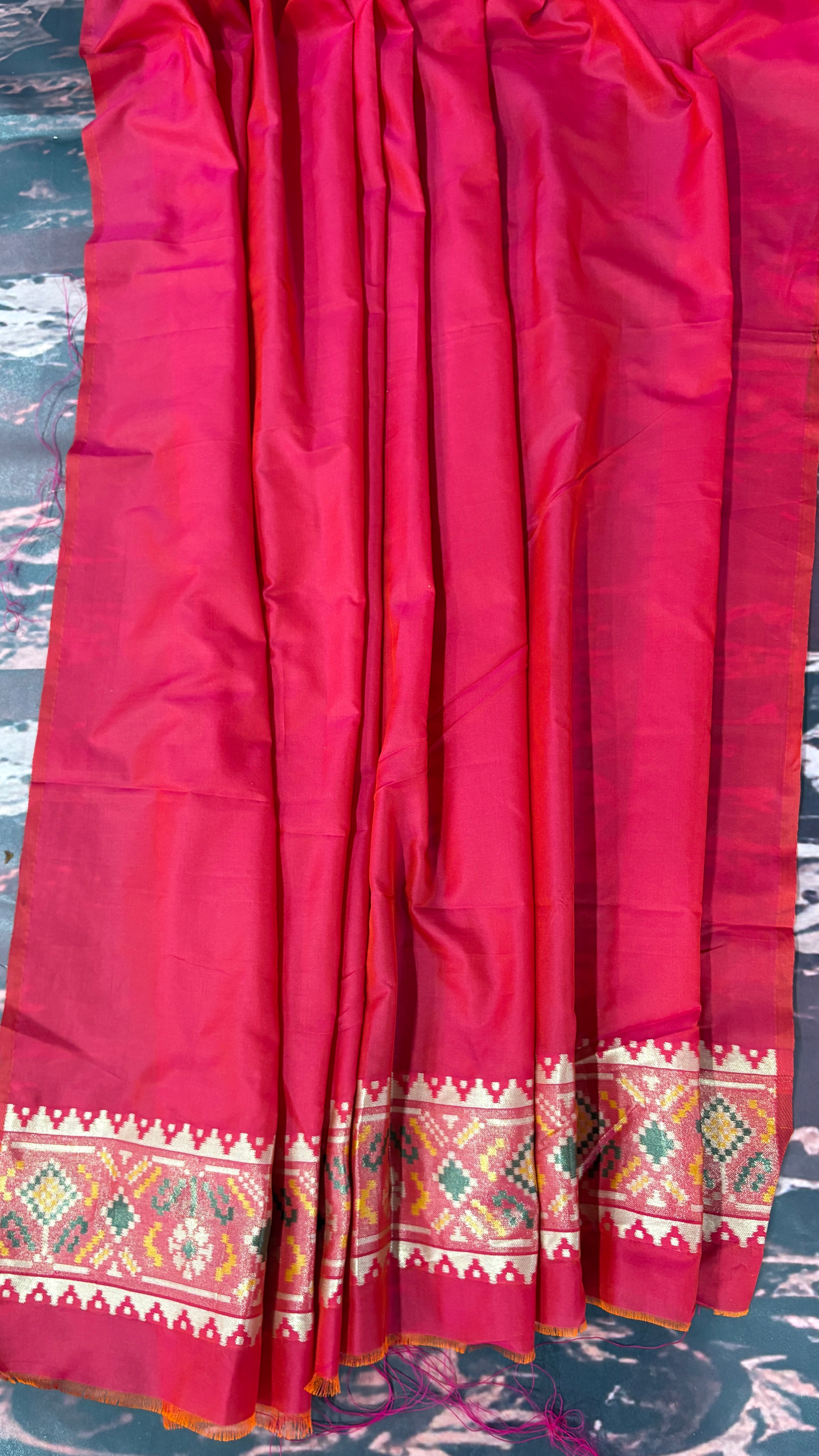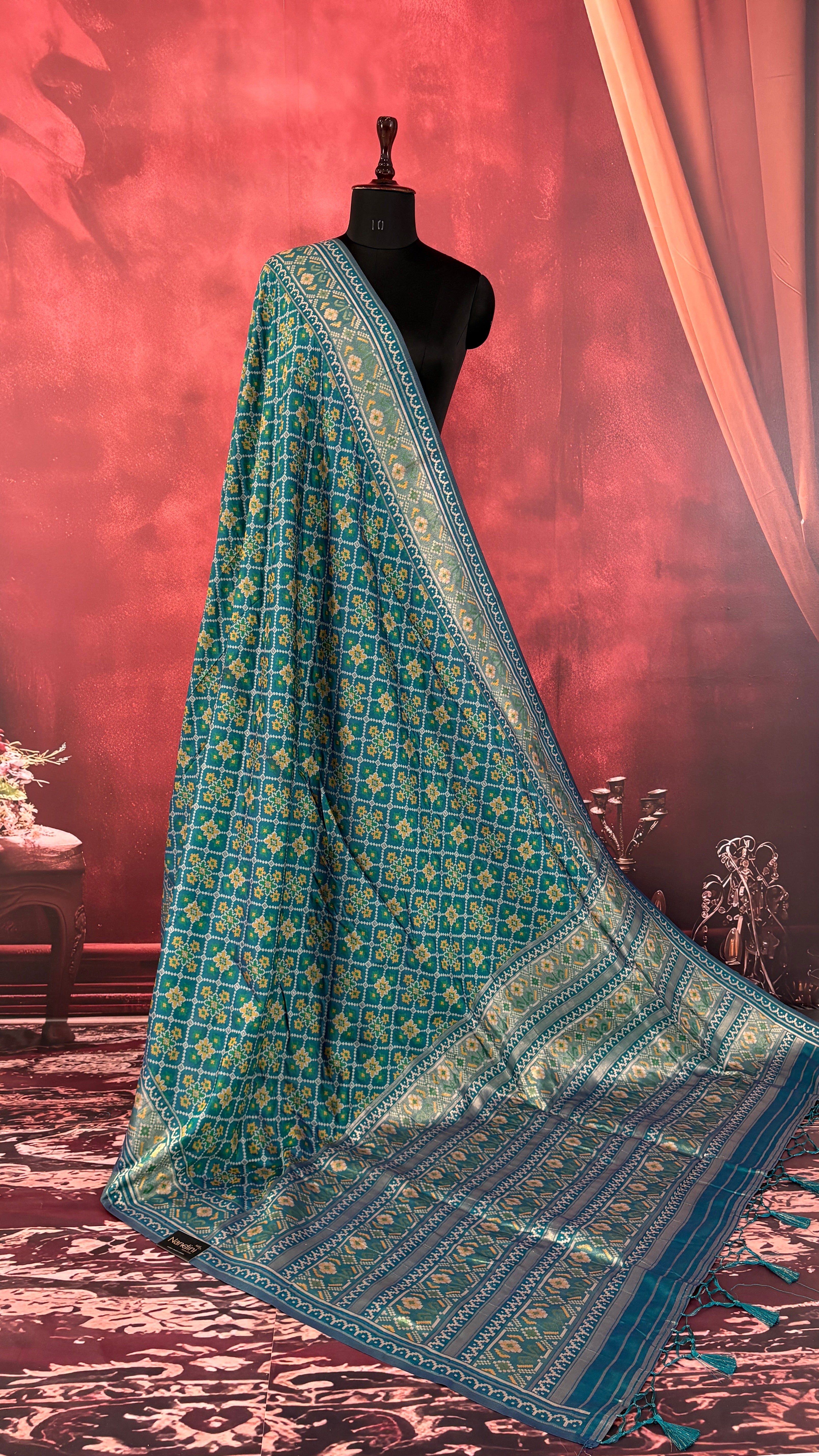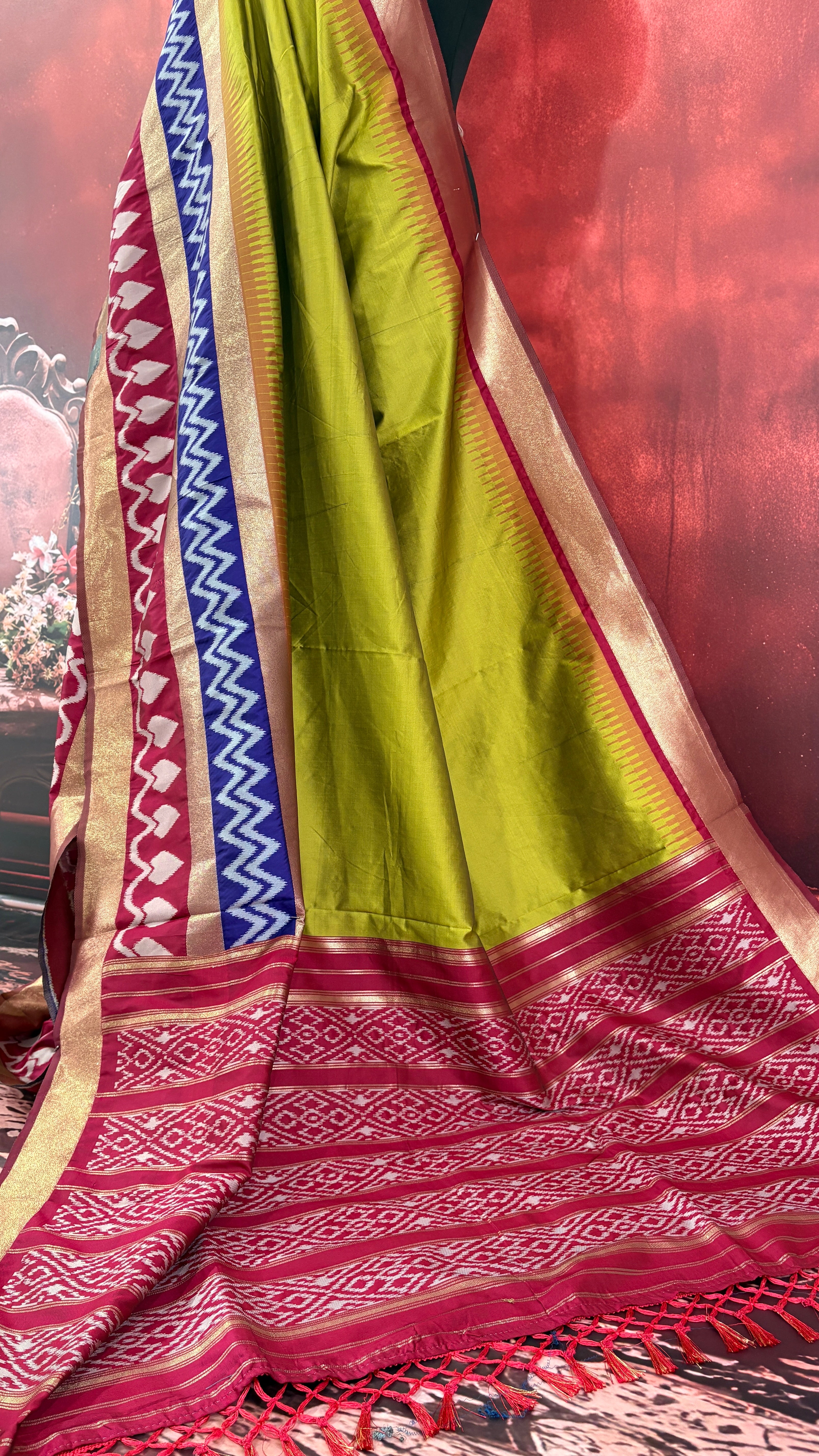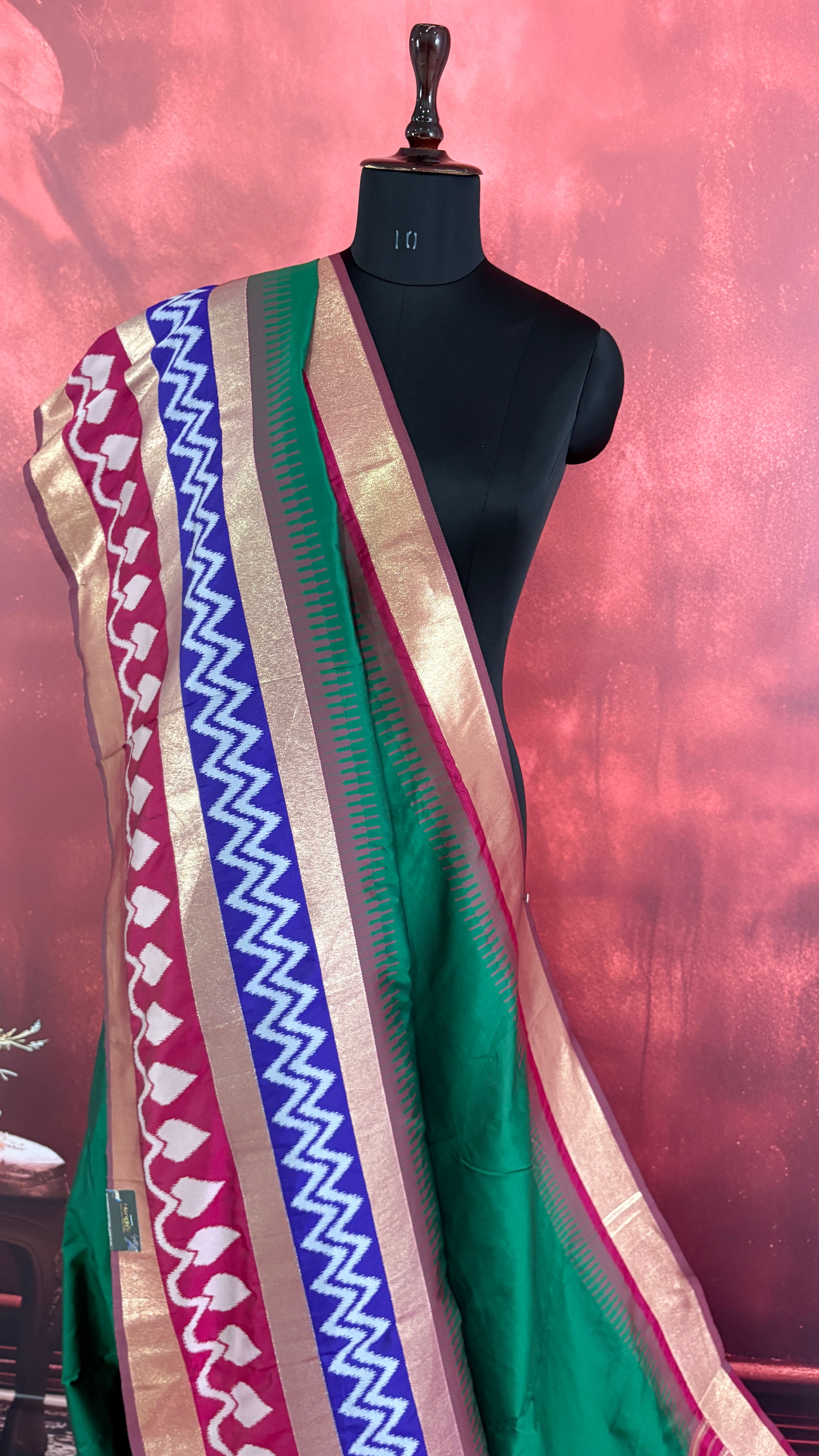 Patola is one of the most prestigious and luxurious handwoven textiles of India, originating from Patan, Gujarat. This exquisite double-ikat weaving technique dates back to the 11th century, once reserved for royalty and aristocrats. Known as the “Queen of Silks,” Patola is admired for its geometric precision, rich colors, and motifs symbolizing prosperity, fertility, and spirituality. What makes Patola unique is the double ikat method – both the warp and weft threads are dyed with exacting precision before weaving, creating identical patterns on both sides of the fabric. This mastery requires months of labor, making each Patola saree a priceless heirloom.