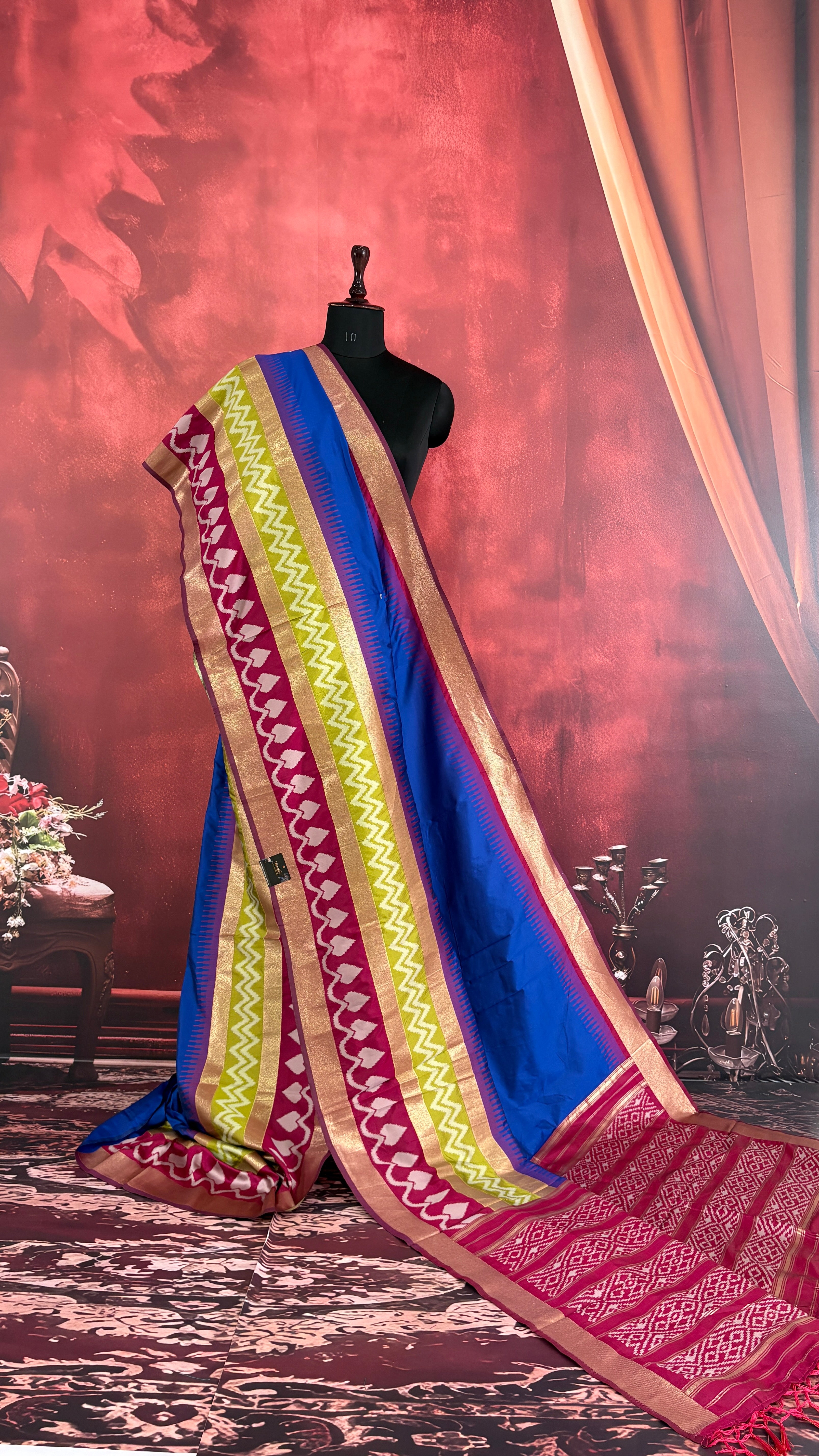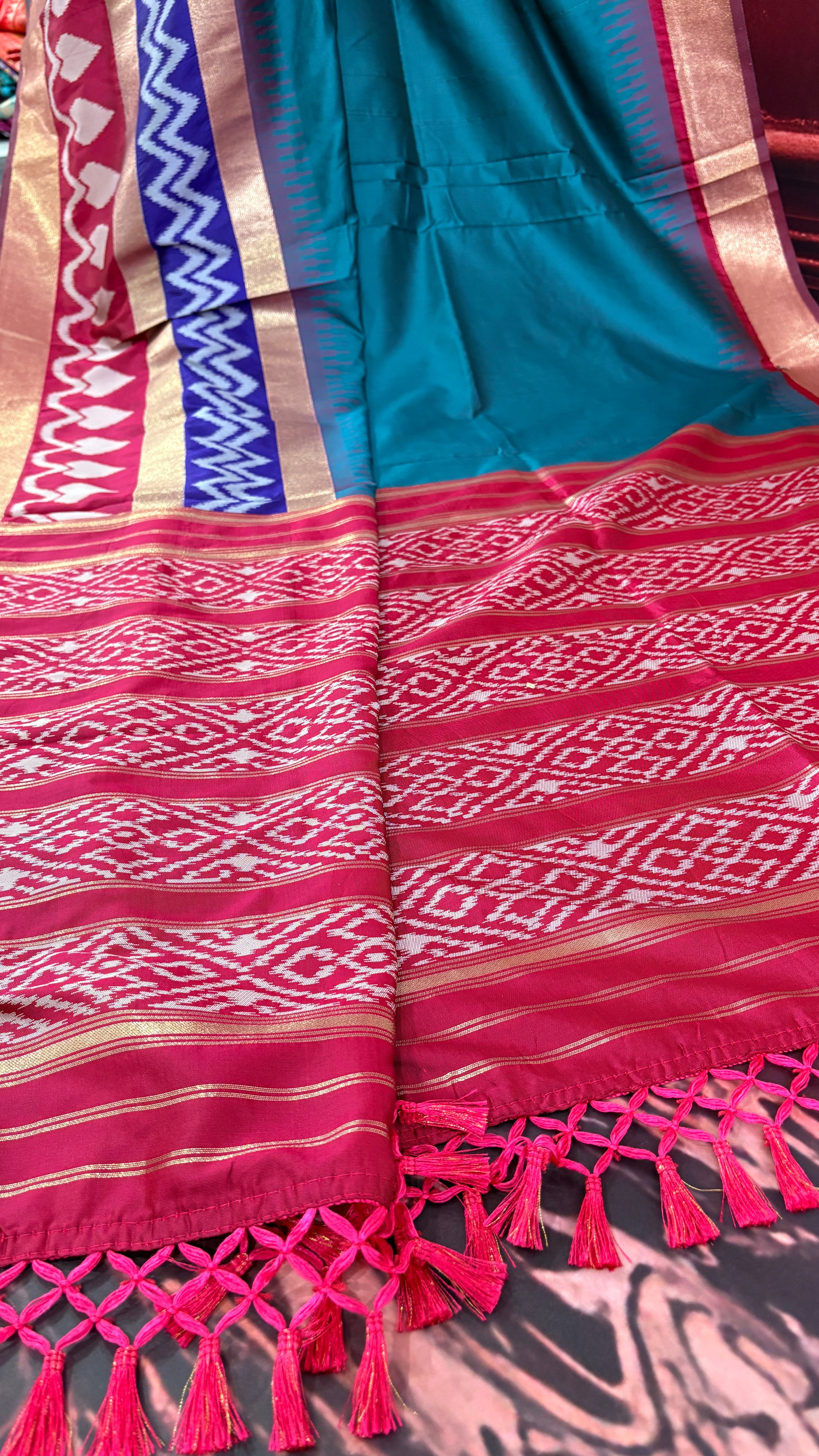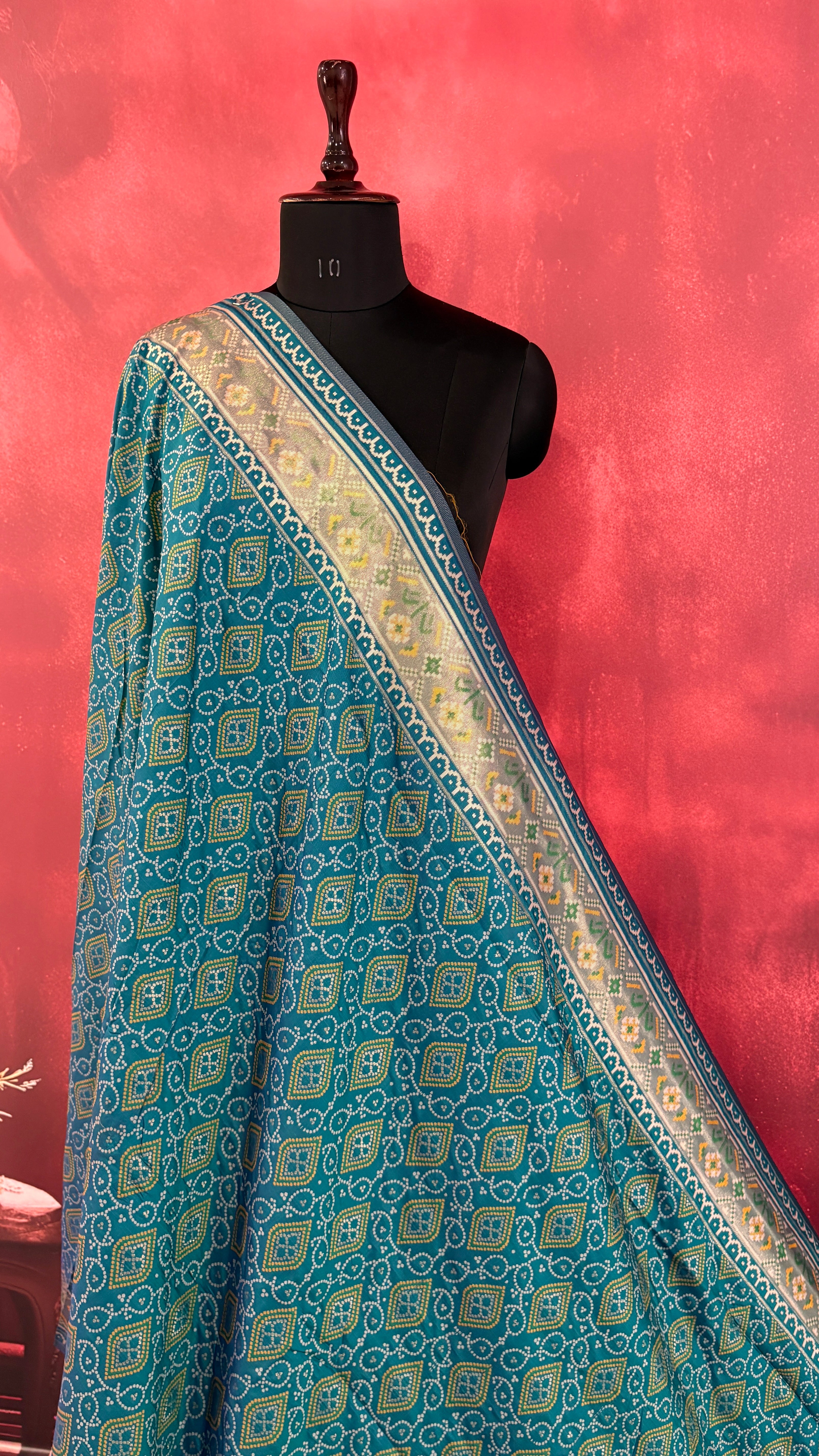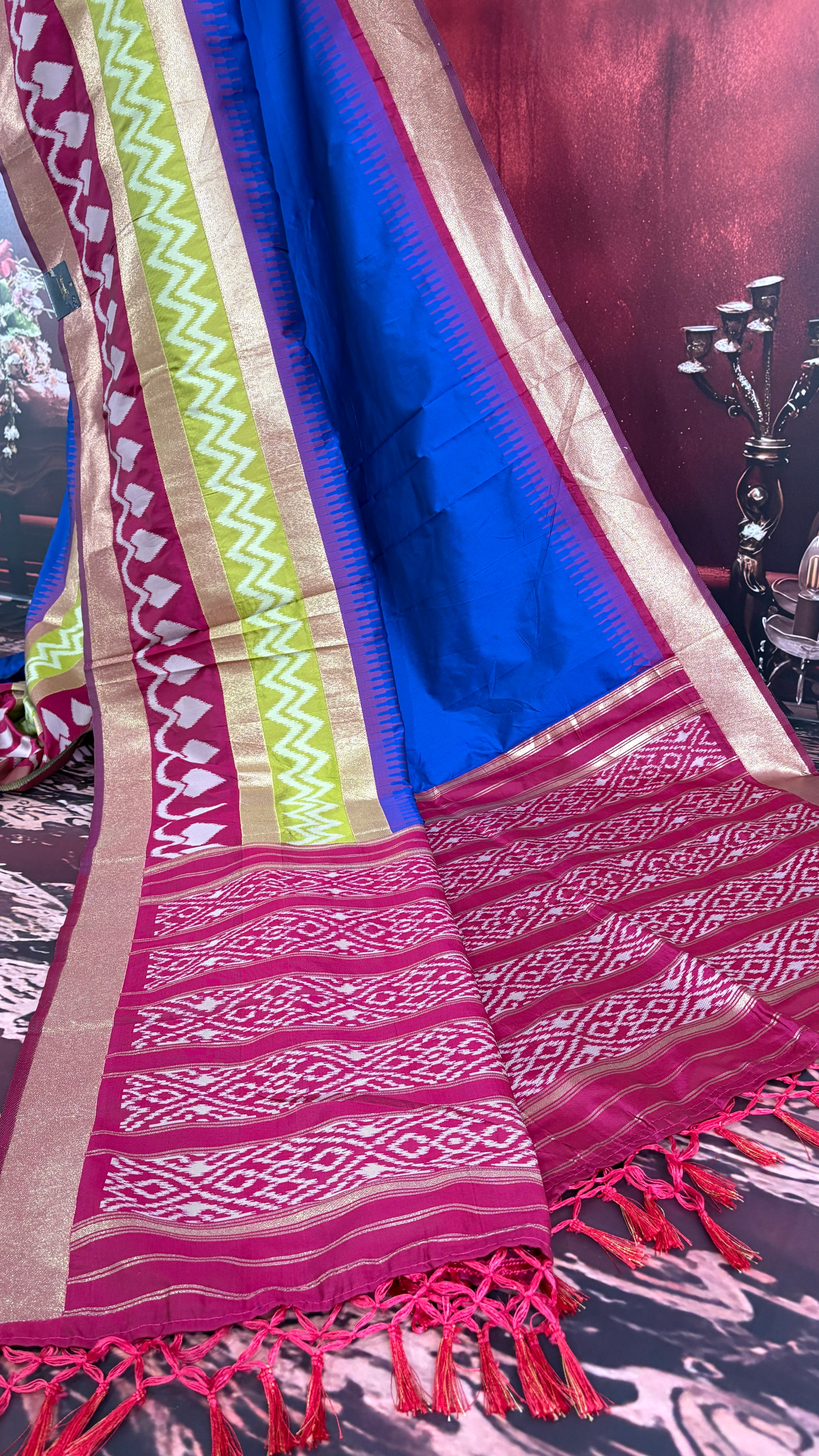 Patola is one of the most prestigious and luxurious handwoven textiles of India, originating from Patan, Gujarat. This exquisite double-ikat weaving technique dates back to the 11th century, once reserved for royalty and aristocrats. Known as the “Queen of Silks,” Patola is admired for its geometric precision, rich colors, and motifs symbolizing prosperity, fertility, and spirituality. What makes Patola unique is the double ikat method – both the warp and weft threads are dyed with exacting precision before weaving, creating identical patterns on both sides of the fabric. This mastery requires months of labor, making each Patola saree a priceless heirloom.