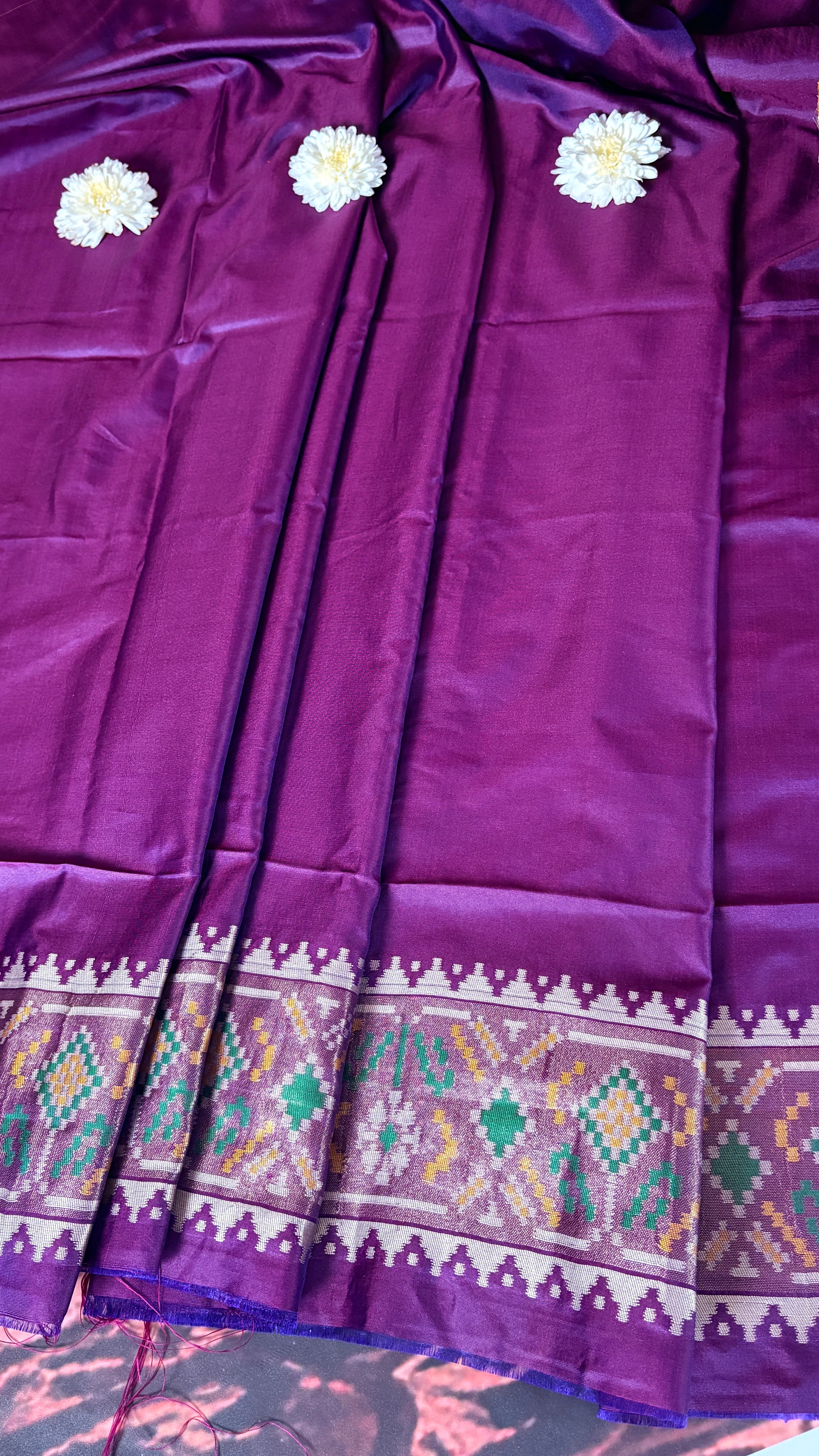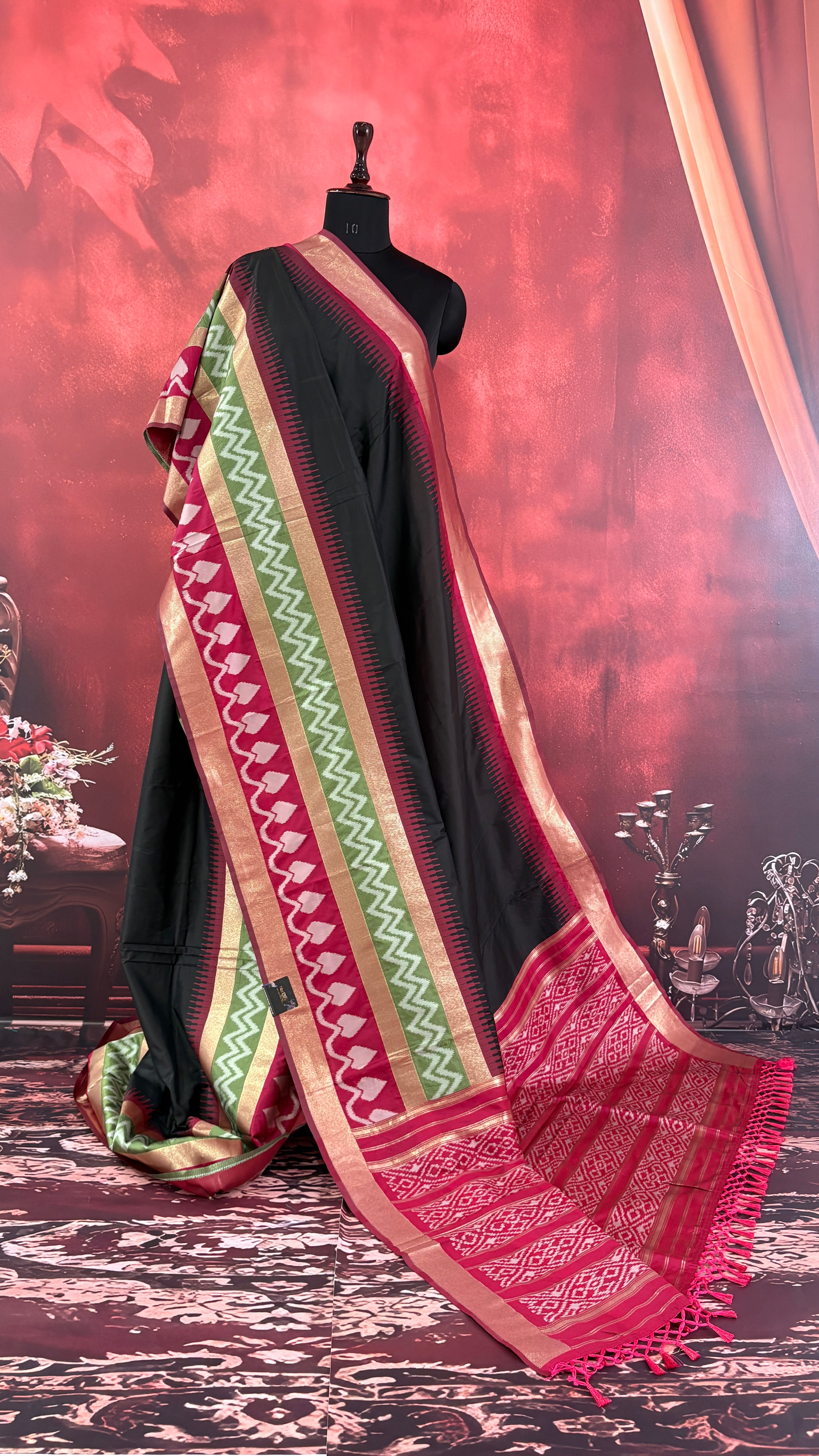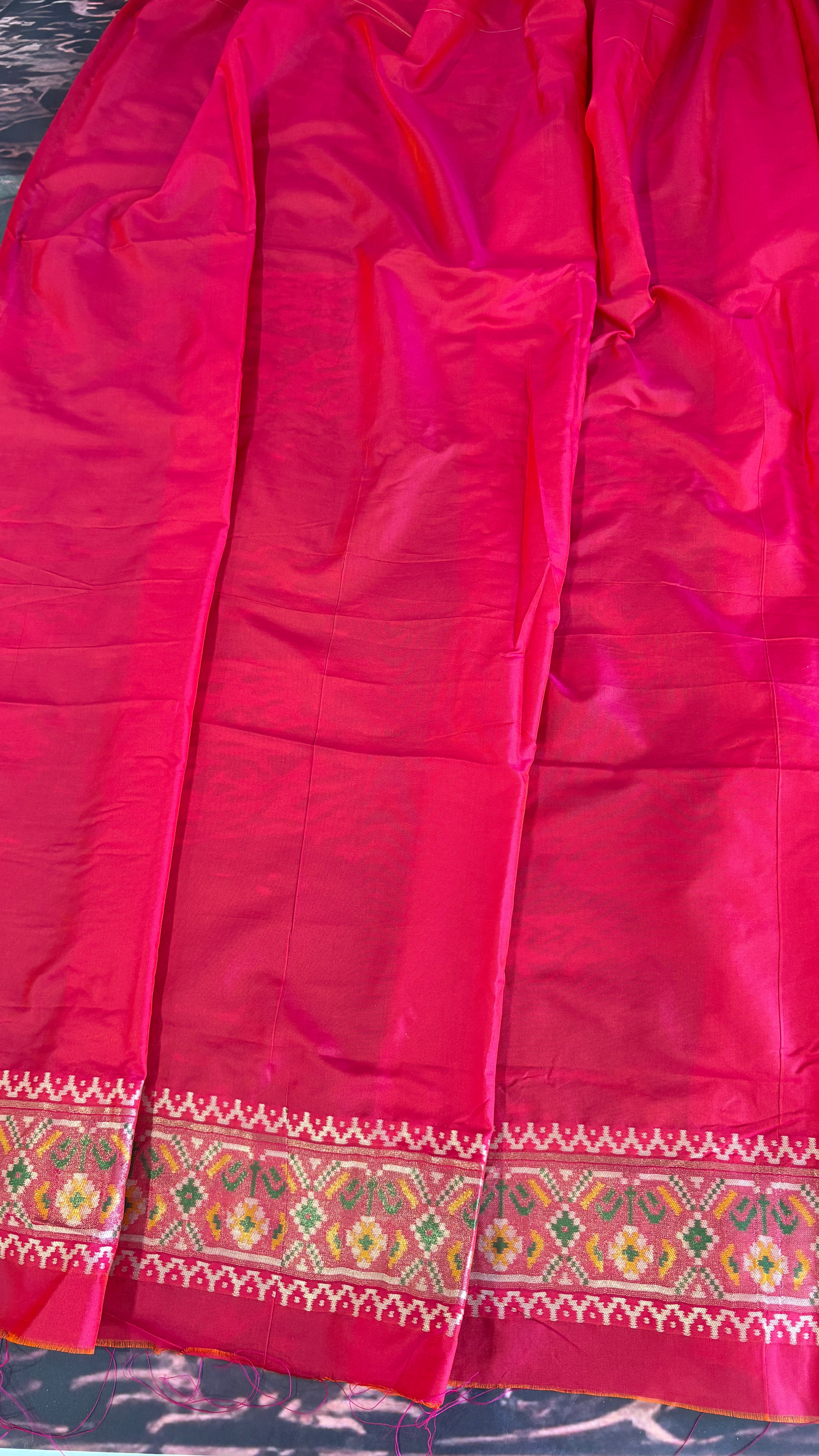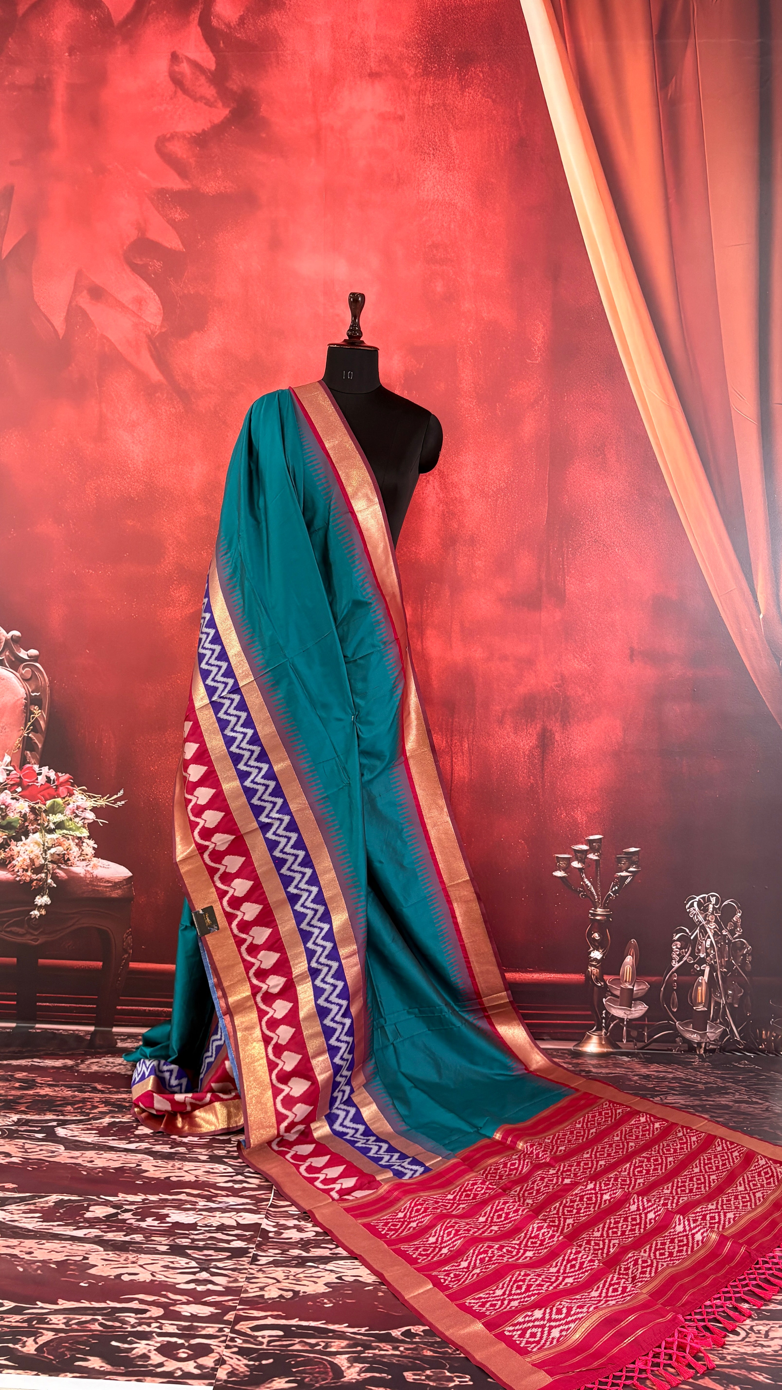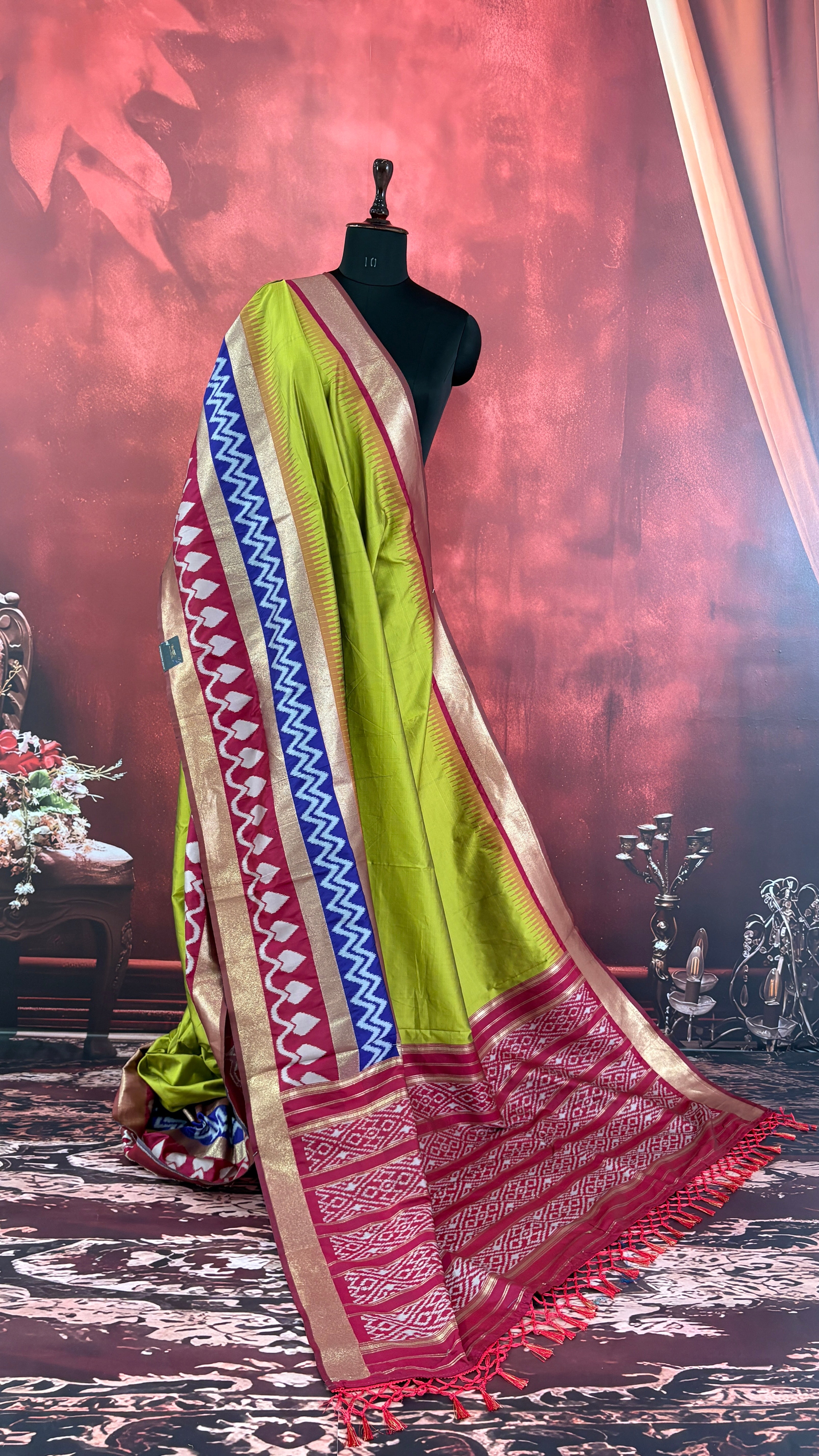 Patola is one of the most prestigious and luxurious handwoven textiles of India, originating from Patan, Gujarat. This exquisite double-ikat weaving technique dates back to the 11th century, once reserved for royalty and aristocrats. Known as the “Queen of Silks,” Patola is admired for its geometric precision, rich colors, and motifs symbolizing prosperity, fertility, and spirituality. What makes Patola unique is the double ikat method – both the warp and weft threads are dyed with exacting precision before weaving, creating identical patterns on both sides of the fabric. This mastery requires months of labor, making each Patola saree a priceless heirloom.