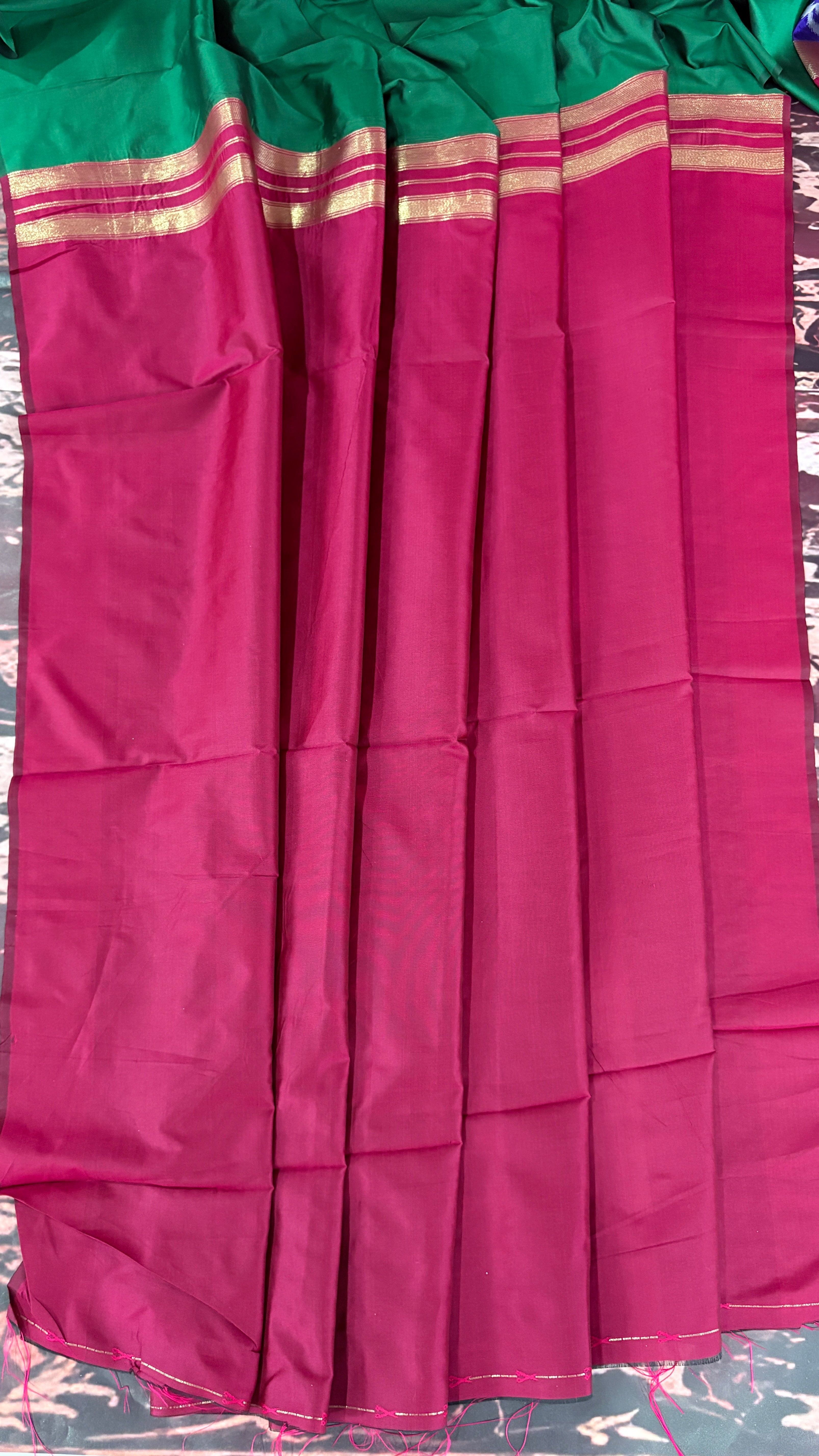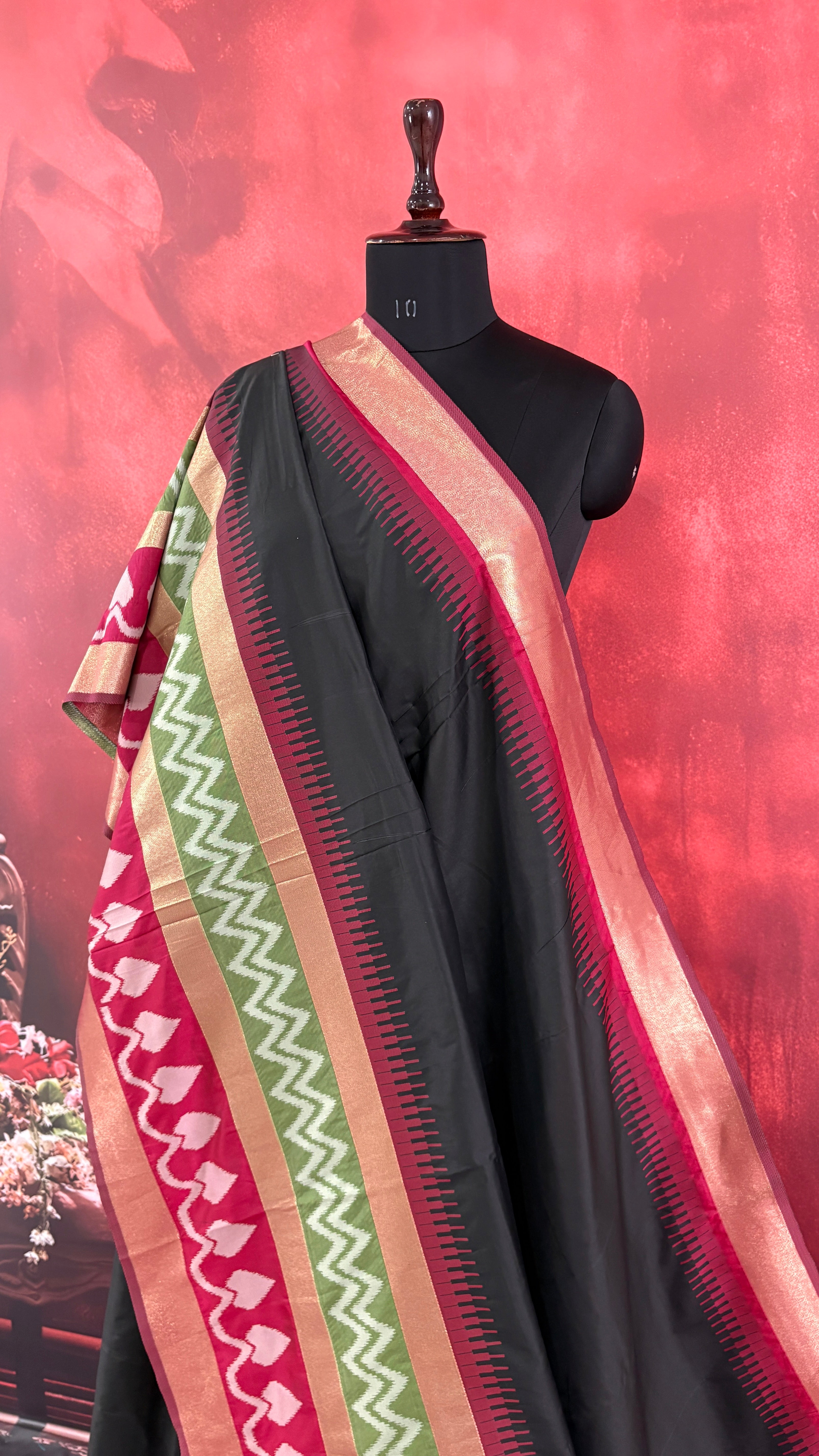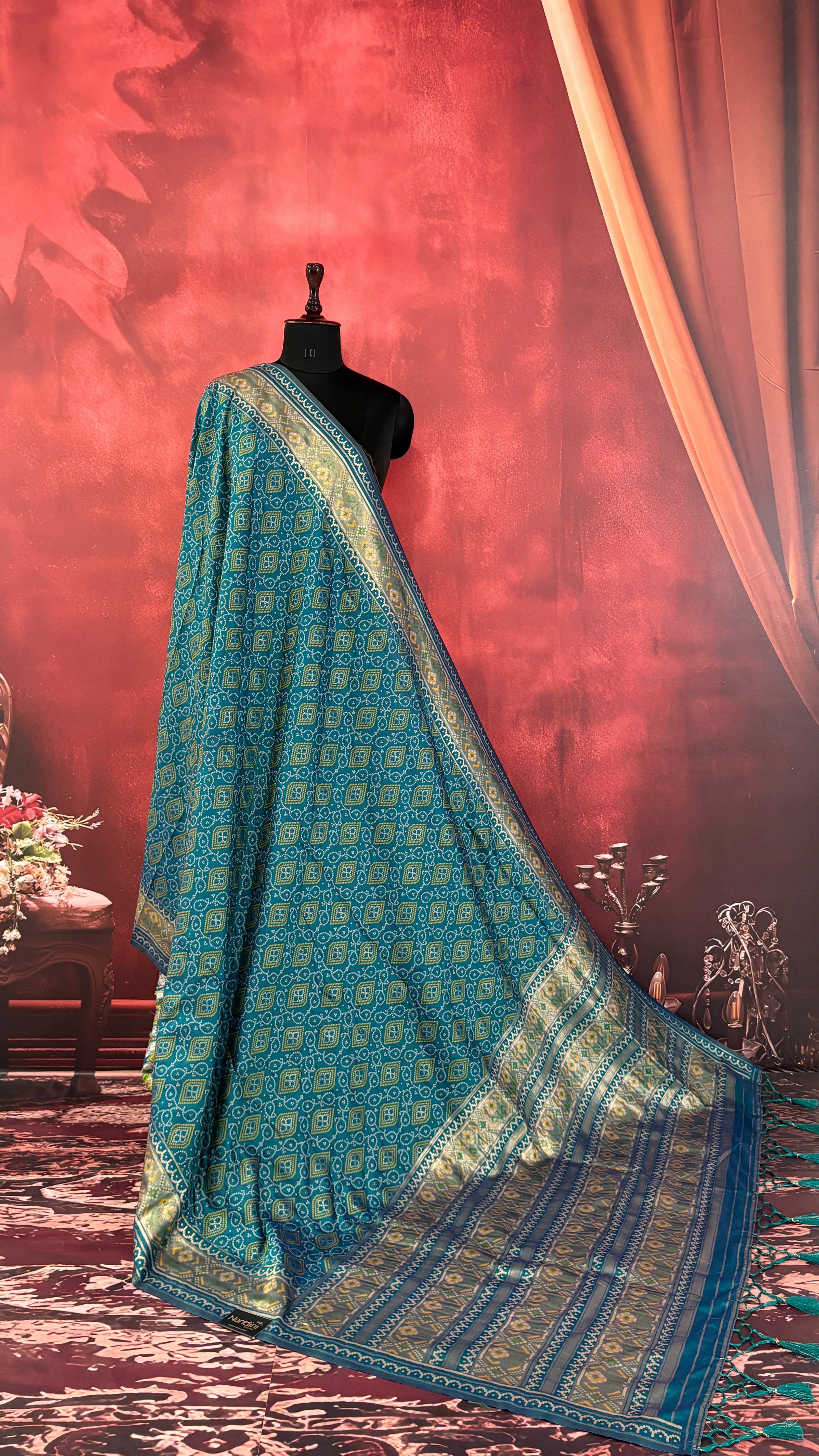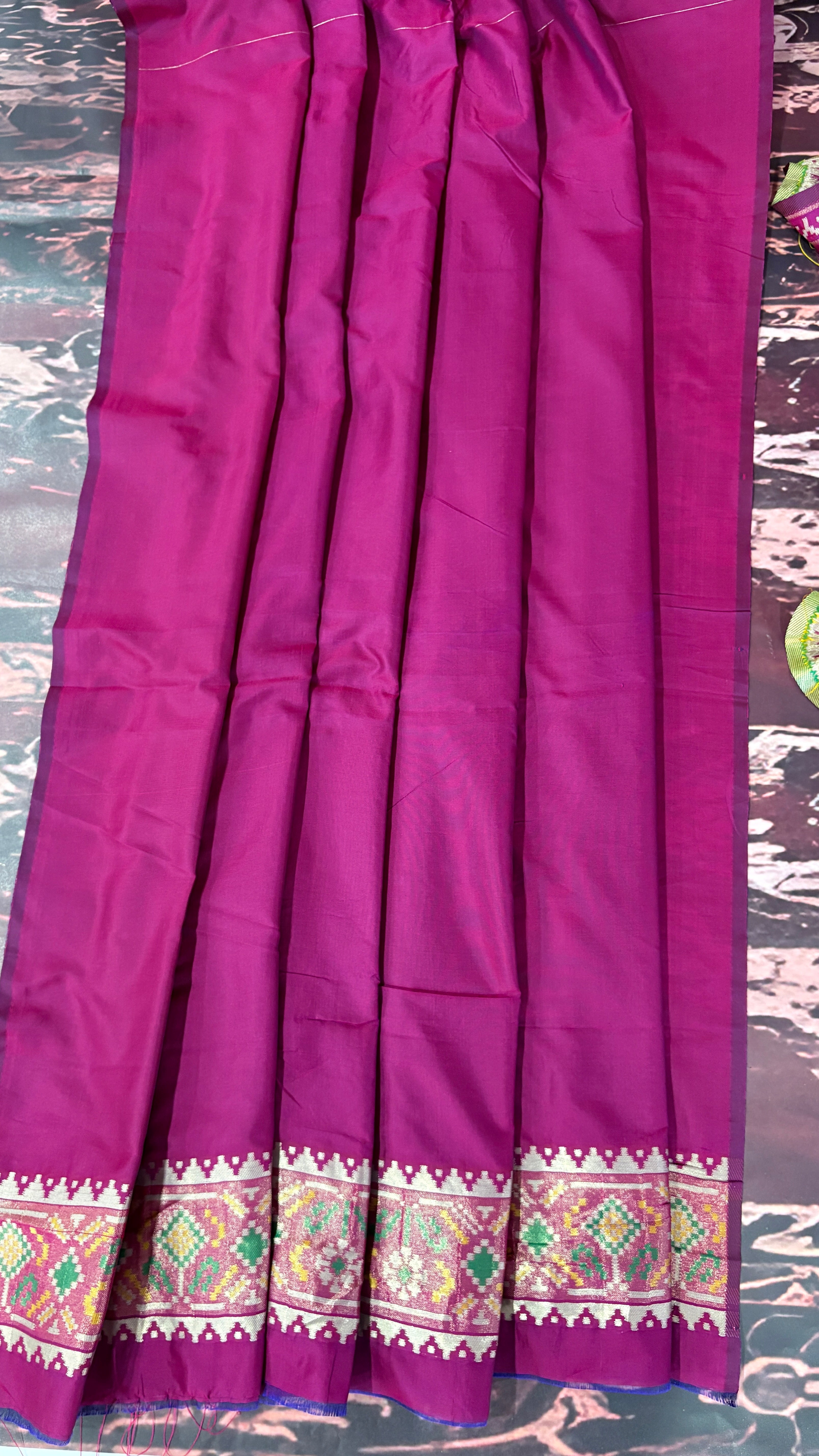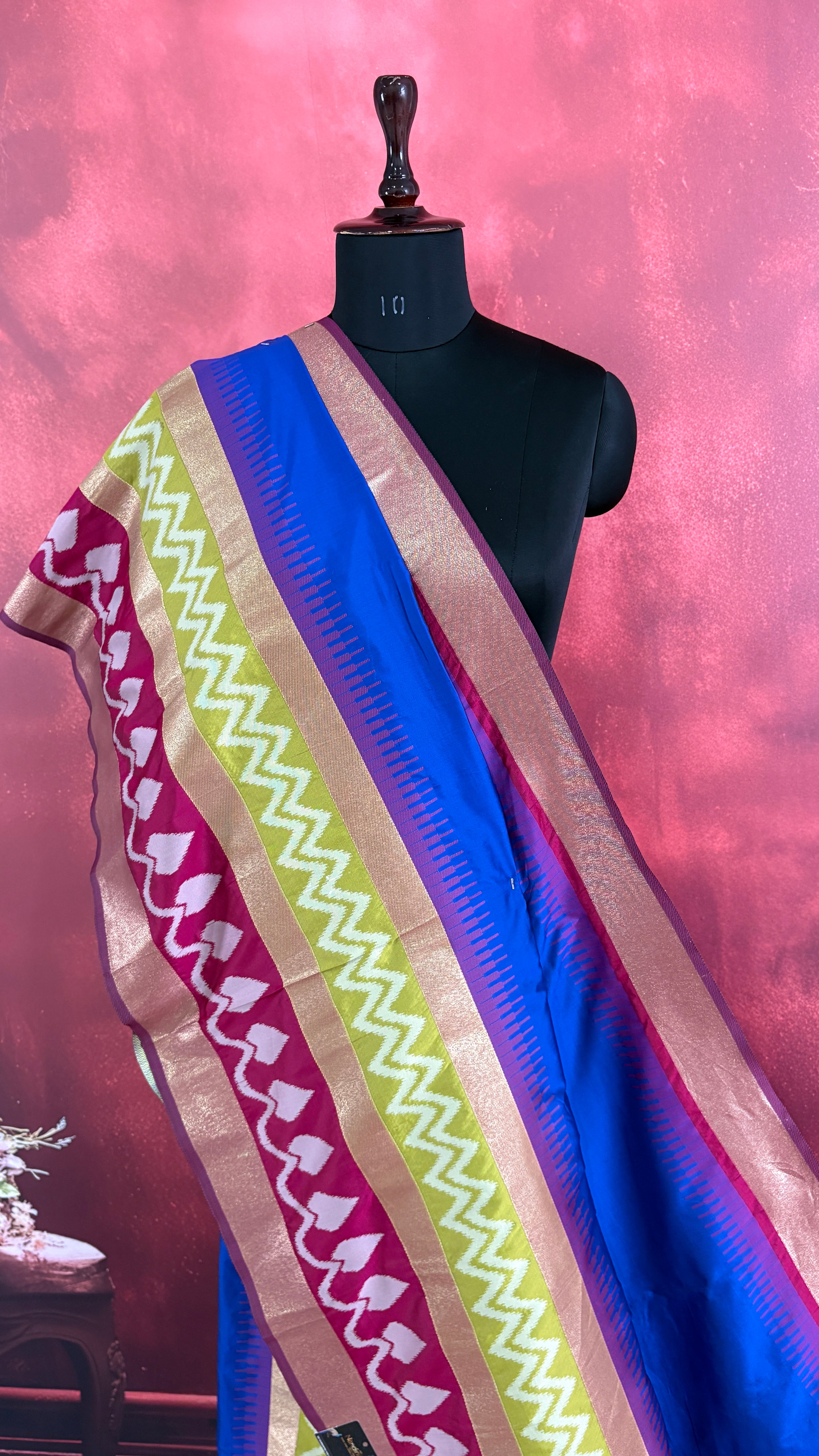 Patola is one of the most prestigious and luxurious handwoven textiles of India, originating from Patan, Gujarat. This exquisite double-ikat weaving technique dates back to the 11th century, once reserved for royalty and aristocrats. Known as the “Queen of Silks,” Patola is admired for its geometric precision, rich colors, and motifs symbolizing prosperity, fertility, and spirituality. What makes Patola unique is the double ikat method – both the warp and weft threads are dyed with exacting precision before weaving, creating identical patterns on both sides of the fabric. This mastery requires months of labor, making each Patola saree a priceless heirloom.